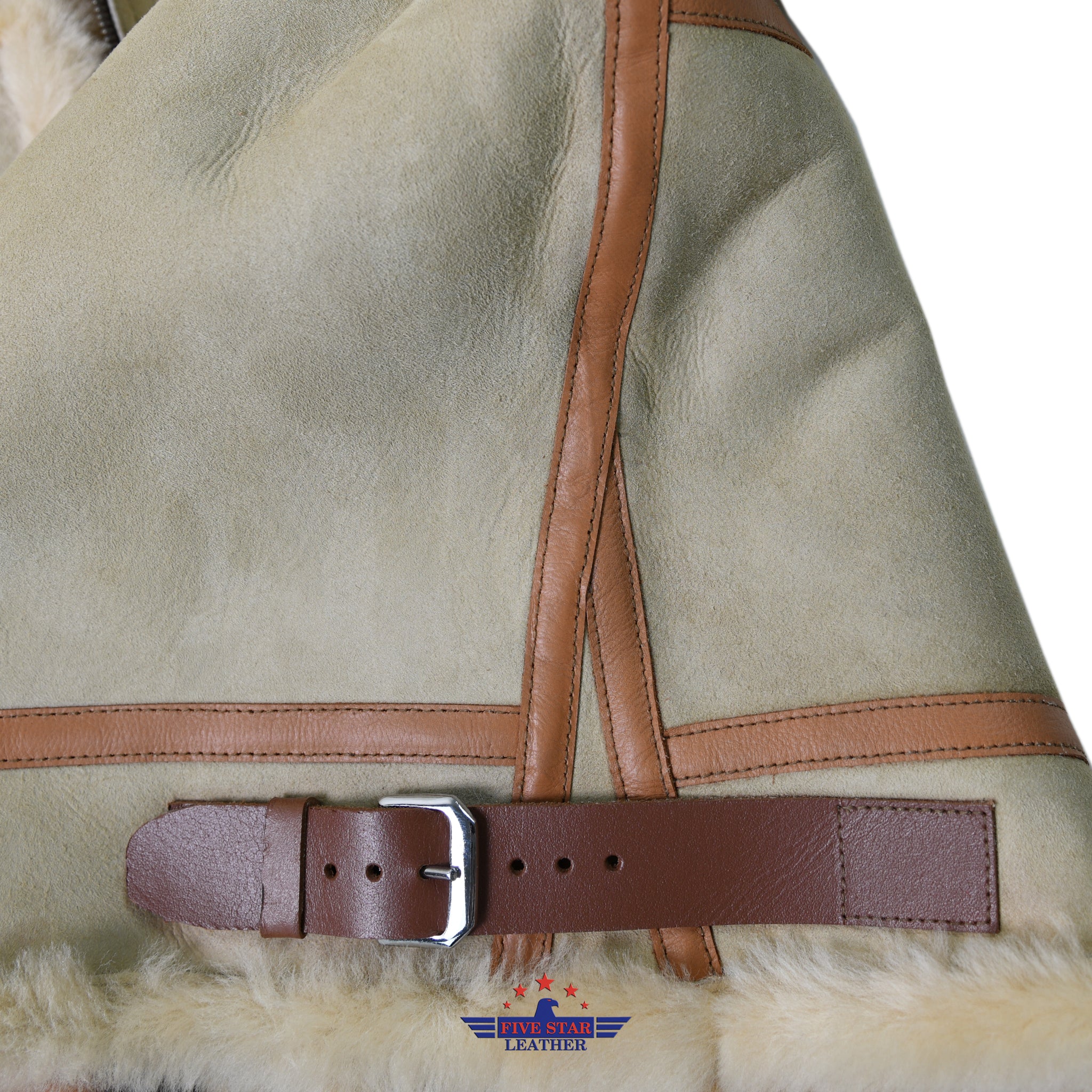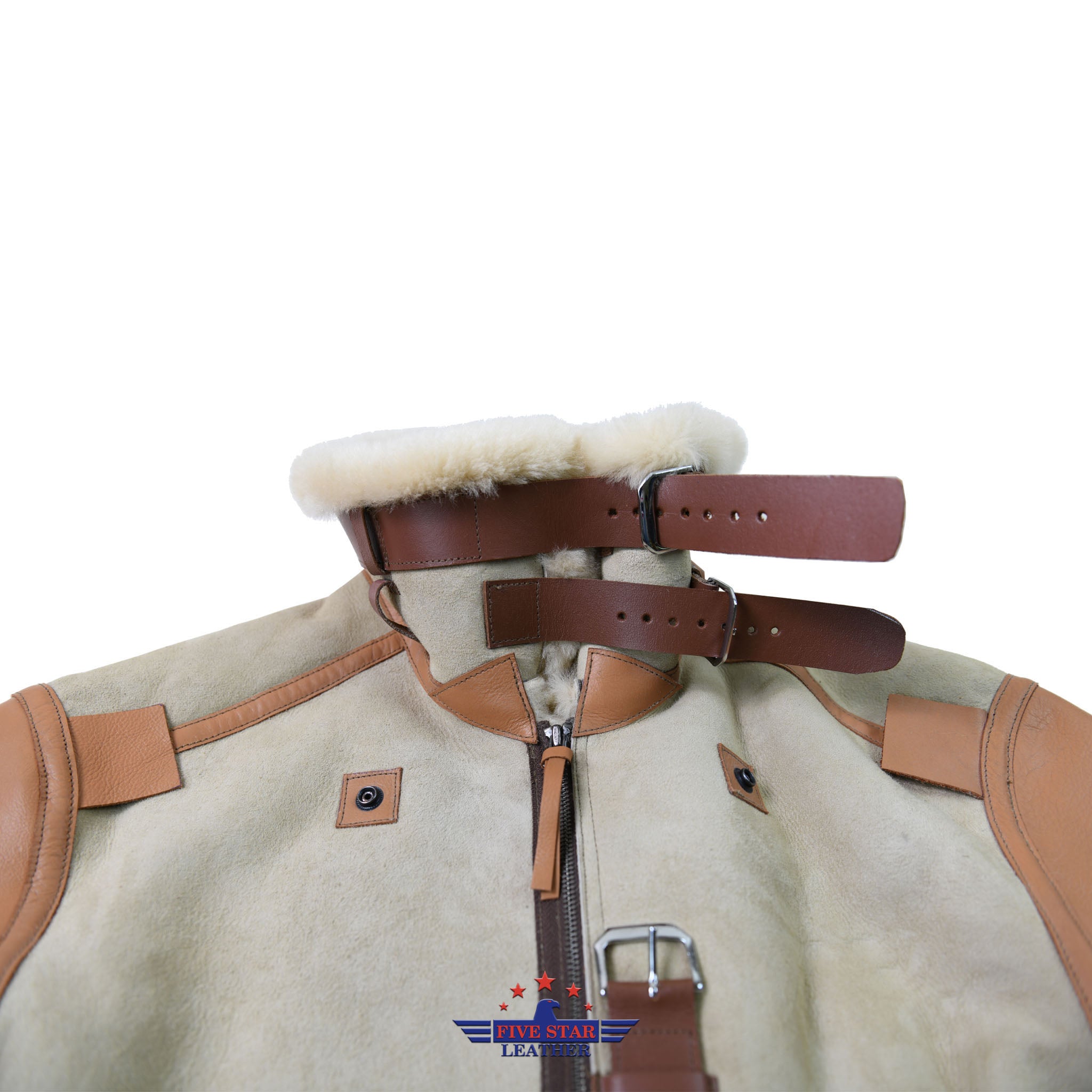 The FiveStar Leather B-3 Flying Jacket is a True reproduction of the 1937 USAAF version, constructed with high-quality sheepskin and reinforced with heavy Visky Brown Horse Hides. The sheepskin is uncoated, while the fleece has a thickness of 20-22mm and is colored to match the original. The leather straps, made from durable cowhide, are secured with vintage Brass buckles in a Nickel finish for an authentic look. A buckle on the left chest keeps the collar in place and a chain hanger loop adds functionality. If you need help with sizing, please don't hesitate to contact us for expert advice. Indulge your senses with the FiveStar Leather B-3 Flying Jacket. This luxurious and intricately crafted jacket is a faithful reproduction of the 1937 USAAF version, made with high-quality sheepskin and reinforced with heavy Visky Brown Horse Hides. The uncoated sheepskin and plush fleece, with a thickness of 20-22mm, exudes elegance and sophistication. The authentic details, including vintage Brass buckles and a chain hanger loop, elevate the jacket to the level of a work of art. For expert advice and assistance with sizing, please don't hesitate to contact us.