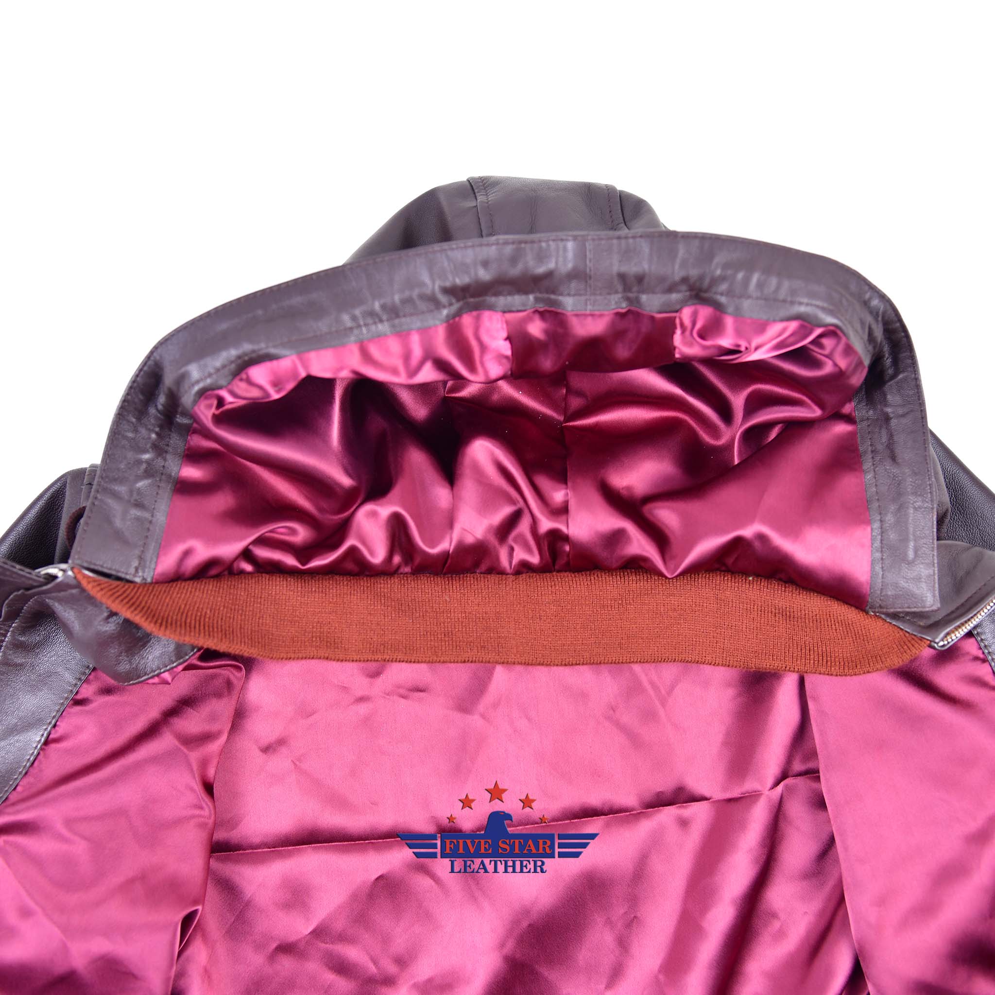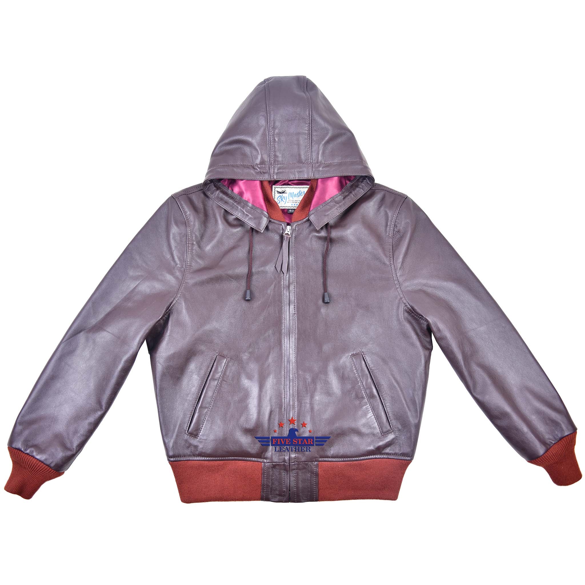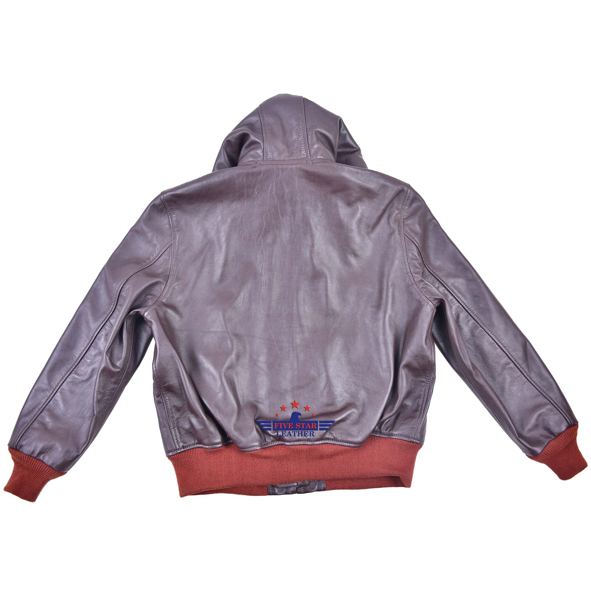 The jacket features an outer shell made from Capeskin Seal Brown leather, measuring 0.7 to 0.8mm thick. Inside, it is lined with wine red satin for added comfort. The front is equipped with Talon repro zippers, and the hood can be adjusted with drawstrings. This style is offered in various colors and leather options to suit your preferences.