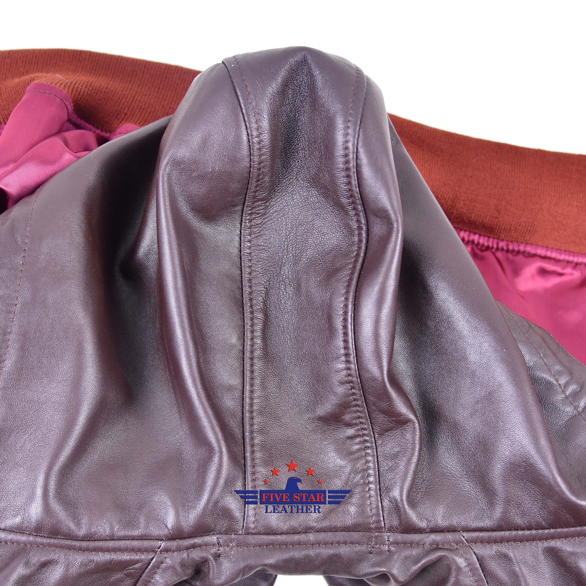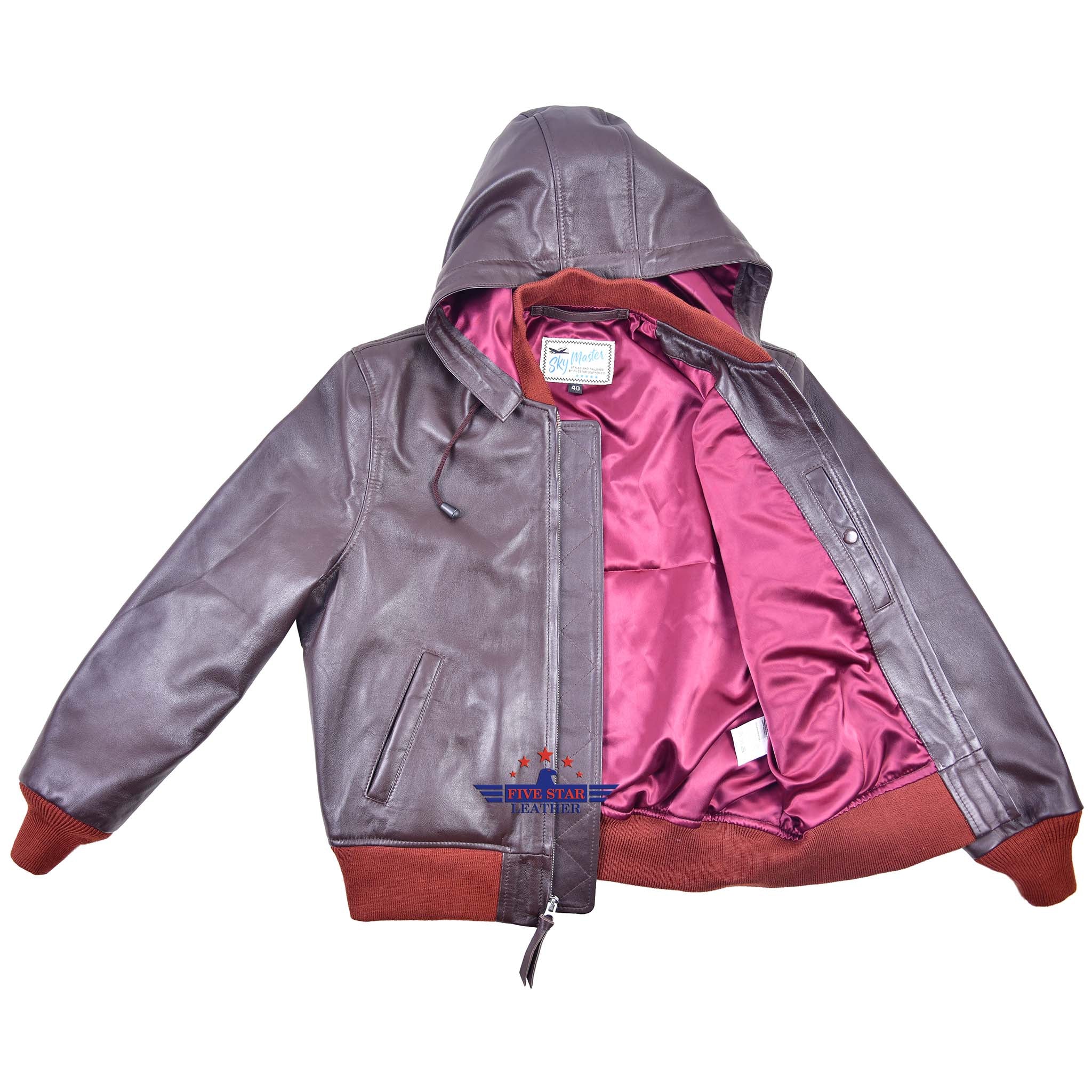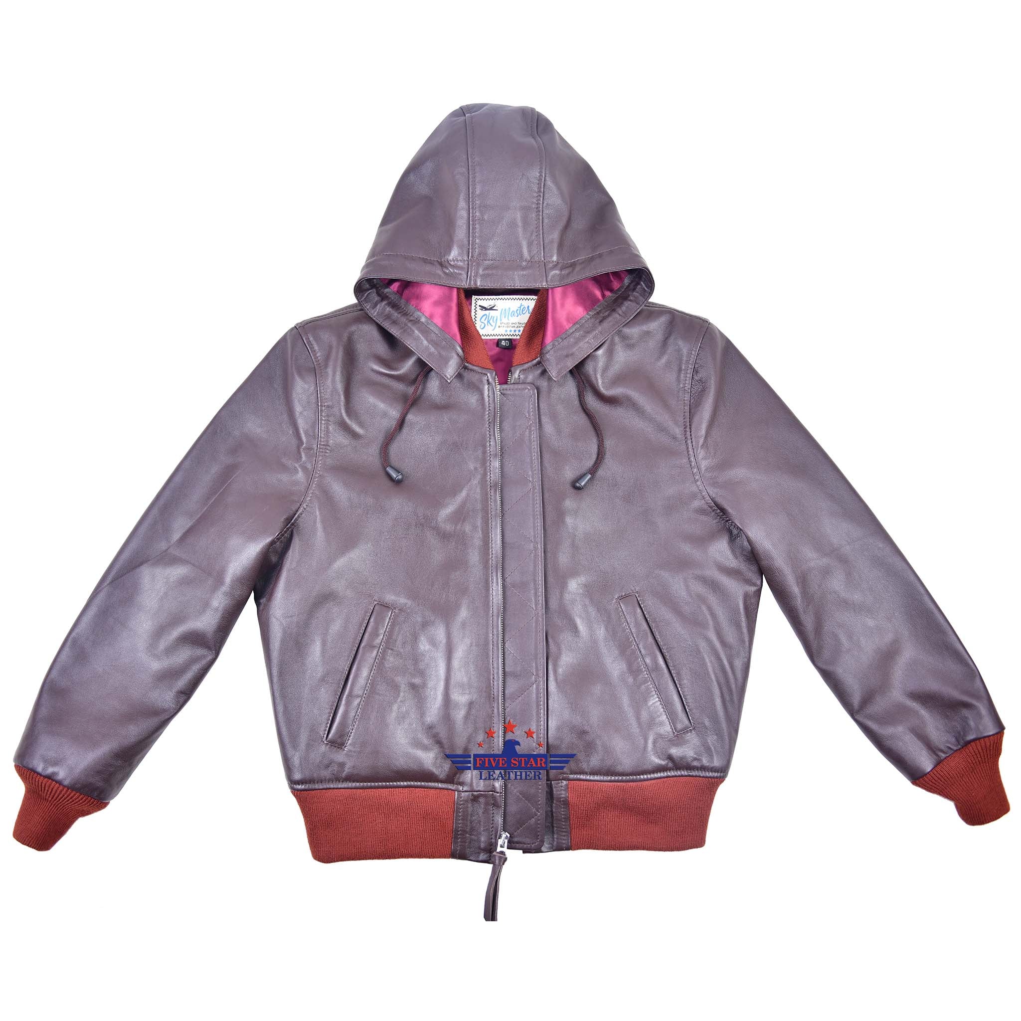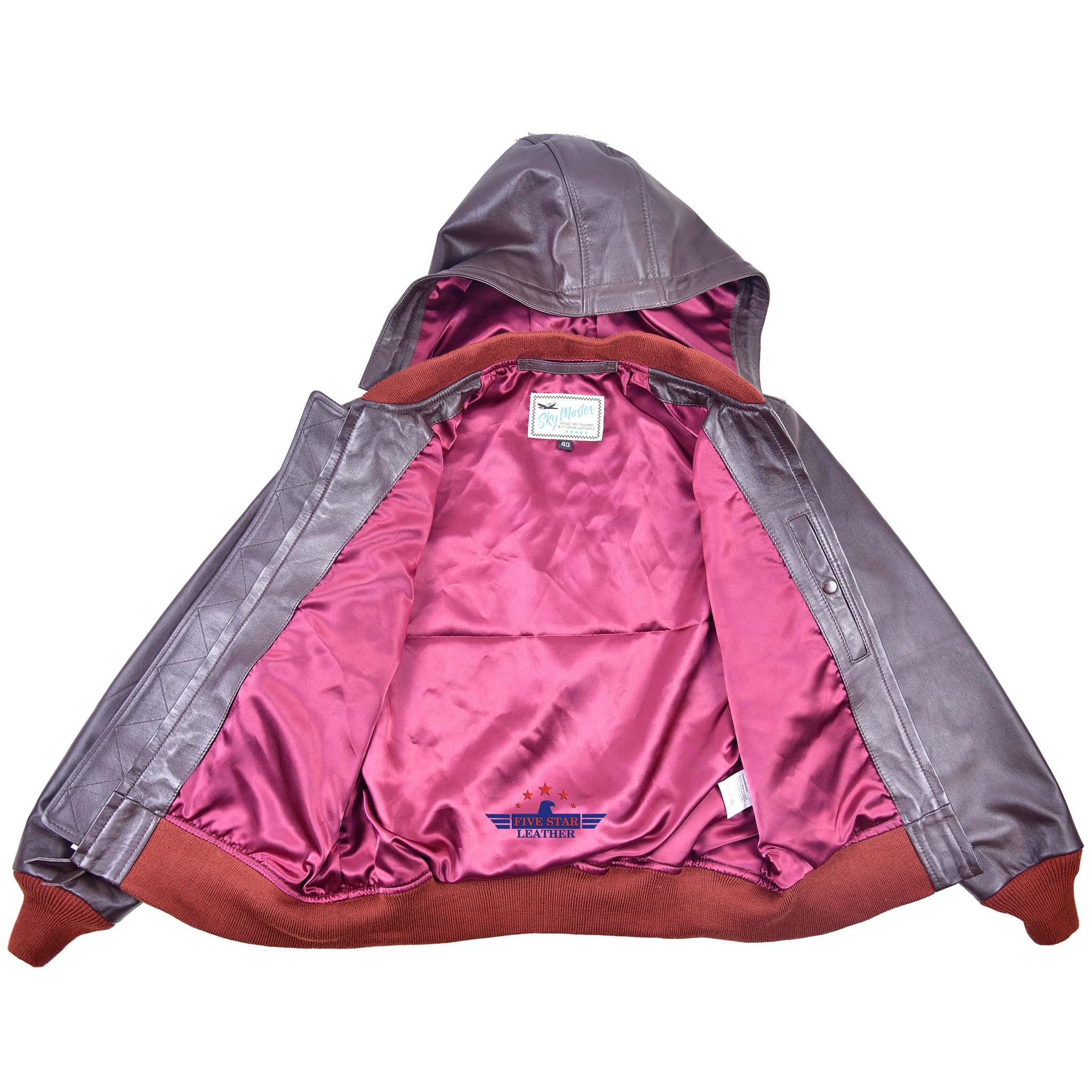 The jacket features an outer shell made from Capeskin Seal Brown leather, measuring 0.7 to 0.8mm thick. Inside, it is lined with wine red satin for added comfort. The front is equipped with Talon repro zippers, and the hood can be adjusted with drawstrings. This style is offered in various colors and leather options to suit your preferences.