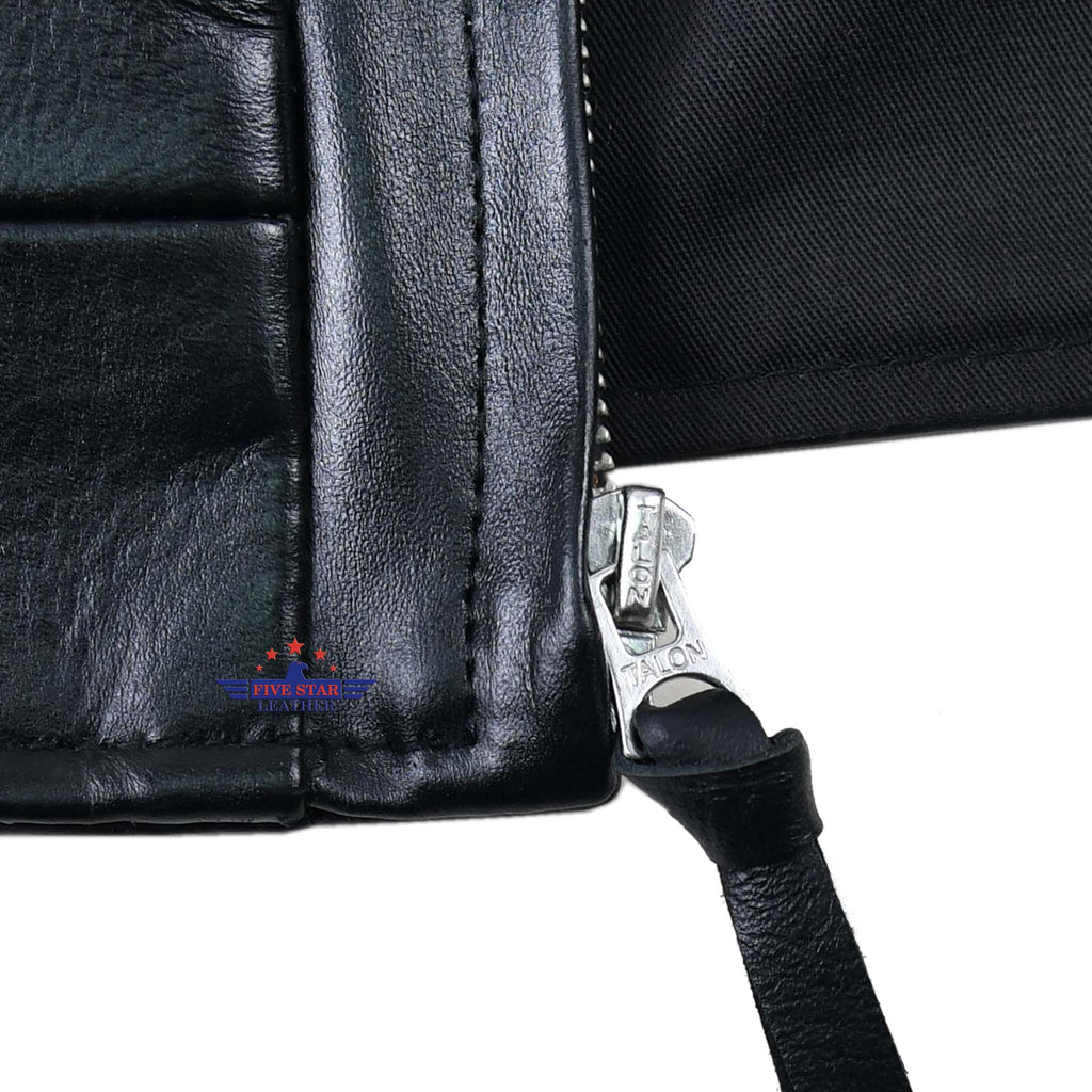 This FiveStar Leather 1930s Grizzly Jacket is crafted from top-quality horse hide leather in a sleek black color. Its standout feature is the blonde mouton fur collar and front and back sheepskin panels. The front Talon zipper closure and high-quality 100% cotton lining make it both stylish and comfortable. This jacket also boasts Nickle brass buckles and hardware, adding to its durability and unique design. Custom sizes are available for the perfect fit. Inspired by a vintage combination, this jacket is truly one-of-a-kind.