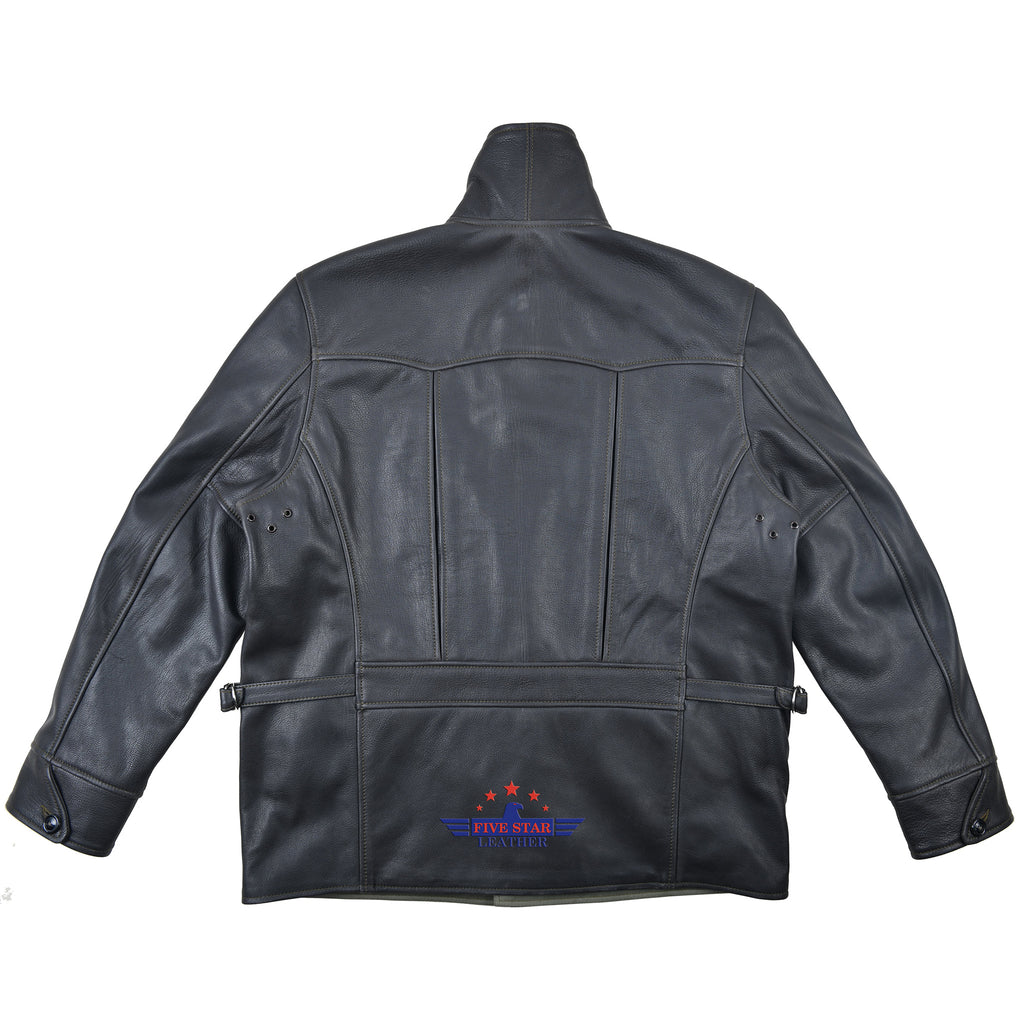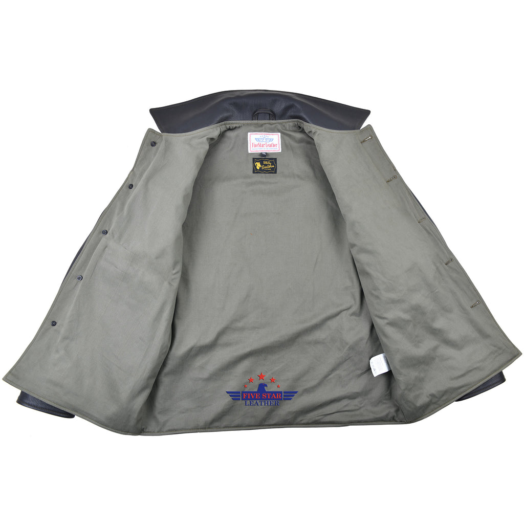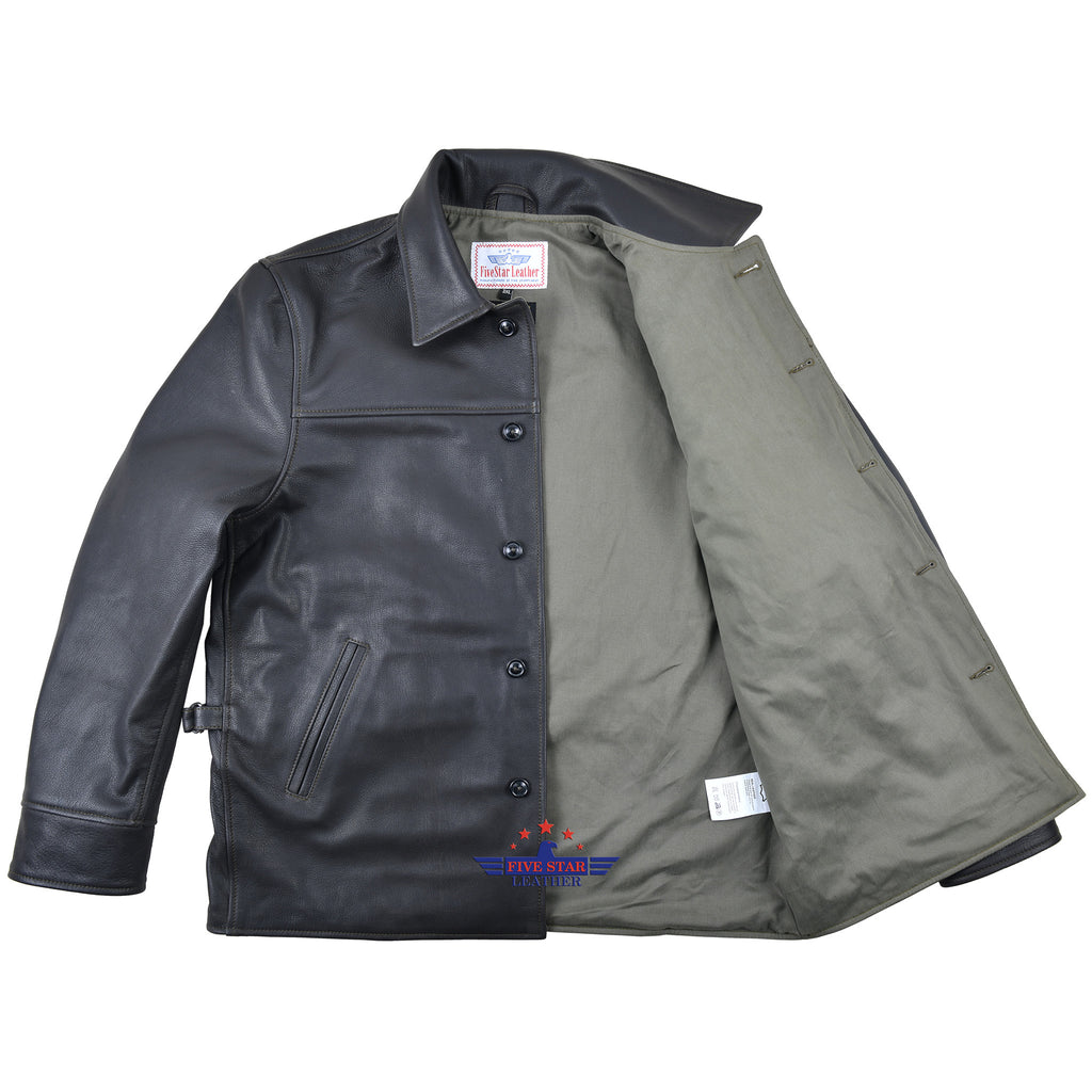 Expertly crafted from genuine high-quality goatskin leather, the FiveStar Leather 1950's Work Jacket boasts a traditional front enclosure with durable horn buttons, as well as stylish nickel brass side D adjusters. The jacket features a premium olive cotton twill lining and two convenient side entry pockets, with an olive contrast thread for added detail.