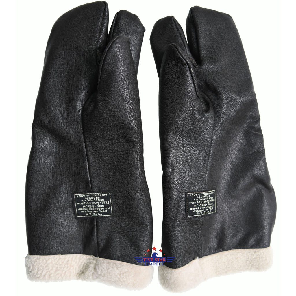 Experience luxury with our FiveStar Leather Type A-9 Flying Winter Mitten Gloves. Each pair is meticulously reproduced based on the original design of Perry Sportswear Inc.'s Dwg. No. 34D3414 A.C. Order No. 4219308P. Made from 100% Veg Tanned Mid Brown Goatskin Leather, our gloves are crafted with the finest materials to ensure superiority. We've even included a trigger finger, just like the genuine vintage WWII cold weather Sheepskin flight mittens. Our careful attention to detail is evident in the supple brown finished leather and excellent stitching, which replicates the pattern of a real pair. For added softness and warmth, we've exclusively chosen the Short Lushest Curly Bright Sheepskin lining, mirroring the real example. Even the label is a perfect replica in terms of size, color, and font. Elevate your winter wardrobe with our premium Repro Type A-9 Flying Winter Mitten Gloves.