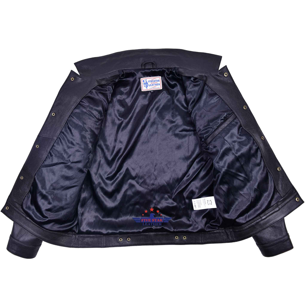 This premium-grade leather jacket is crafted from genuine, high-quality goatskin for durability and style. It features two flap chest pockets, two side pockets, and a front button closure. Inside, you'll find a lined pocket for added convenience. The dark brown jacket includes a comfortable cotton lining and meticulous stitching. Available in all sizes, with a variety of styles and colors ready for you to choose from.