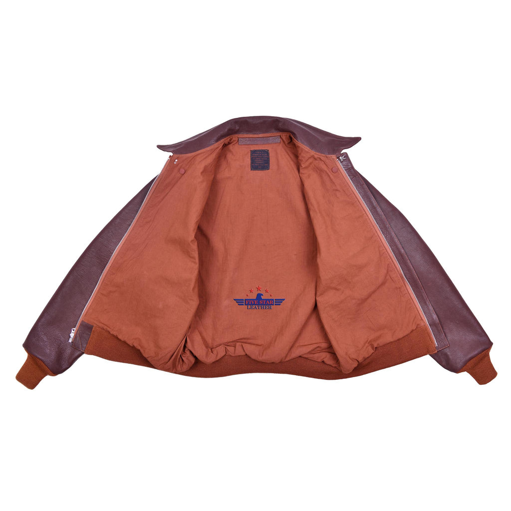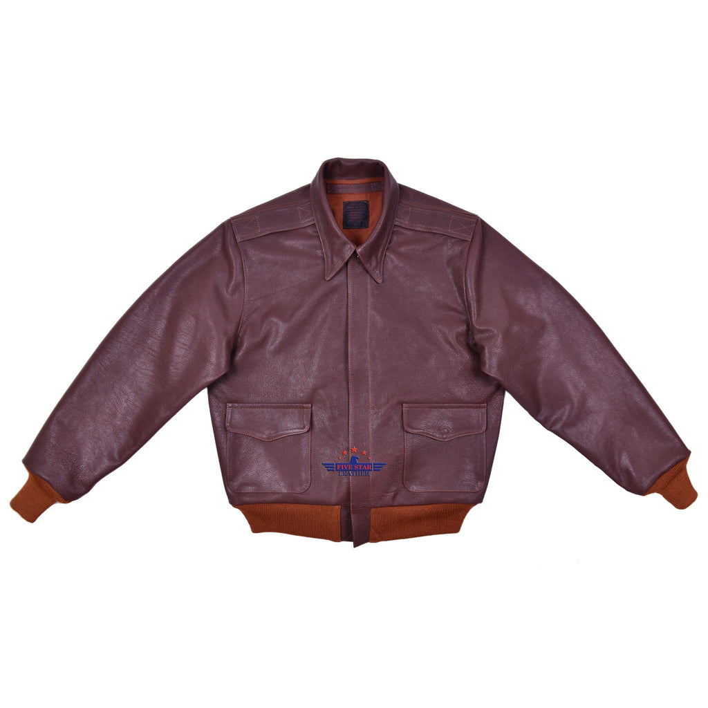 The FiveStar Leather Repro Dubow A2 Leather Flight Jacket features our special Russet Brown Goatskin Veg-Tanned Leather, staying true to the original color. It includes 100% real wool knitwear in Russet Brown, made in the USA, along with a reproduction Talon zipper and 100% cotton lining matching the authentic color. This A2 jacket faithfully replicates the original pattern details from J. A. Dubow Mfg. Co., Drawing No. 30-1415, Order No. W535 AC 27798.