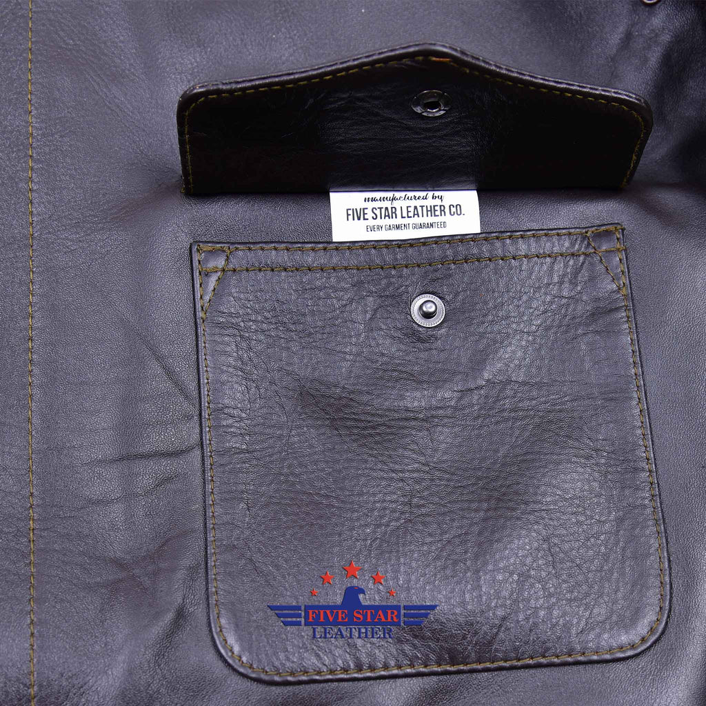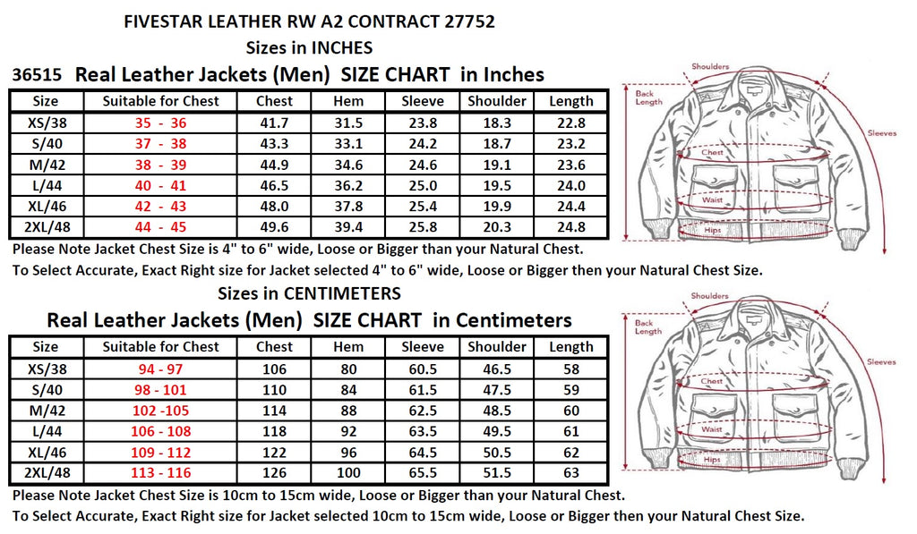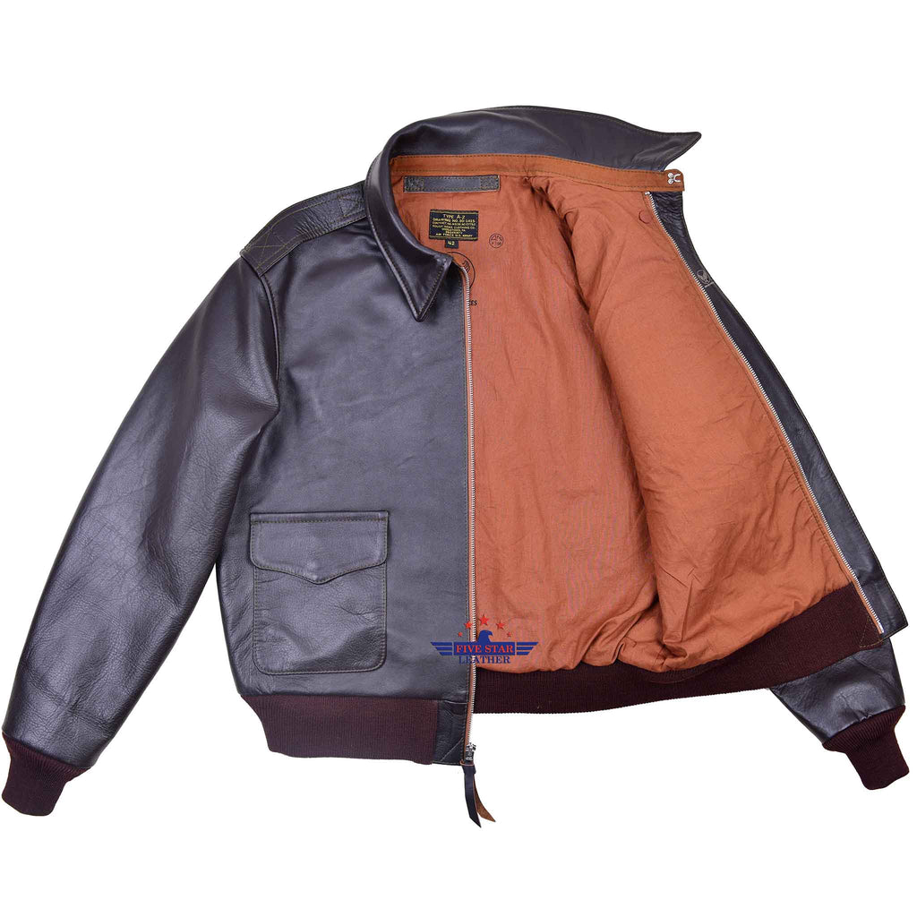 FiveStar Leather Reproduced Rough Wear Clothing Co. Middletown, PA. A2 Leather Flight Jacket made from our Special Seal Brown Horsehide Leather, This Leather is Semi Veg. Tanned and True to Original Color, We use 100% Real wool Knitting's In Dull Purple color made in USA in this jacket, however other knitting colors in Wool are also available, Repro Talon Front Zipper Fastening, 100% Cotton lining true to original Color of this Contract, and this A2 Jacket have the true and Authentic Pattern Details of TYPE A-2 ROUGH WEAR CLOTHING CO. DRAWING NO. 30-1415, CONTRACT NO.W535 AC-27752