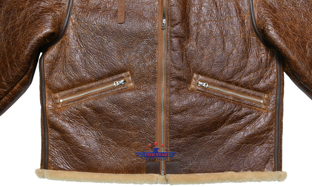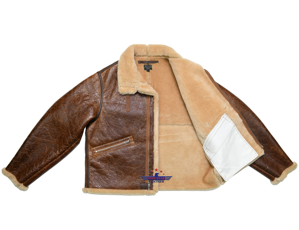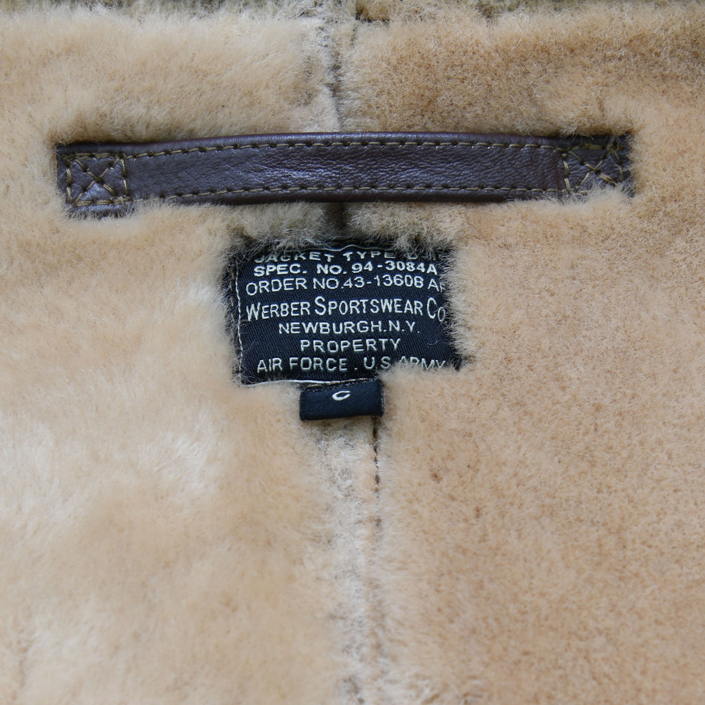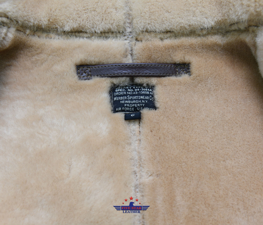 Repro USAAF TYPE D1 very Rare from 1943 WERBER SPORTSWEAR CO. ORDER NO. 43-13608 AF SPEC. NO. 94-3084A Mechanics Shearling Jacket, Sheepskin of this jacket is specially made according to the original jacket, its outer color and inner fleece color is exactly matched with the original, Its Fleece length is almost 0.8-0.9mm very soft fleece. Leather Trim is Horse Hide Russet Brown. This jacket Have Front Repro Talon Zipper No. 5, This jacket have two side pockets enclosed with Talon zippers. This is very Rare Contract and its main difference from the others which is very unique is its size Label spelled as A,B,C,D instead of S,M,L,XL, Its main label and size label is also best matched with the original label. This jacket Originally intended for use by USAAF ground crew personnel.