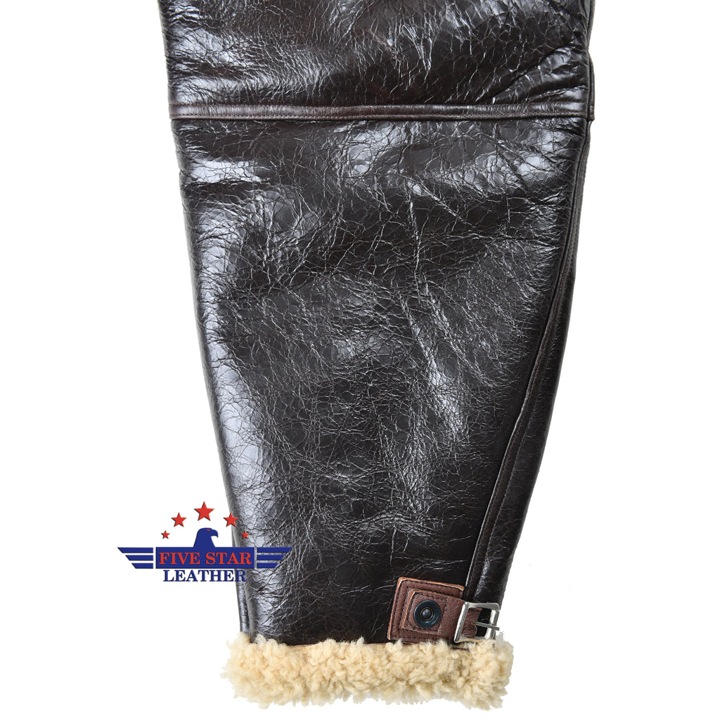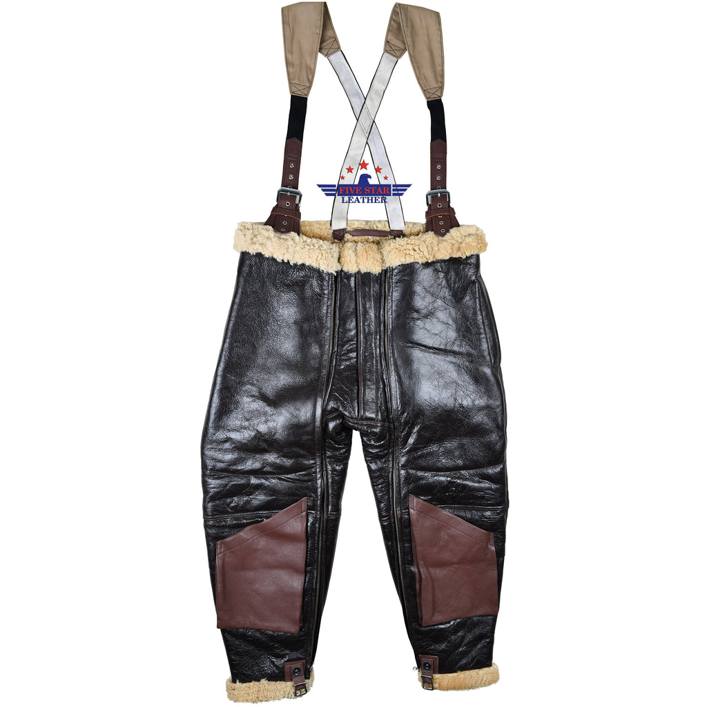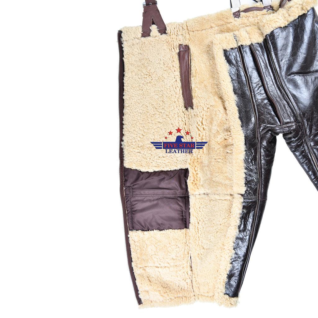 FiveStar Leather Repro Winter U.S. NAVY M-446 Monarch Mfg. Company Contract NOS. 87667 Flying Trouser's, made from High Quality DTM Color Sheepskin outer shell Seal Brown with proper inside fleece color and fleece thickness as 22mm, Have the Long Zippers fastening, and the original Design High quality Brass buckles with Nickle color outside finish. Adjustable Straps for better Comfortable fit. These Trousers are compatible with the M445A flight jackets worn by gunners, Radio Operators and other Personnel. These Trousers are normally available in sizes 36 - 46 , and can only be made on custom request, and for these trousers Orders we have no return policy.
