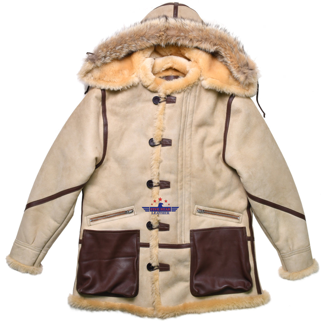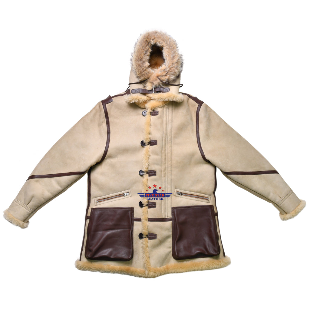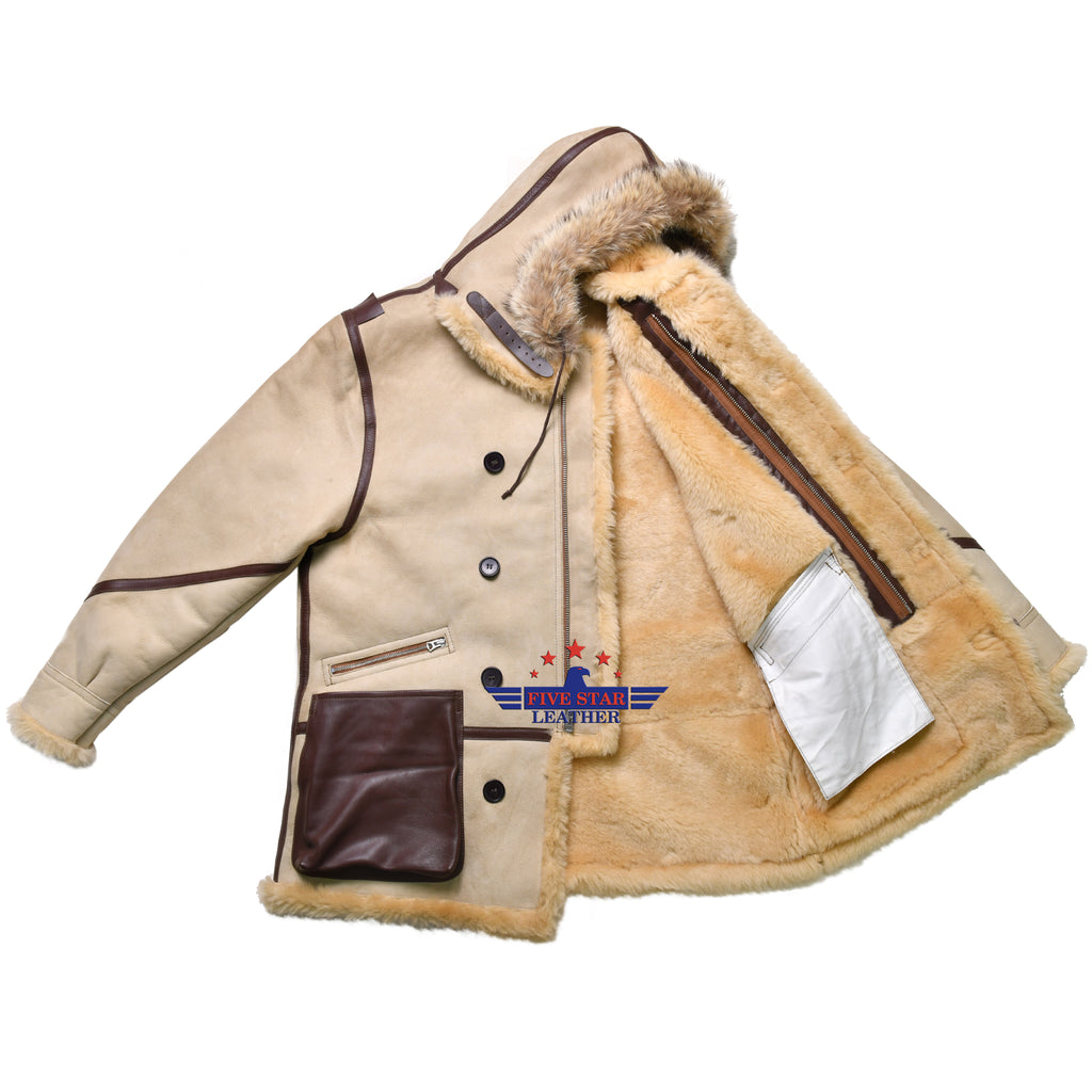 Our FiveStar Leather Repro WWII USAAF Type B-7 Parka, SPEC. NO. 3120 ORDER NO. 42-1000-P, is crafted using premium sheepskin for a faithful reproduction of the original design. From the fleece color to the outer sheepskin color, we have ensured accurate replication of every detail. The horsehide leather used is semi-vegetable tanned in mid-brown, matching the original parka's color. We have meticulously copied the patterns from an original jacket, and our Repro Talon zipper fastening adds to the authenticity. The real longer length fur used for the hood completes the faithful reproduction of this essential garment originally designed for flight crews and ground personnel during World War II. Our Type B-7 Parka offers all the details of the original at a very reasonable price, making us proud to offer such a high level of authenticity in the market.
