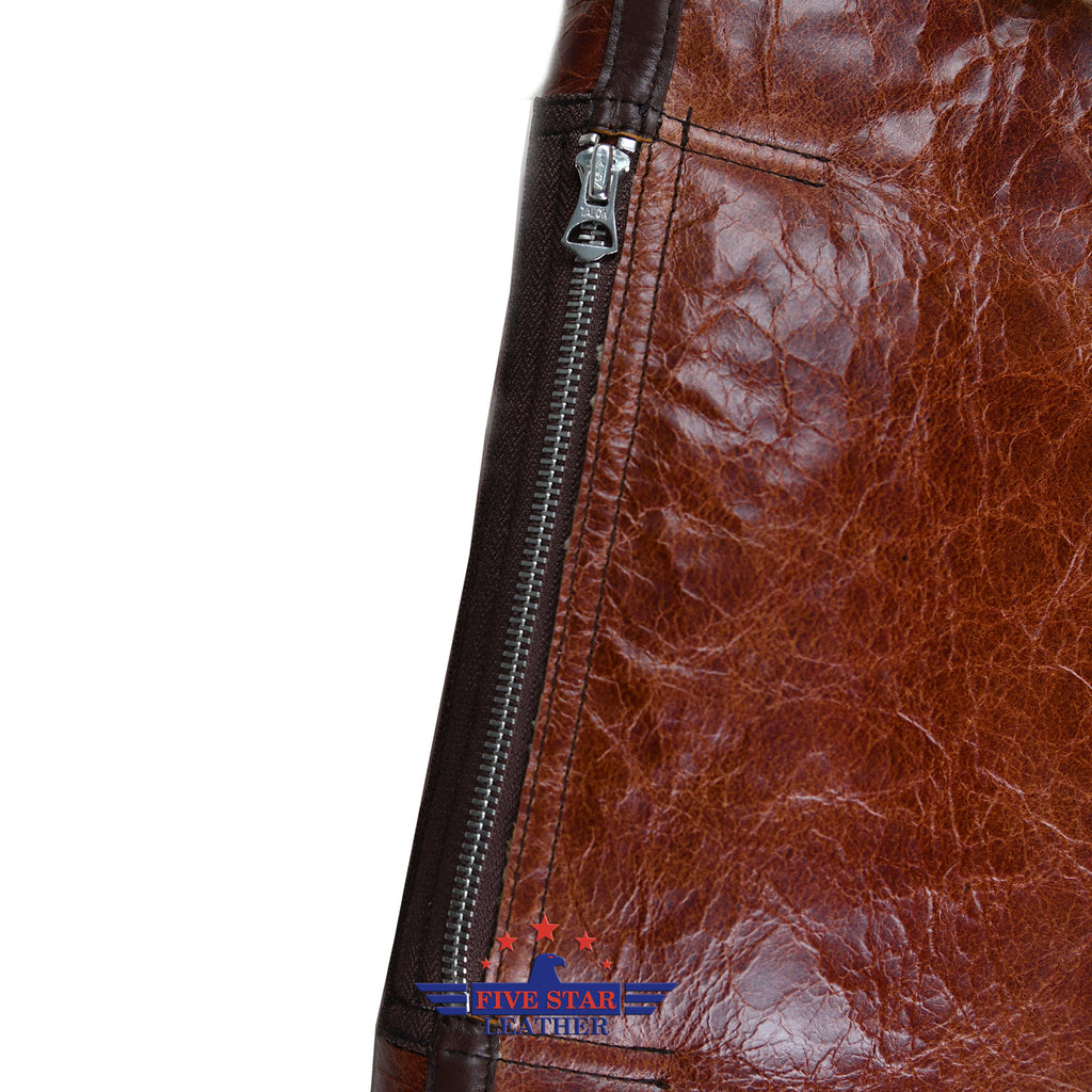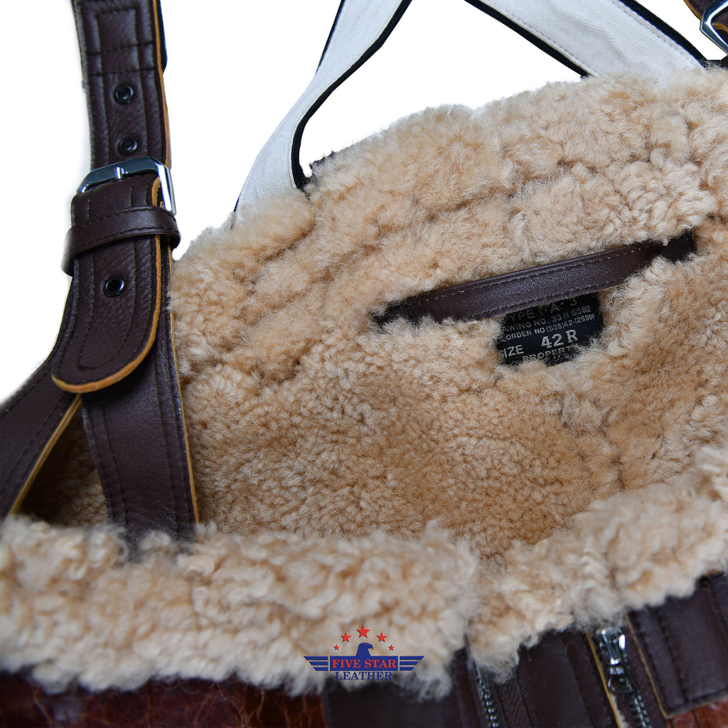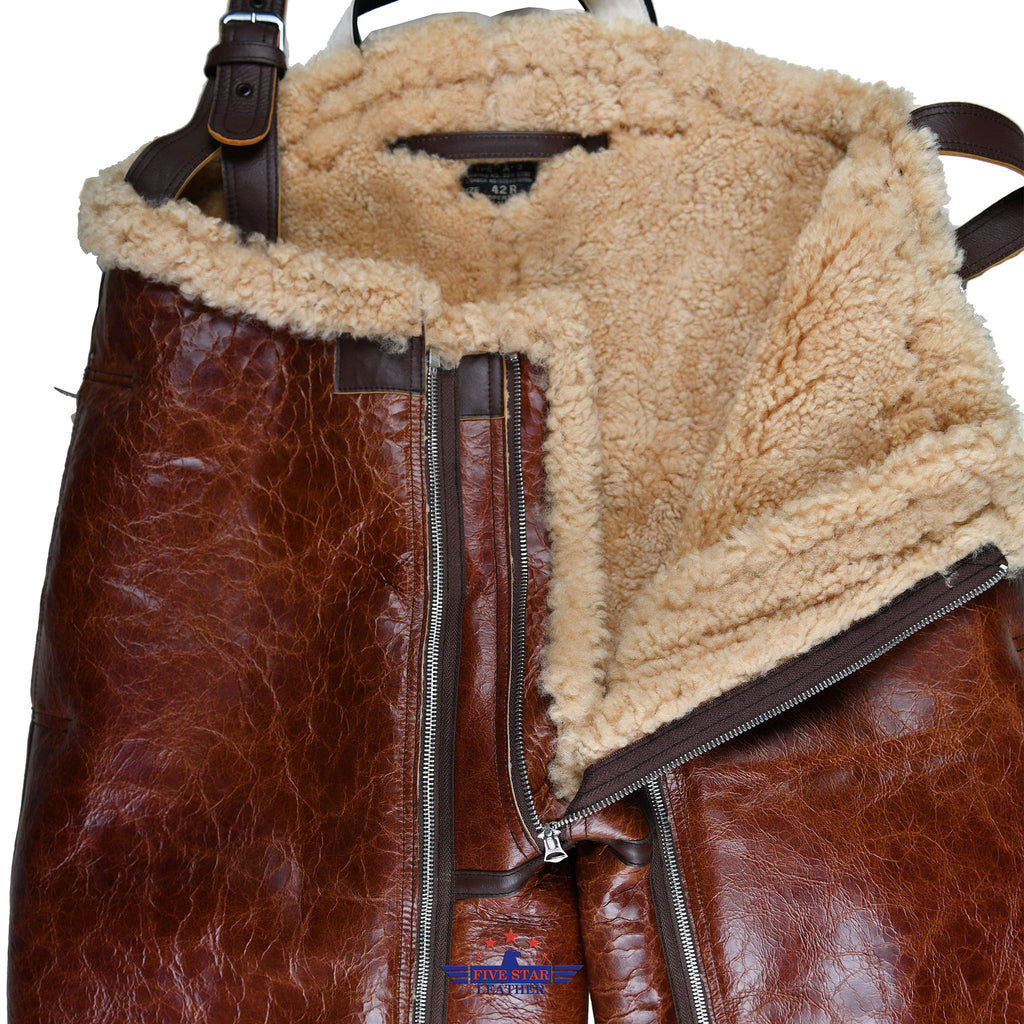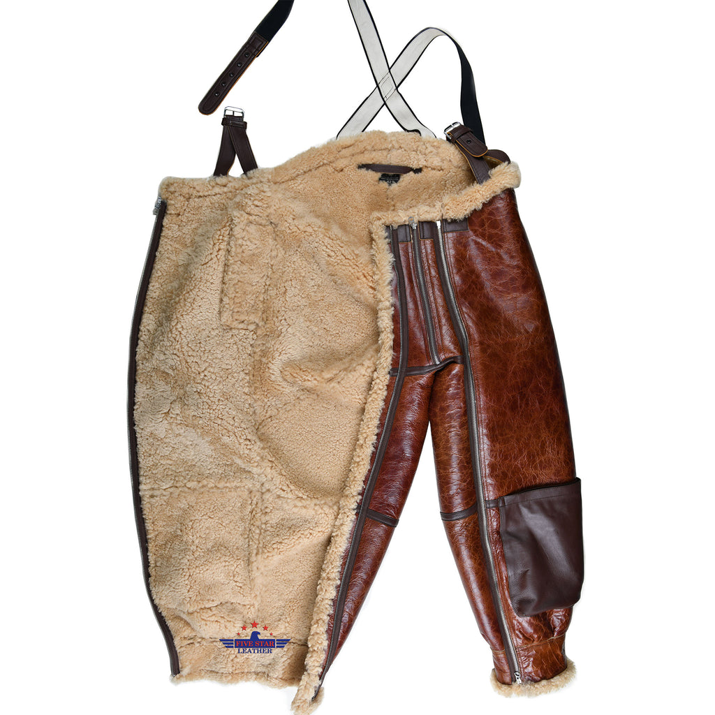 Originally designed to complement B-3 Flight Jackets for Army Air Force personnel, these authentic FiveStar Leather Repro WWII USAAF Type A-3 Winter Reddish Brown Flying Trousers are a must-have for any aviation enthusiast. Their DTM Sheepskin outer shell, 22mm fleece lining, and Long Talon Zippers, along with adjustable straps and high-quality brass buckles with a Nickle finish, provide both style and functionality. With Reddish Brown Horsehide Trims and a correct Woven Label, these trousers offer unparalleled authenticity. Available in custom sizes 38 - 46 with a no return policy.