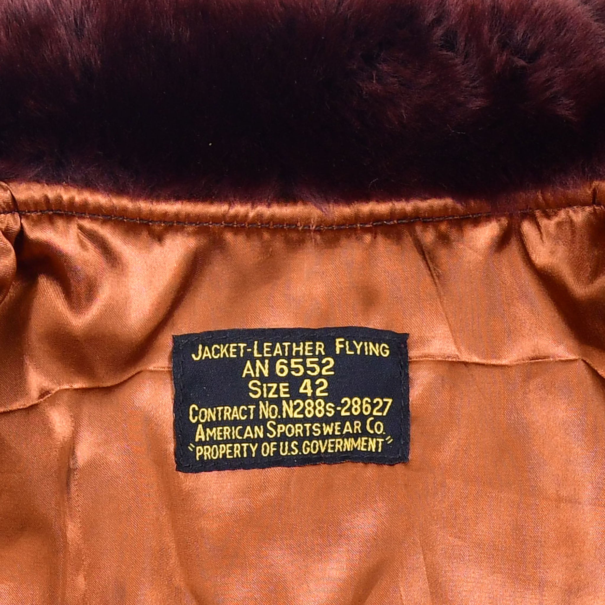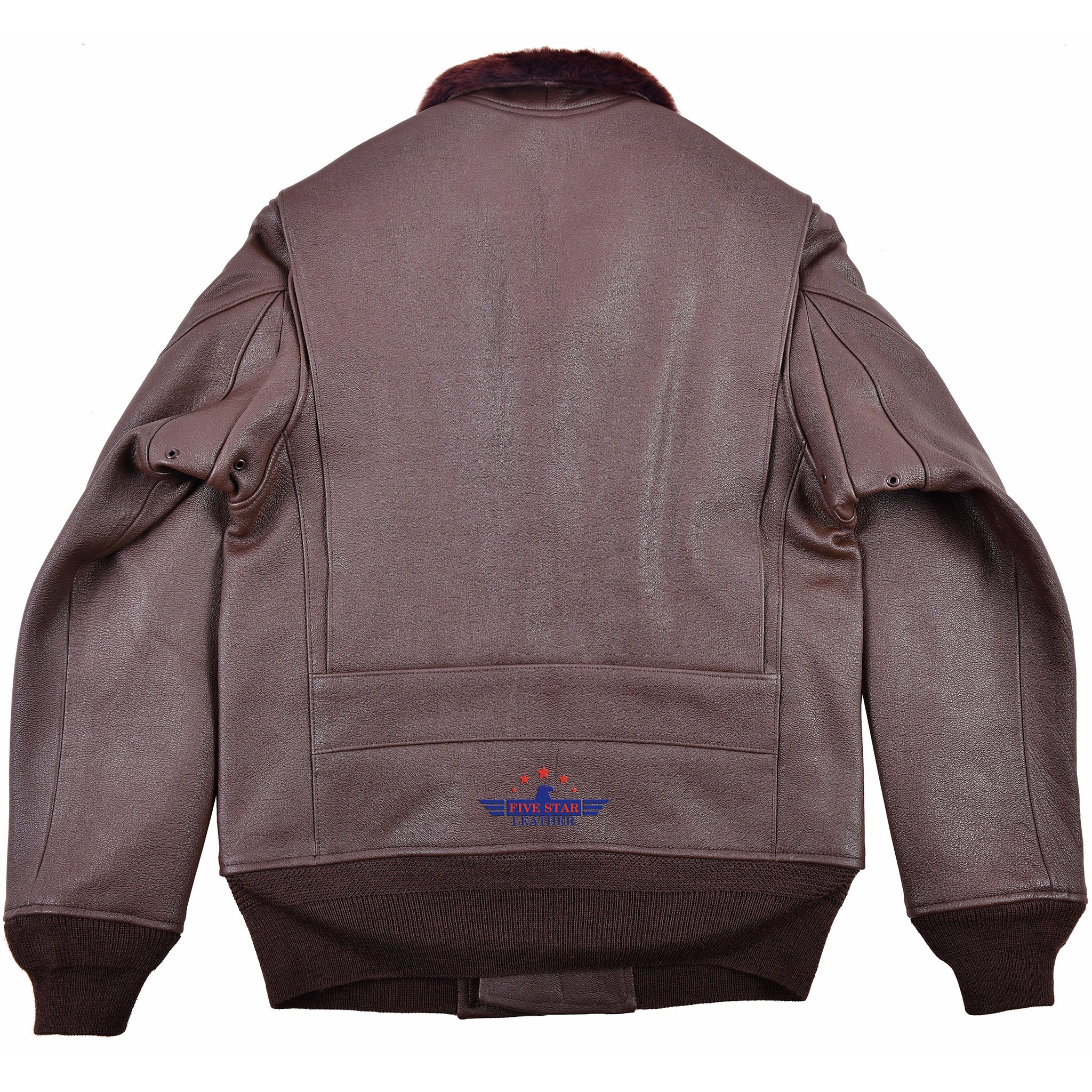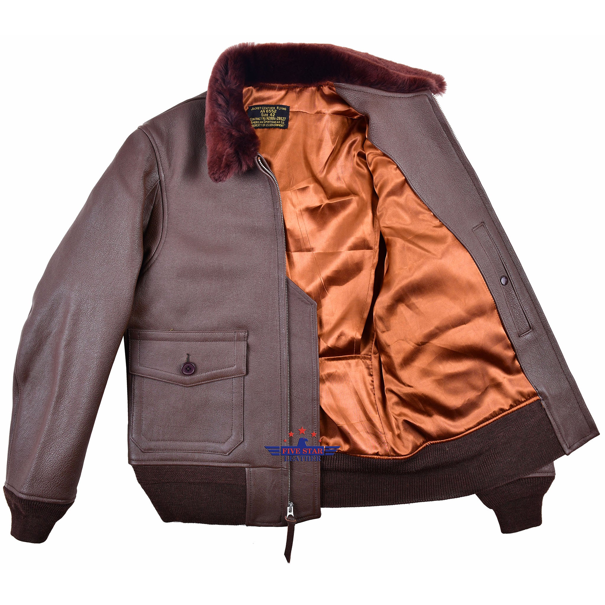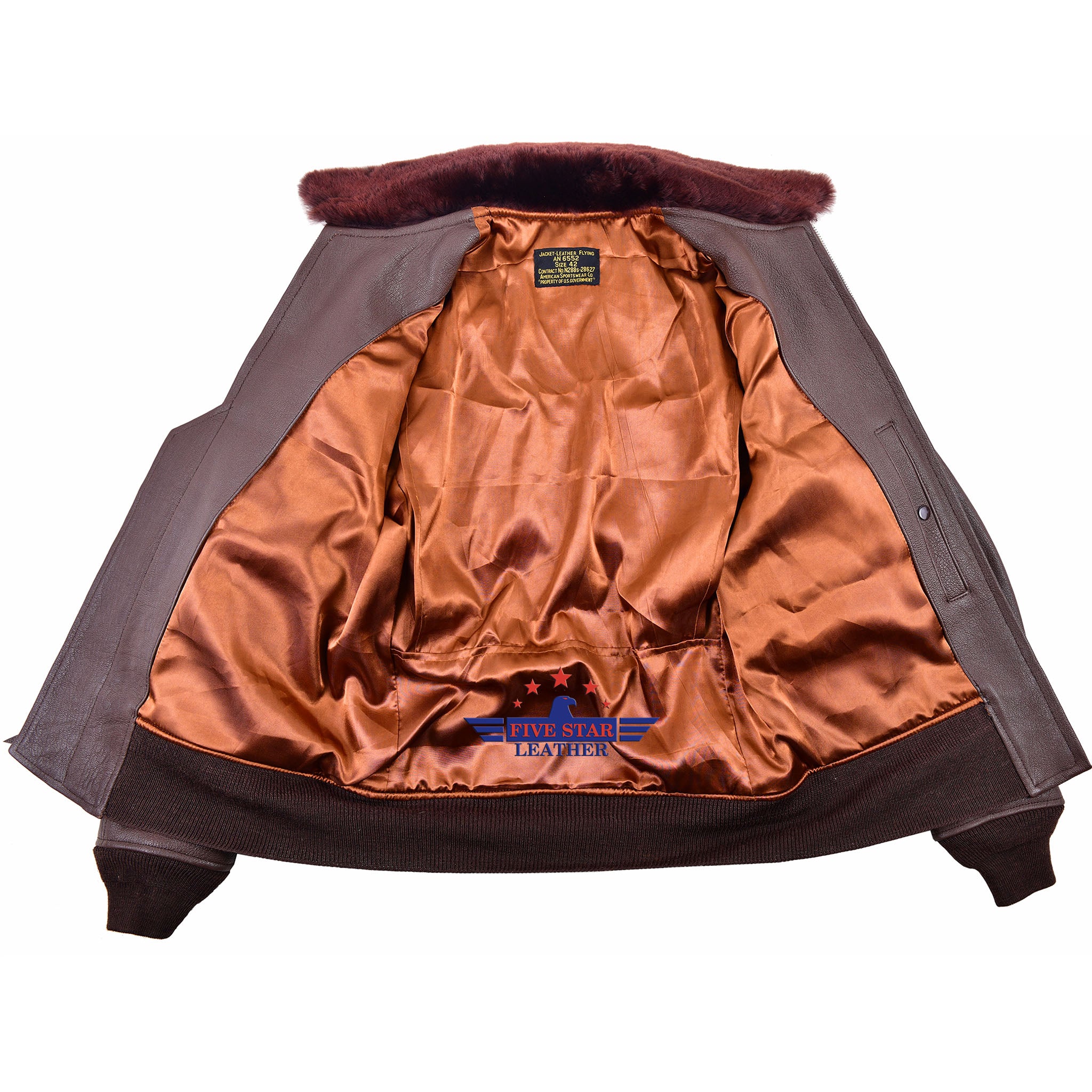 FIVESTAR LEATHER Reproduced American Sportswear AN-6552 Jacket, made from 100% Veg Tanned Crystal Goatskin Mid Brown Color, Redish Russet Brown Mouton Fur Collar, Repro Talon Zipper Fastening, 100% Wool Knitting's Single Rib Rack Seal Brown Color, Rayon Lining, Fine and Outclass stitching, This jacket is available on custom sizes on demand