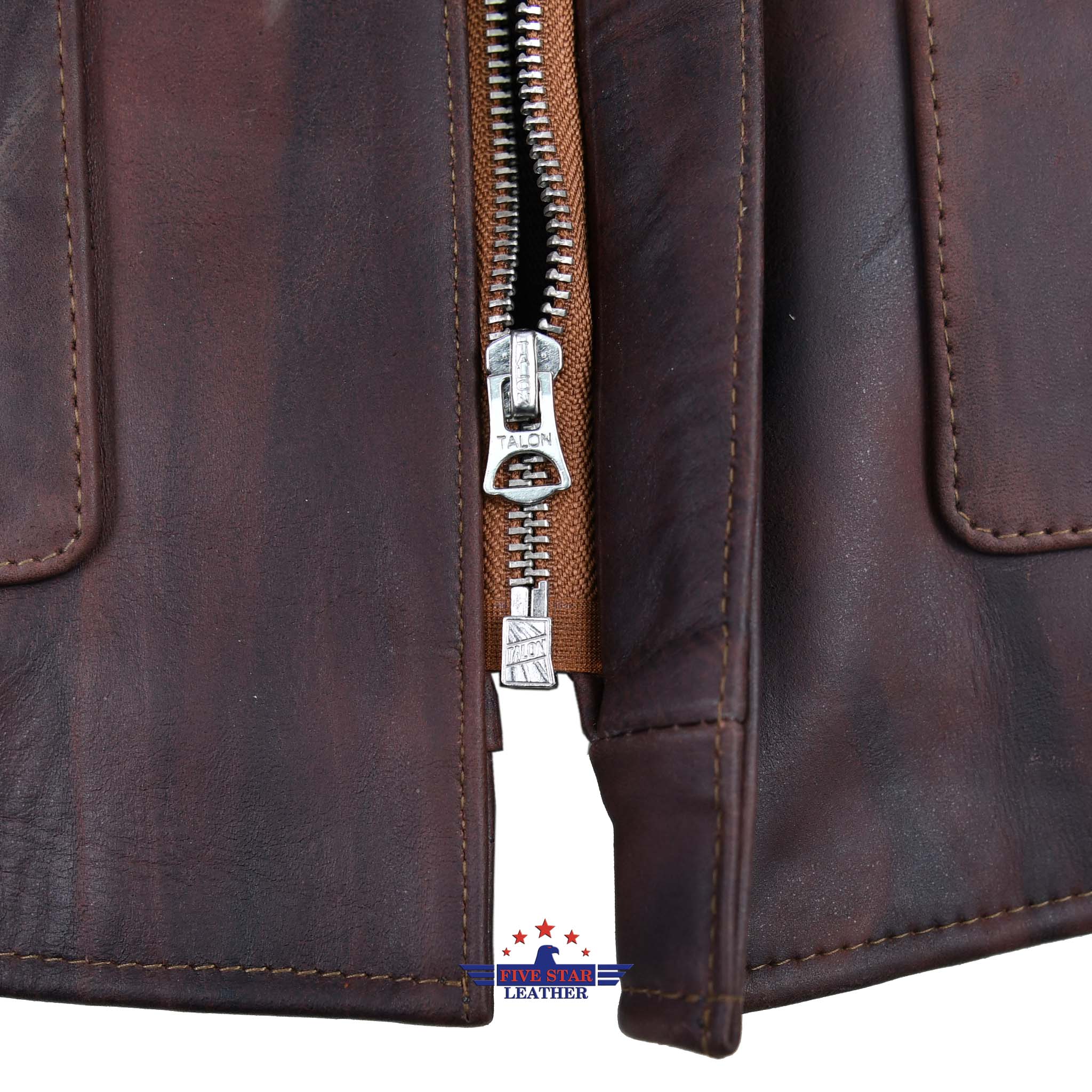 This FiveStar Crusader Jacket is crafted with premium horse hide distressed brown leather. Its dark brown lining is made from high-quality cotton, and the khaki contrast thread adds a vintage feel. With a Talon reproduction zipper and two front flap pockets with side entry pockets, it's the perfect blend of style and function. Plus, there's an added inside pocket for convenience.