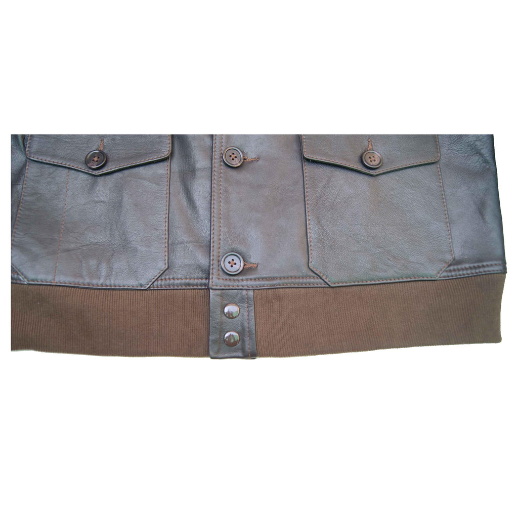 Crafted from authentic, high-quality goatskin leather in a seal brown shade, this Men's Air Force Repro A-1 Field Jacket offers durability and style. Featuring a comfortable cotton lining, secure front button closure, and two flap pockets, it combines practicality with a classic aviator look. Handmade and waxed for softness and a unique finish, this jacket showcases fine stitching and is available in all sizes to suit your needs.