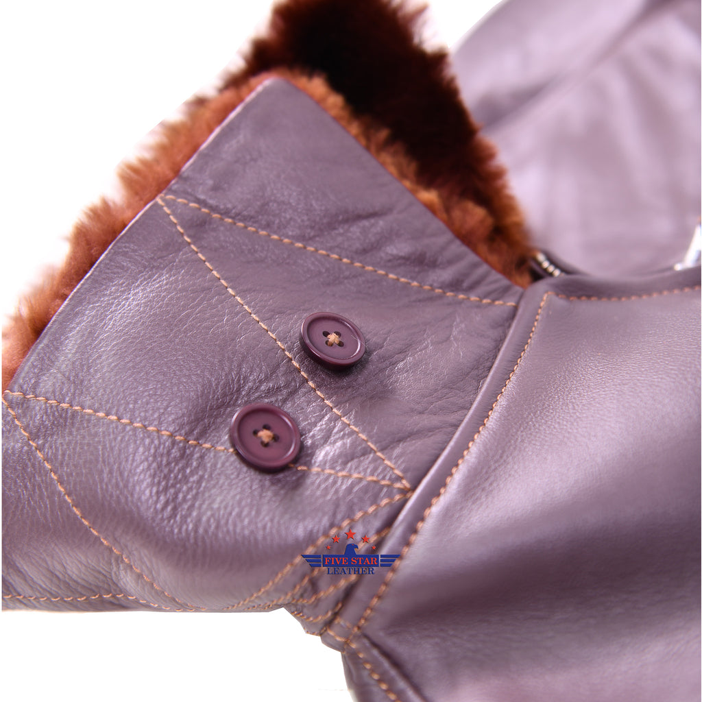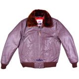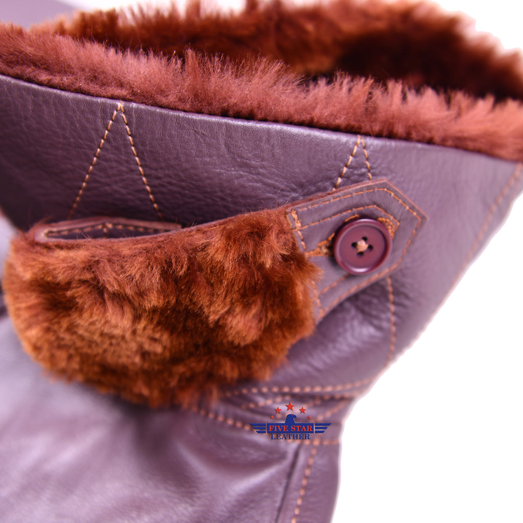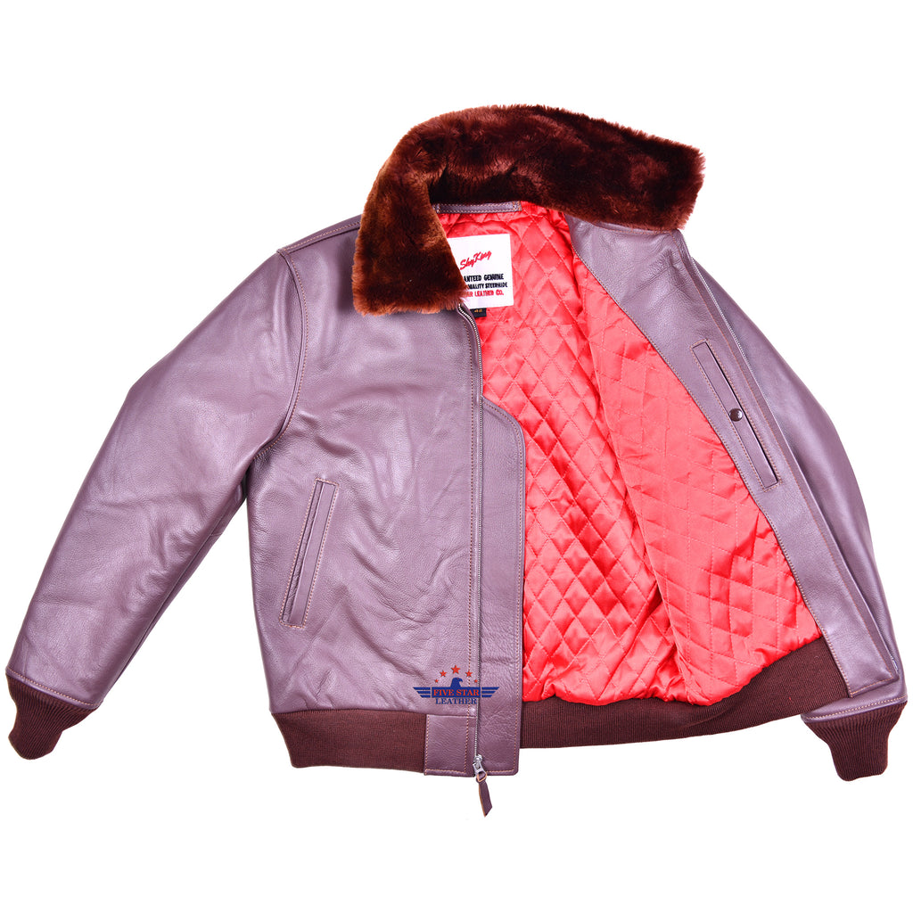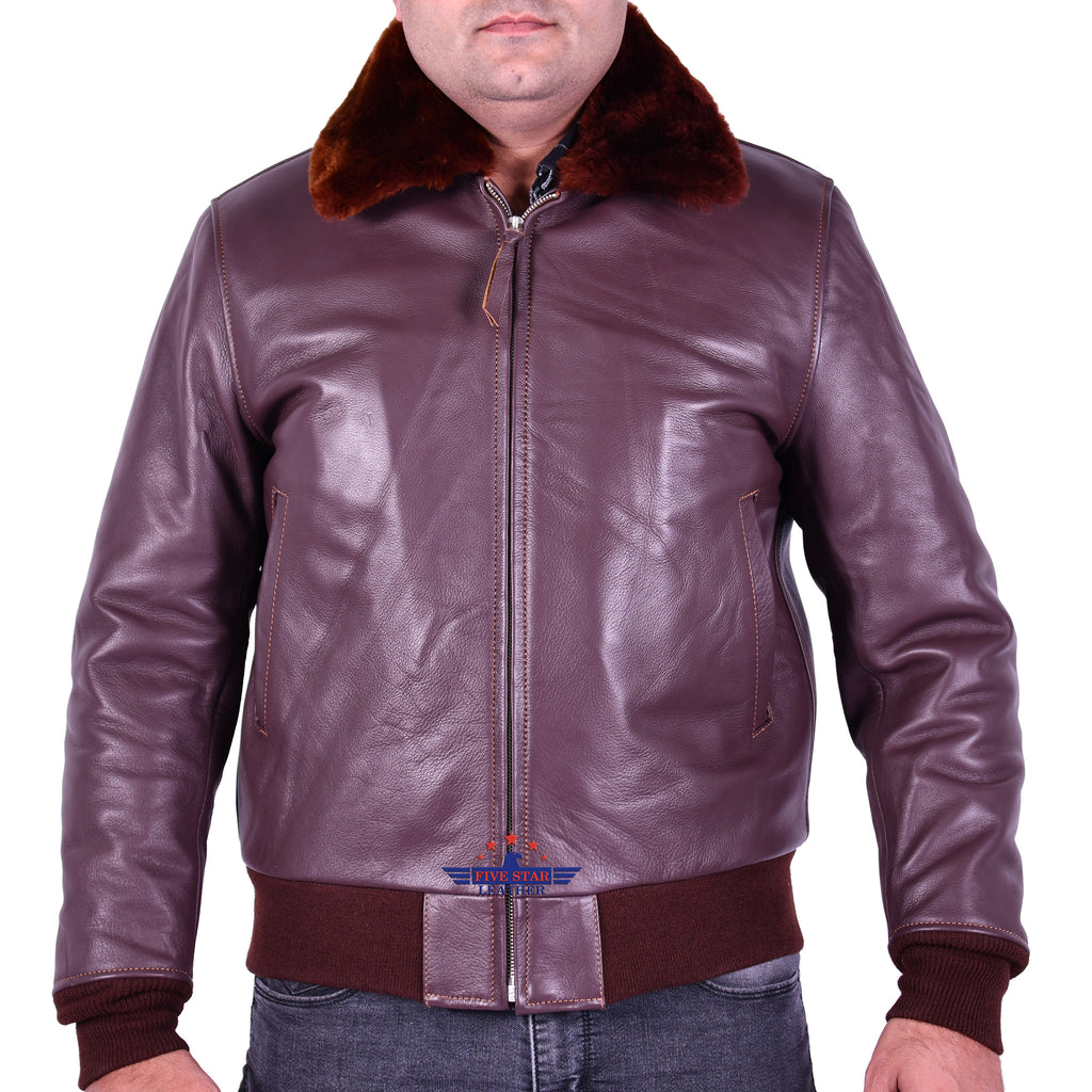 This top-grade leather jacket is crafted from genuine steerhide, featuring a sturdy front talon zipper and two convenient side pockets. It boasts a real mouton fur collar and two inside snap-button pockets for added security. The soft russet brown ribbed cuffs and hem provide comfort, while the warm quilted lining made of 100% polyester ensures coziness. Expert stitching highlights its quality construction. Available in all sizes, this jacket combines authenticity with vintage style for a timeless look.