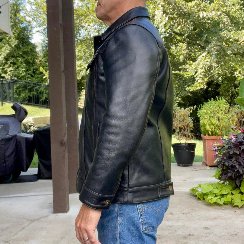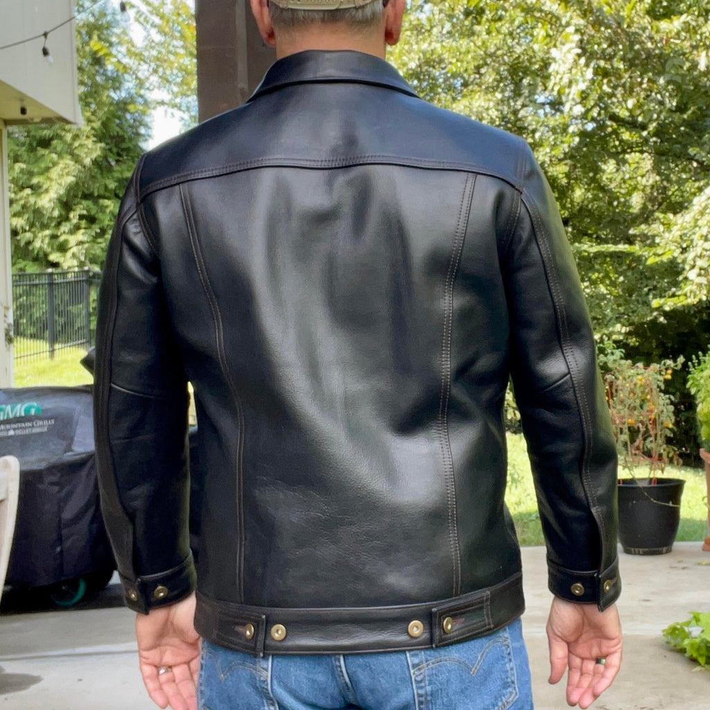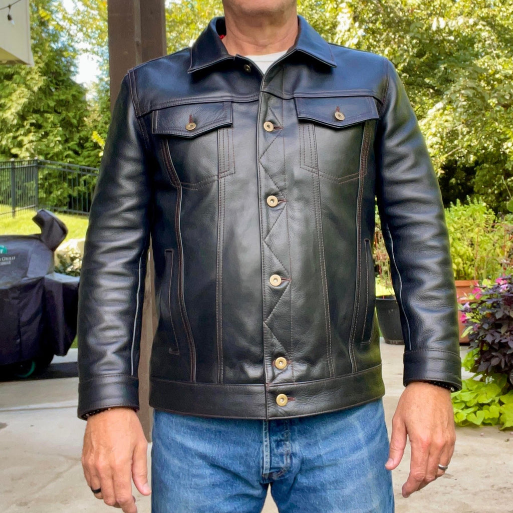 FiveStar Leather presents the Vintage Trucker Jacket crafted from genuine, high-quality black horsehide leather. Featuring semi vegetable tanning and a leather thickness of 1.2mm, this jacket includes two chest flap pockets, two side pockets, and a front button closure. It is lined with durable black cotton twill and offers an inside pocket for convenience. Custom sizing is available upon request to ensure the perfect fit.