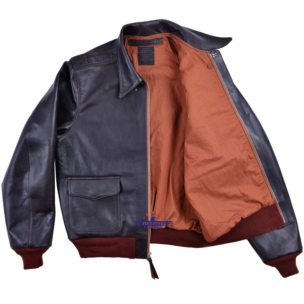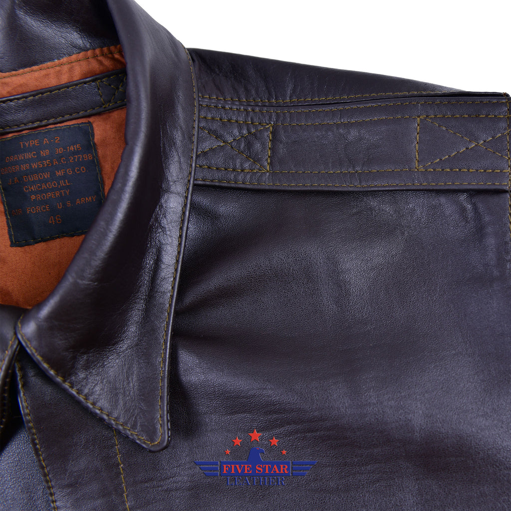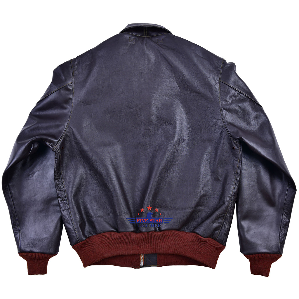FiveStar Leather Repro Dubow A2 Leather Flight Jacket made from our Special Horsehide Leather Veg. Tanned, 100% Real Blend wool acrylic Knitting's In Dull Purple Original DTM Color, Olive Green Thread Stitching, Repro Talon Zipper Fastening, 100% Cotton lining true to original Color, and this A2 Jacket have the true and Authentic Pattern Details of A2 J. A. DUBOW MFG. Co. Drawing No. 30-1415, Order No. W535 A.C. 27798