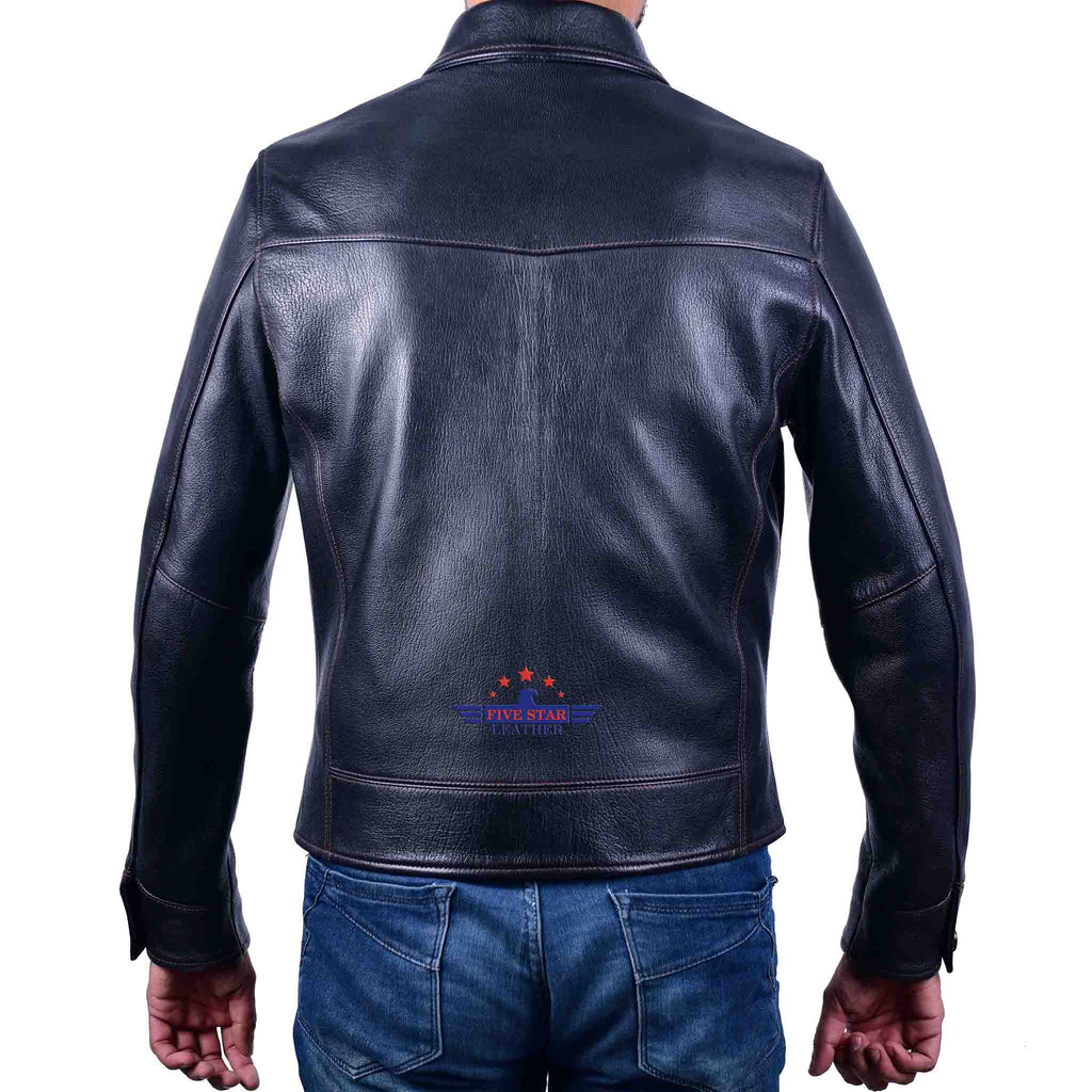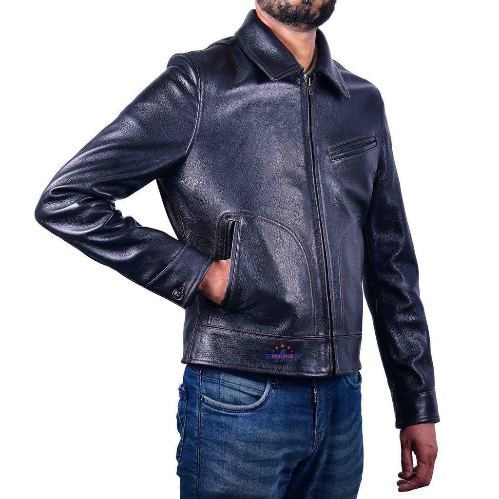 The FIVESTAR LEATHER ROAD MASTER RIDER'S JACKET FOR MEN is expertly crafted from high-quality goatskin semi veg. tanned leather in a sleek black color. Its 100% cotton drill lining and real horn buttons on the cuff provide durability and style. Secure your essentials in the one chest and two side pockets, as well as the inside lining pocket. This hand-made garment features fine and outclass stitching, along with a high-quality brass zipper for added functionality. This is a Handmade waxed Garment to make this soft and unique.