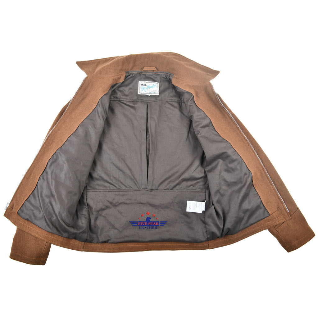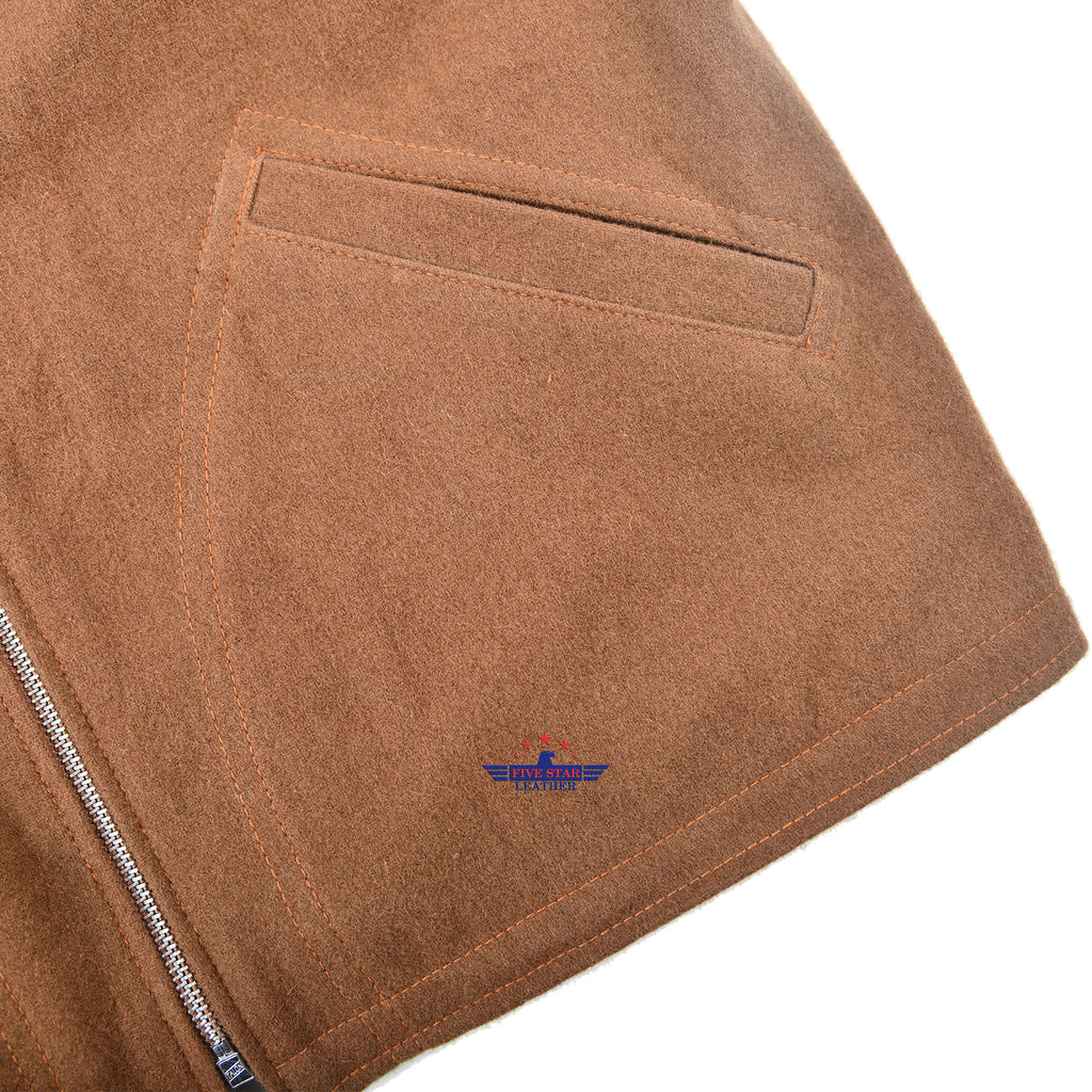 Experience timeless style with the FiveStar Leather 40s Style Men's Sports Jacket. Crafted from luxurious wool fabric, this jacket features rear panels on the collar made with 1.2mm seal brown goat leather, a front reproduction Talon zipper for a secure fit, and a high-quality cotton inner lining. With expert stitching and attention to detail, this jacket is a true showstopper.