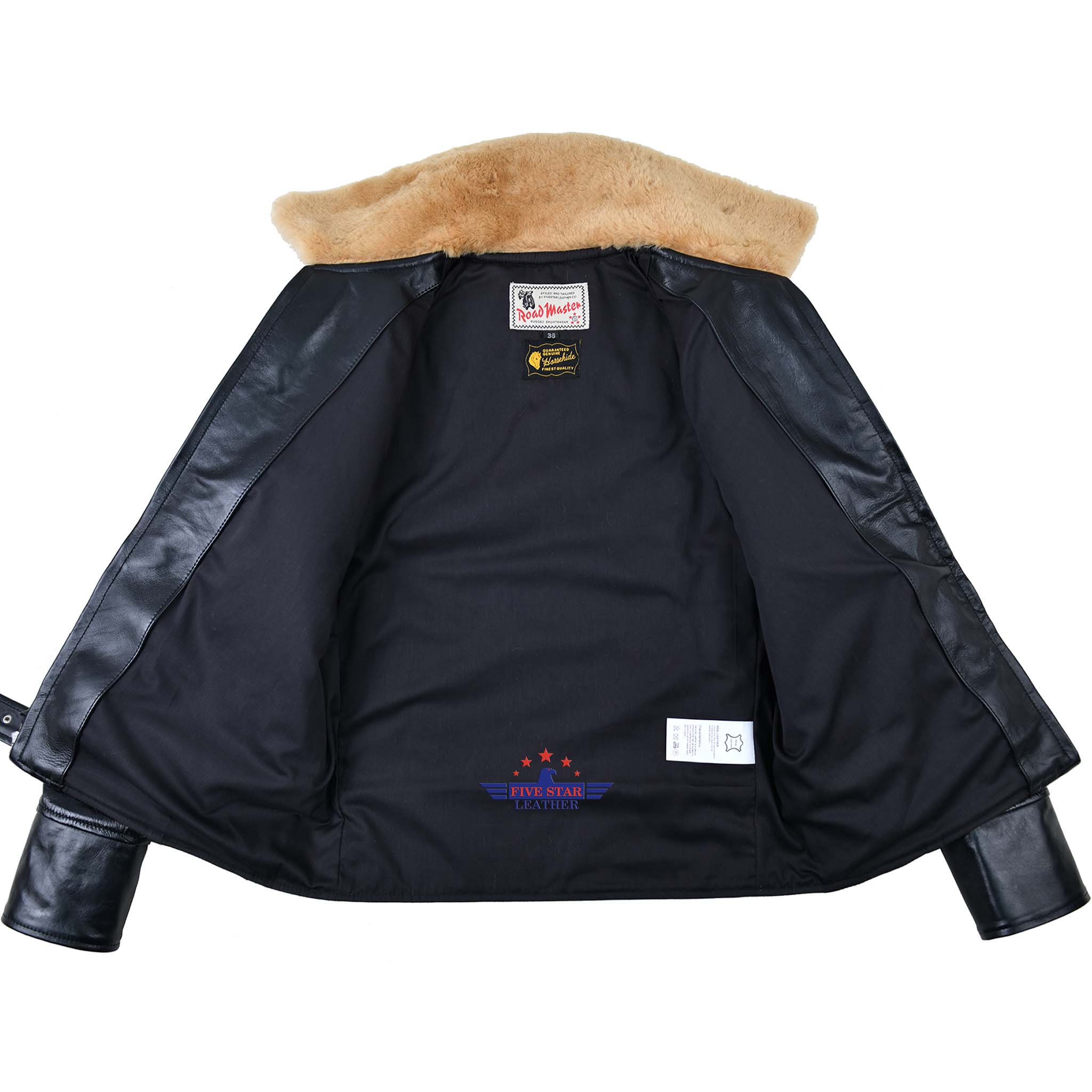 This FiveStar Leather 1930s Grizzly Jacket is crafted from top-quality horse hide leather in a sleek black color. Its standout feature is the blonde mouton fur collar and front and back sheepskin panels. The front Talon zipper closure and high-quality 100% cotton lining make it both stylish and comfortable. This jacket also boasts Nickle brass buckles and hardware, adding to its durability and unique design. Custom sizes are available for the perfect fit. Inspired by a vintage combination, this jacket is truly one-of-a-kind.