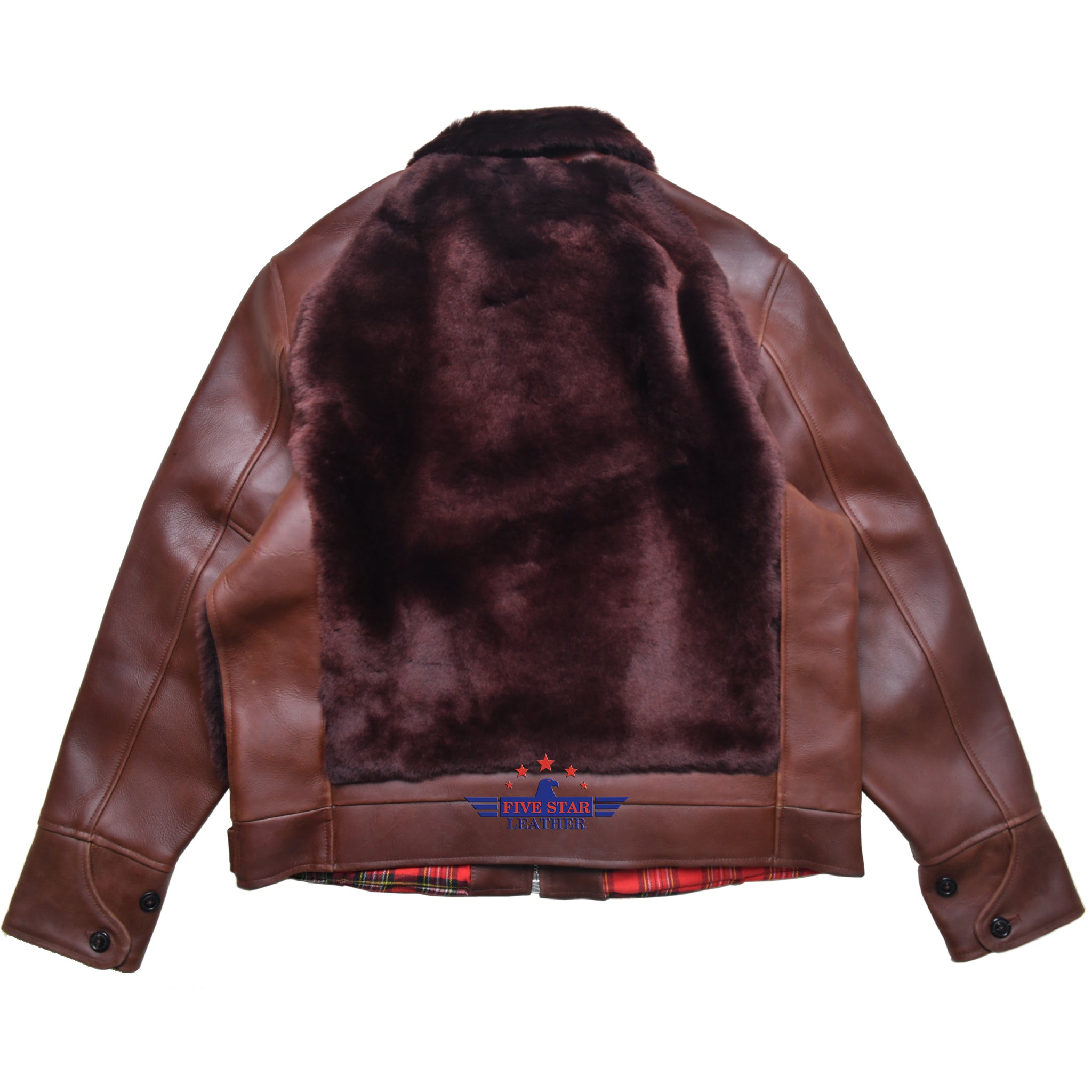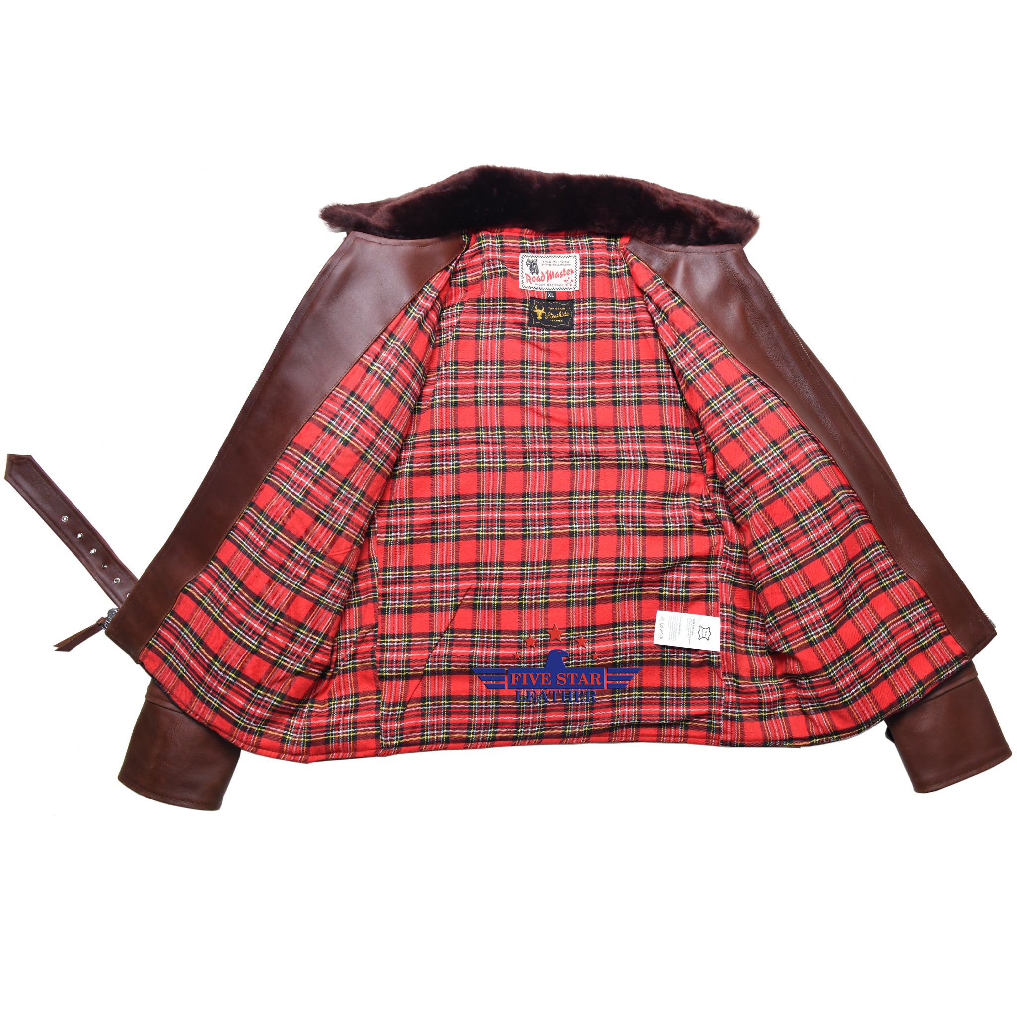 This FiveStar Leather 1930s Grizzly Jacket is expertly crafted from premium 2mm thick CHL leather in a rich, reddish brown color. The thick leather provides durability, while remaining supple for comfortable wear. The jacket features a Reddish Russet Mouton Fur collar and front and back panels, with a front zipper closure using a #8 teeth zipper. The red Tartan lining with contrasting stripes adds a touch of style, and the heavy-duty Nickle Brass buckle and hardware ensure quality and reliability. The stitching is meticulously done by skilled professionals, and custom sizes are available upon request.