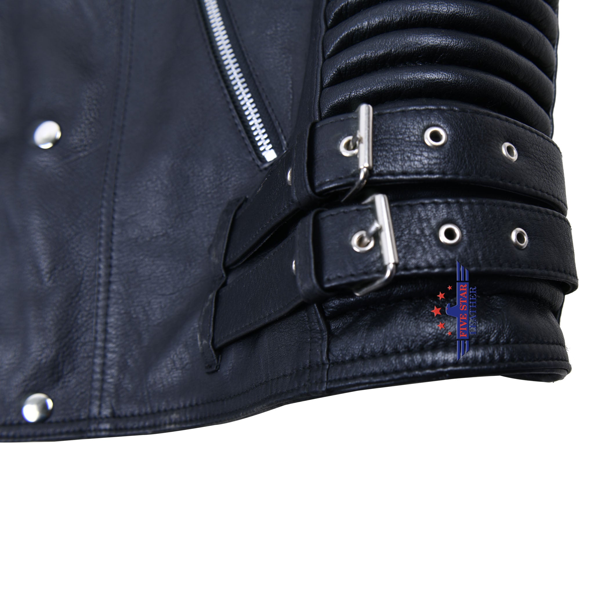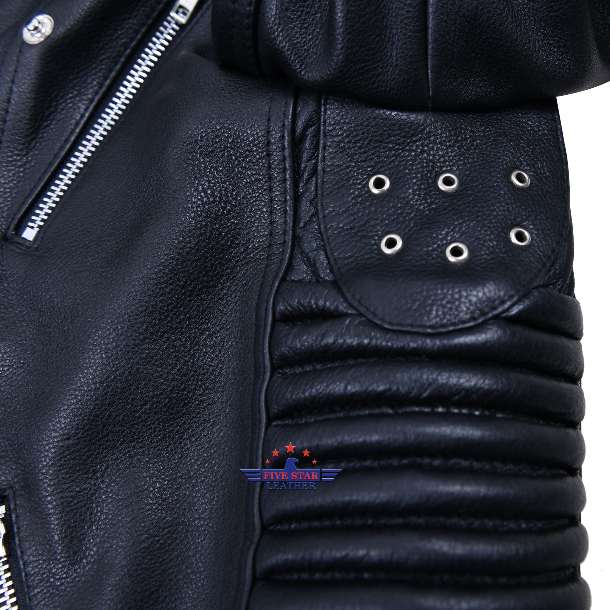 This GOD GIFT men's black leather jacket is crafted from premium "A" grade genuine steer hide, ensuring durability and quality. It features an asymmetrical front zipper, neck straps, and side straps for a tailored fit and stylish look. Designed with padded motorcycle elements, it offers one chest pocket, two zippered side pockets, and an inside lining pocket for convenience. Handmade with waxed leather, this jacket is soft, trendy, and unique. Lined with 100% polyester and equipped with an original YKK zipper, it combines comfort with excellent craftsmanship. Available in all sizes, with more styles and colors in stock.