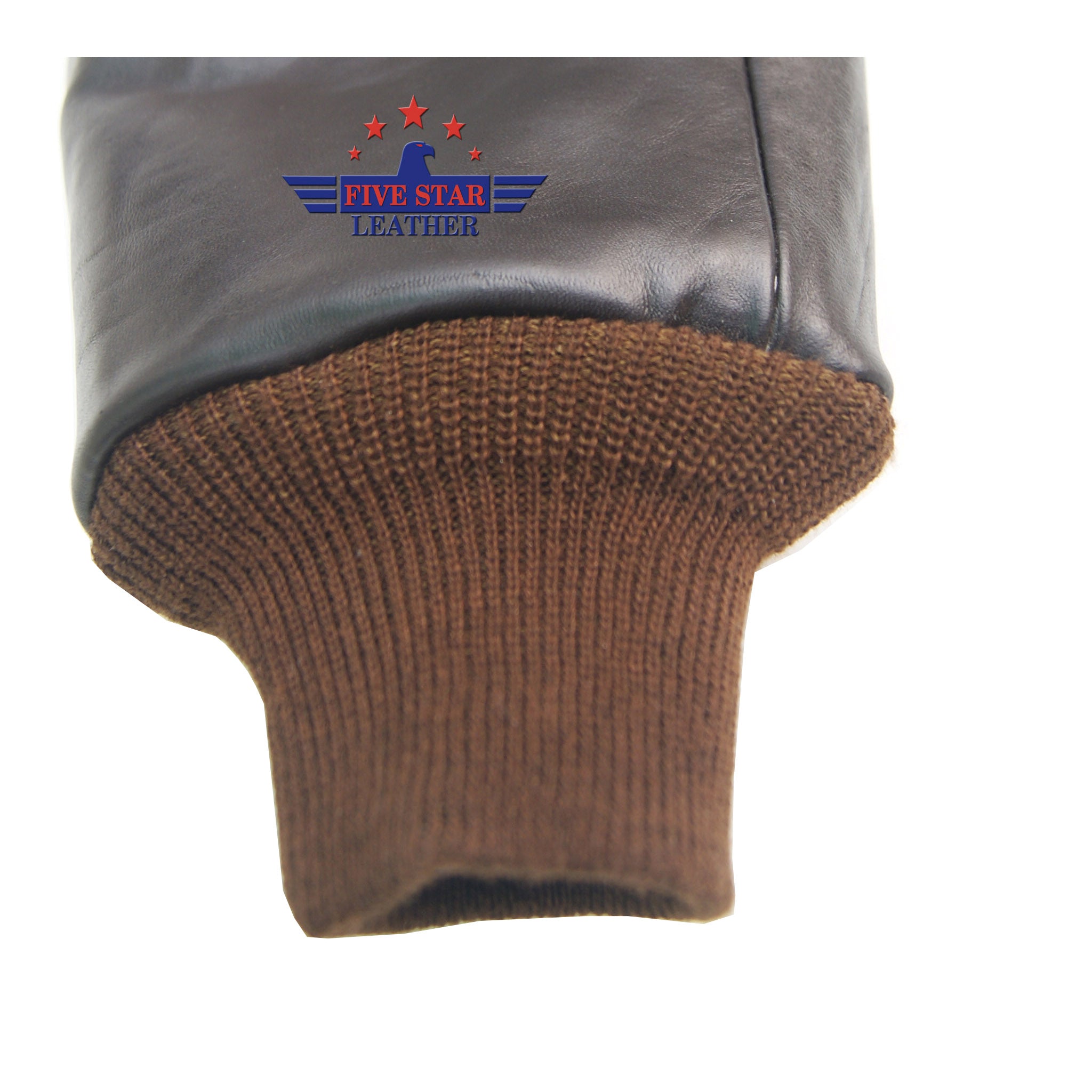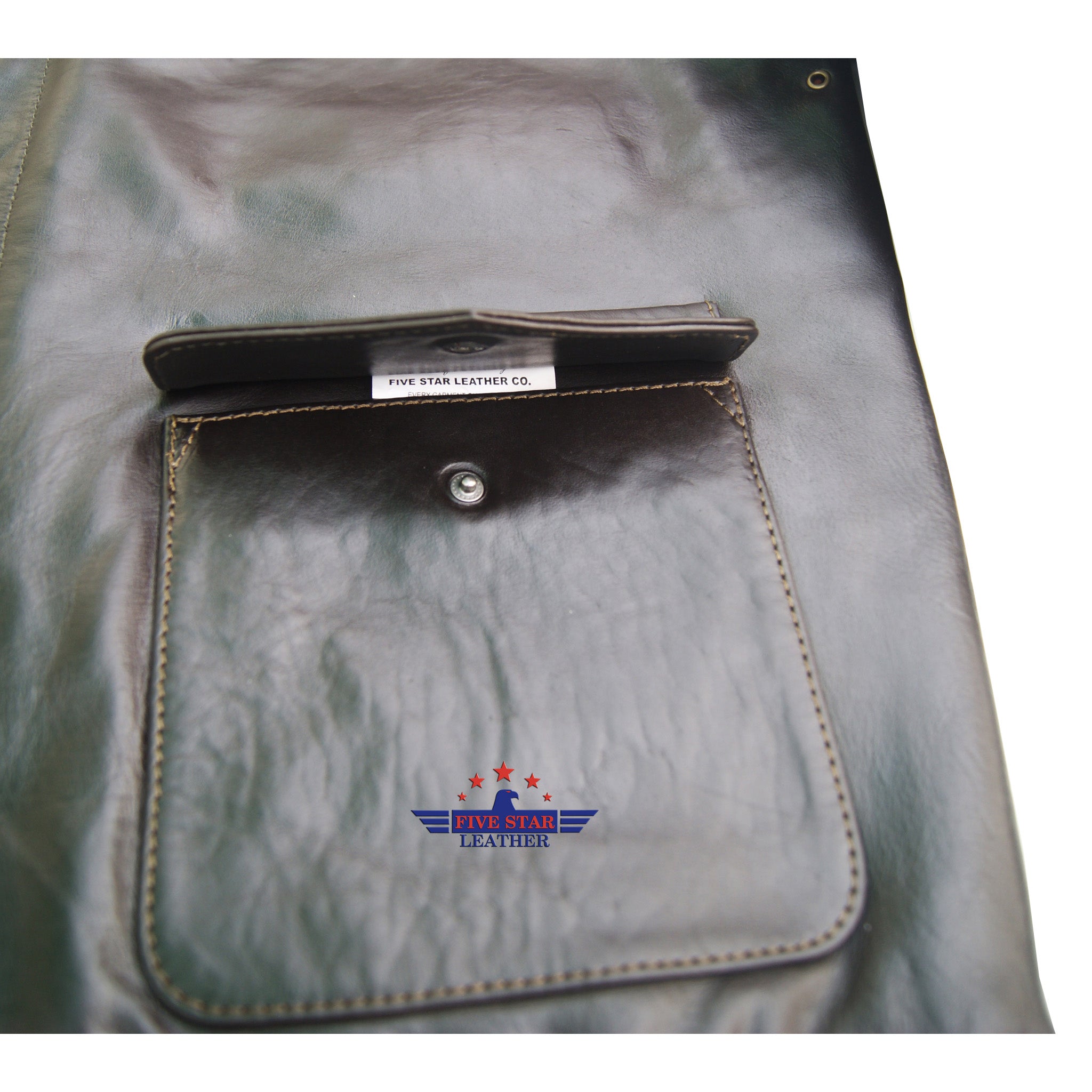 This top-grade leather jacket is crafted from genuine, high-quality horsehide leather. It features a sturdy Talon front zipper and two button-secured flap pockets. Designed with soft ribbed cuffs and bottom hem, it offers comfort along with durability. Inside, you'll find a premium cotton lining and an authentic military label, all stitched with exceptional craftsmanship. Available in all sizes to ensure a perfect fit.