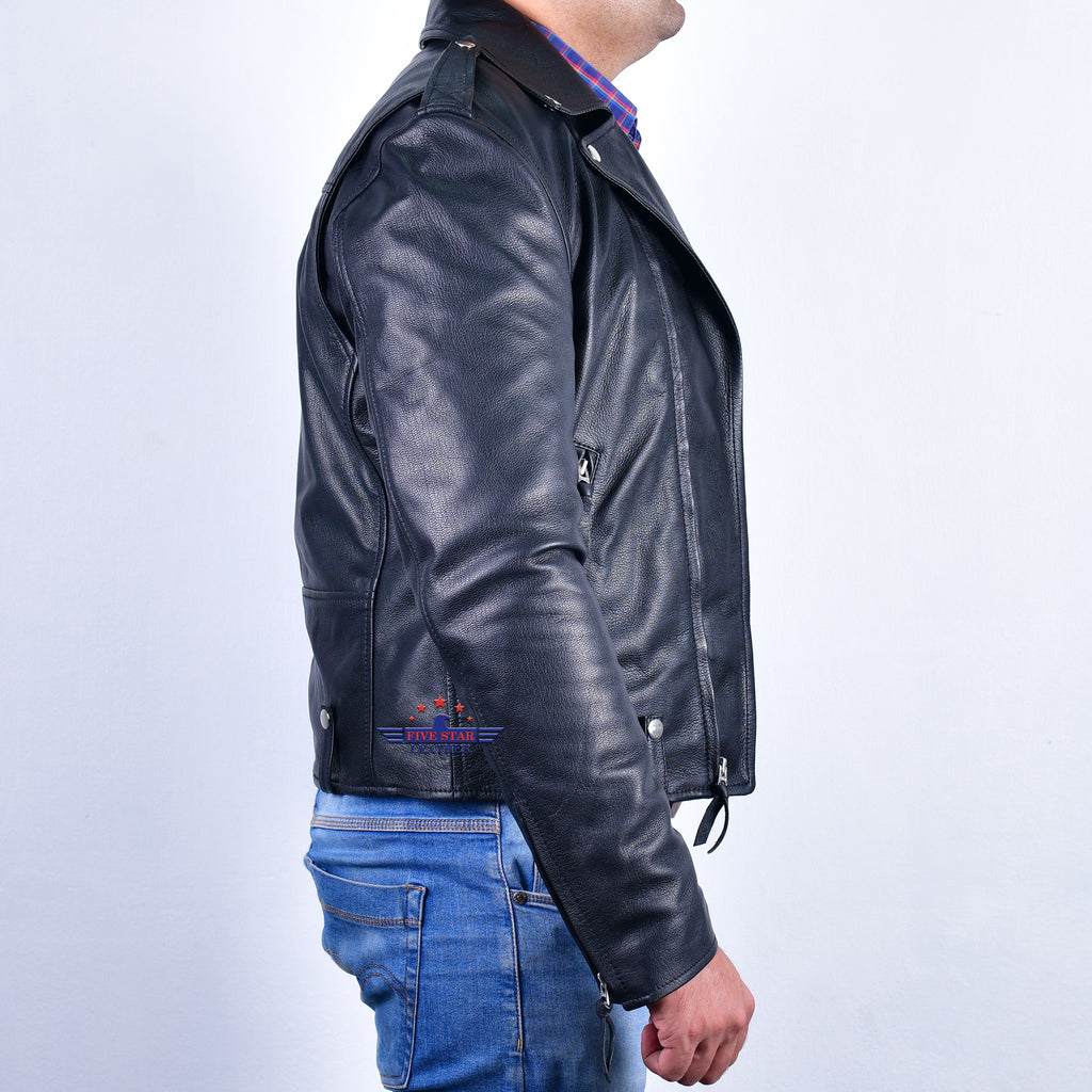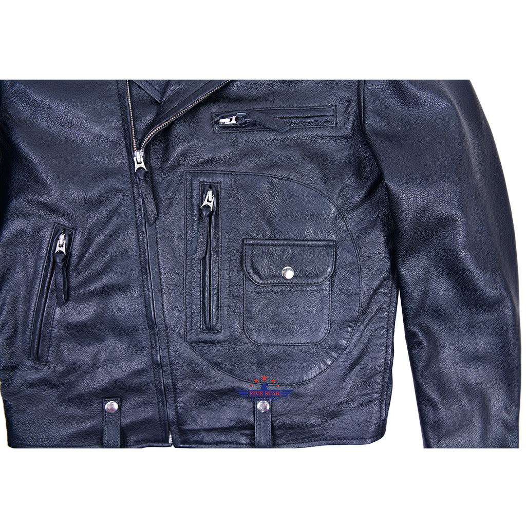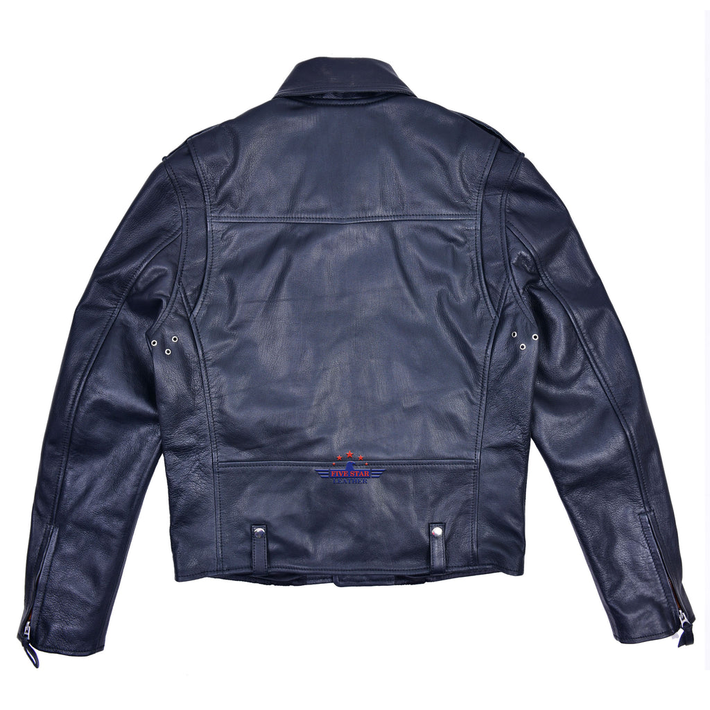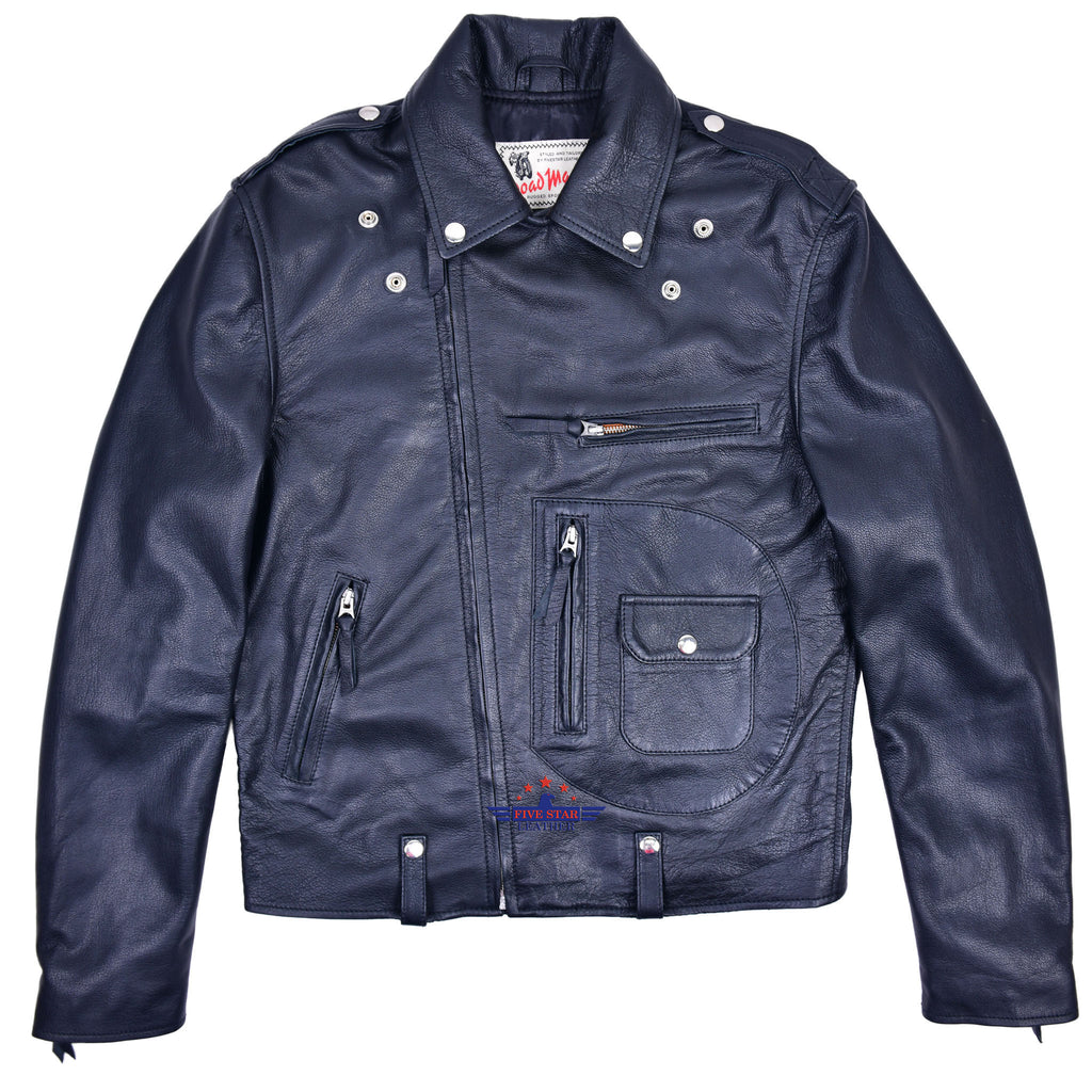 Experience the superior quality and timeless style of FiveStar Leather's Vintage D Pocket Road Master Men Jacket. Crafted from genuine goatskin leather with a thickness of 1.1 mm, this jacket features vintage talon zipper fasteners and a high quality rayon satin lining. Available in all sizes and customizable upon request, this jacket boasts an asymmetrical zipper closure and the classic D Pocket style for a sleek and effortless look.