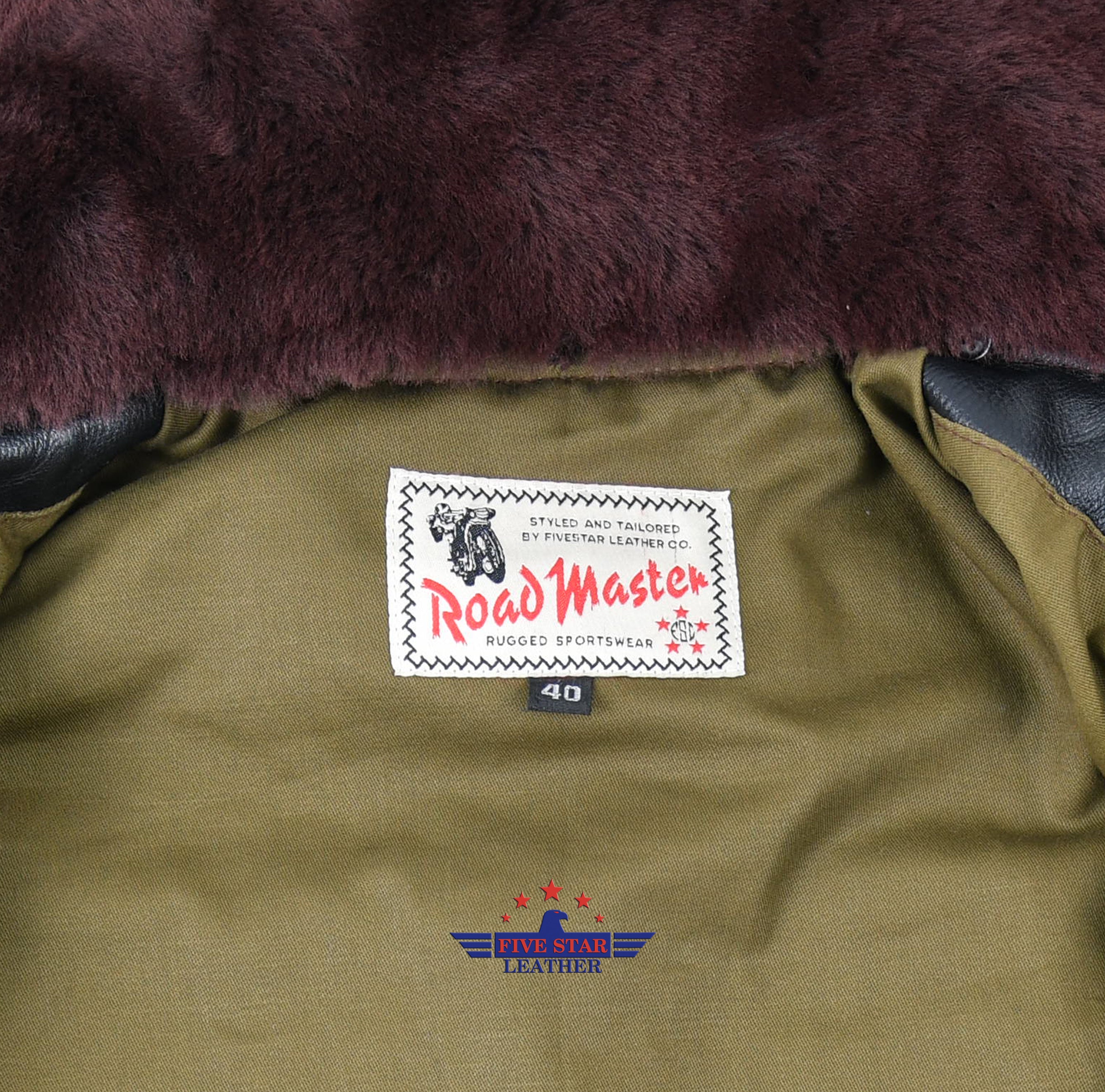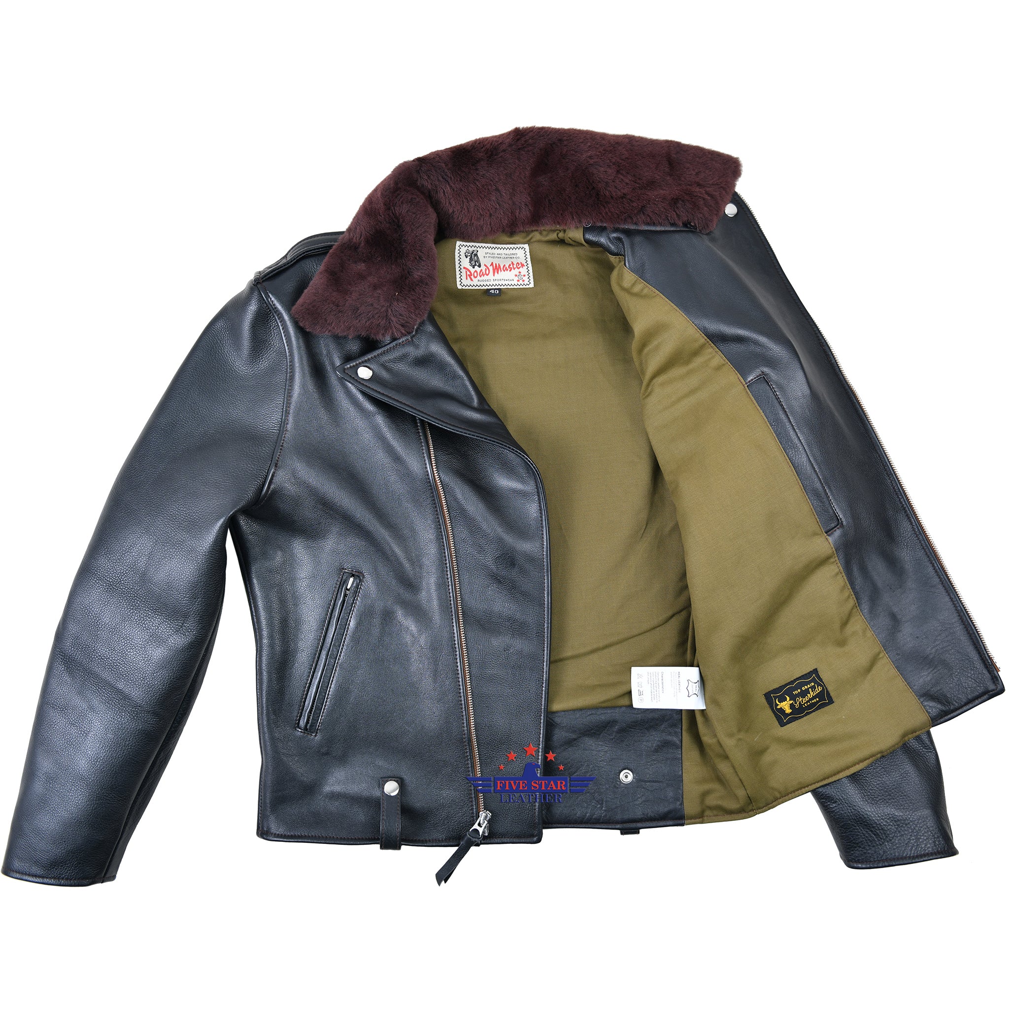 This FiveStar Leather Vintage D Pocket Road Master Men Jacket is crafted from premium black steerhide leather. It includes a detachable reddish russet brown mouton collar for added style. Featuring classic vintage Talon zippers and a distinctive d pocket design, the jacket is lined with durable and comfortable olive green cotton twill. The asymmetrical zipper closure enhances its timeless look. Available in all standard sizes with custom sizing options upon request, this jacket combines quality and versatility for lasting wear.
