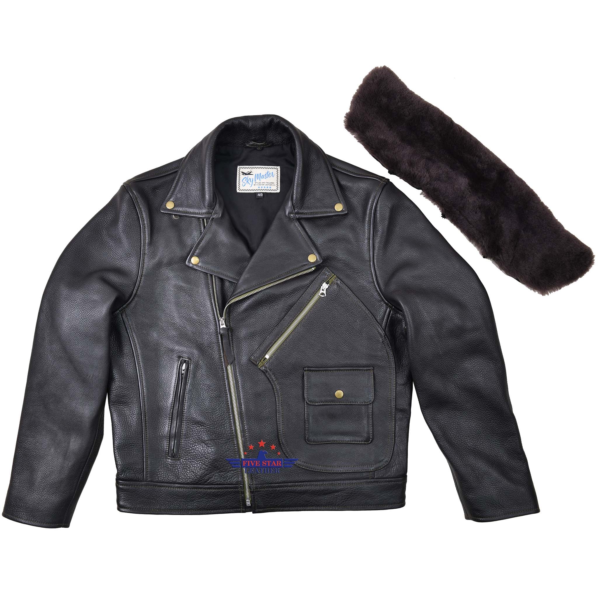 This FiveStar Leather Vintage D Road Master Jacket is crafted from premium Steer Hide Leather and features a removable Fur Collar, making it a versatile and high quality piece. The jacket is lined with a durable Black Cotton Twill and secured with a Vintage Talon Zipper. The thickness of the leather is 1.2 mm, ensuring durability and longevity. The front asymmetrical zipper closure adds a touch of style to this classic design. Available in all sizes, with the option for custom sizes upon request.