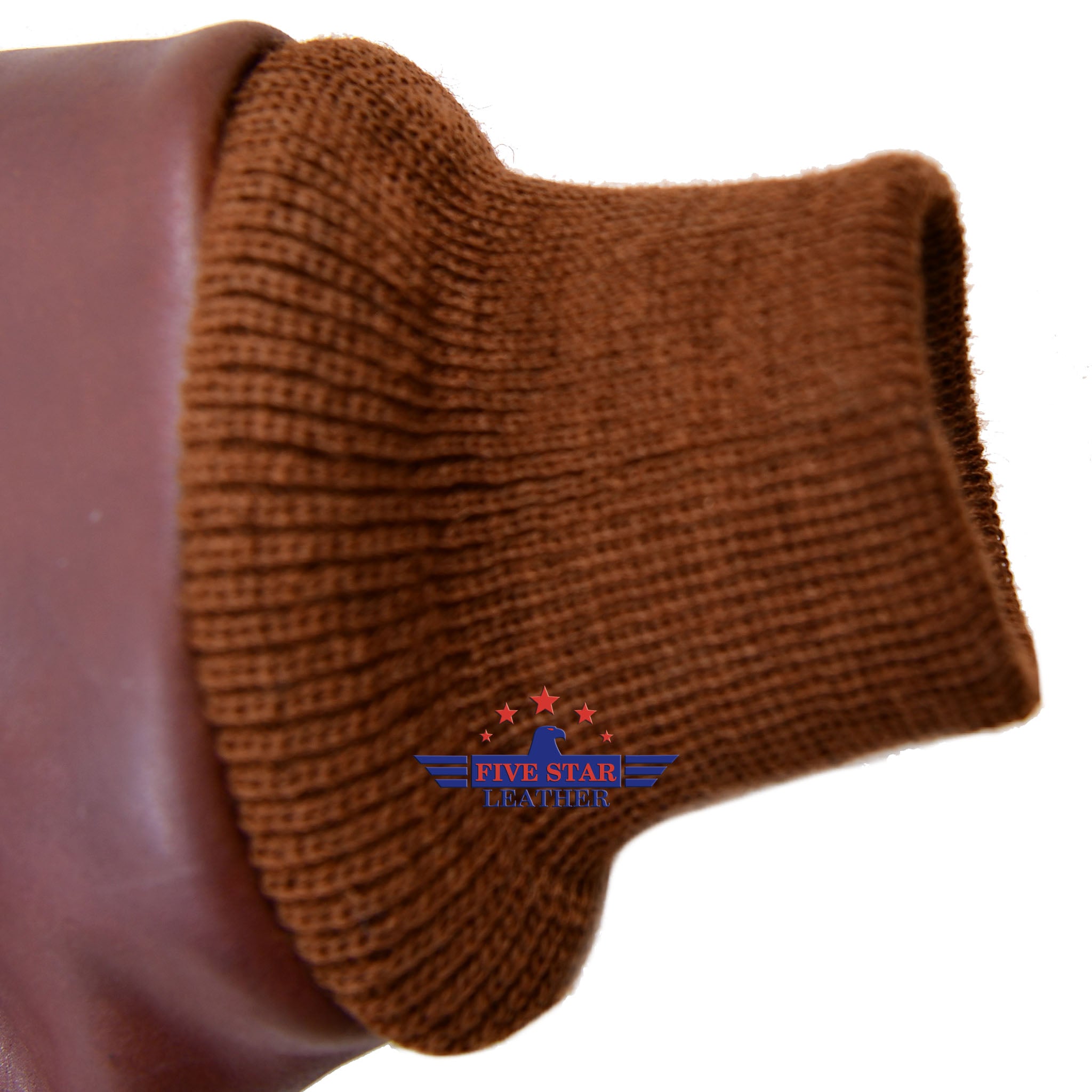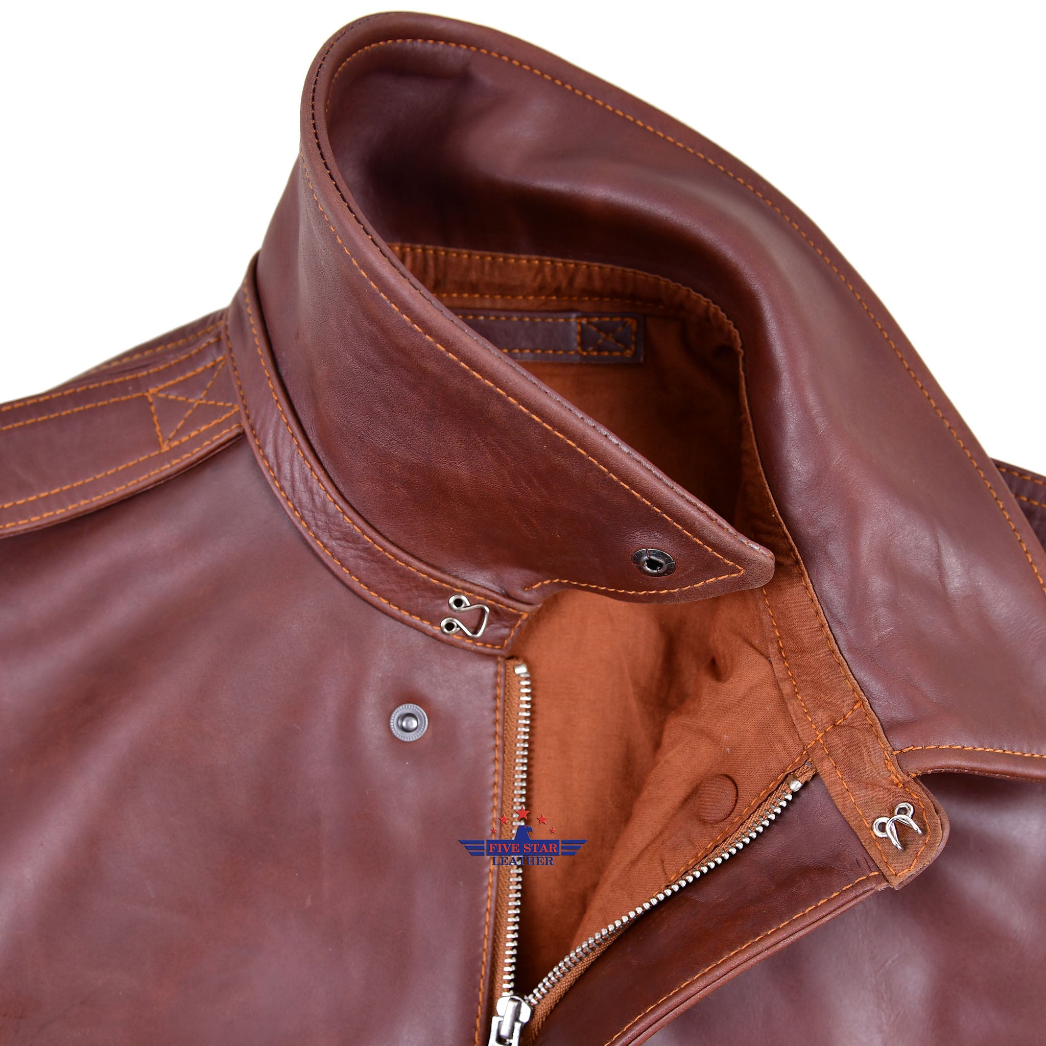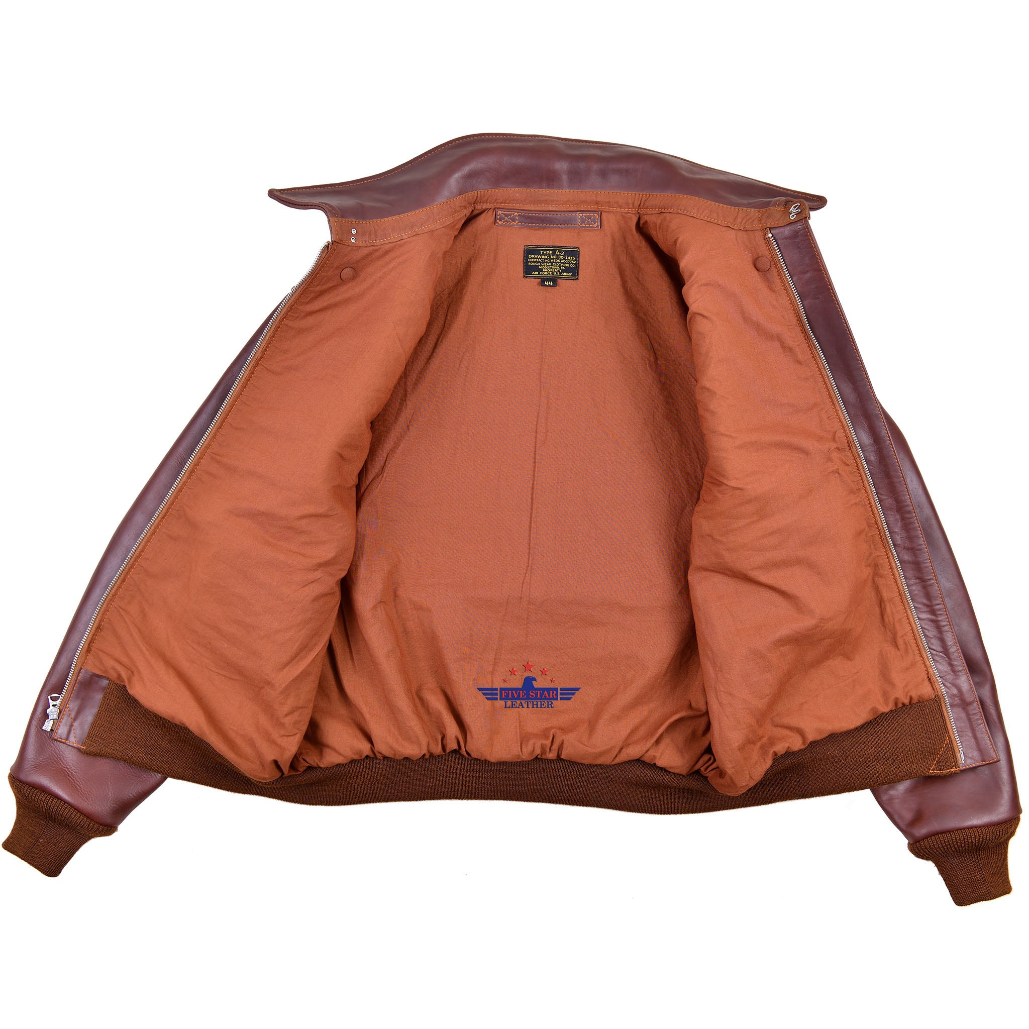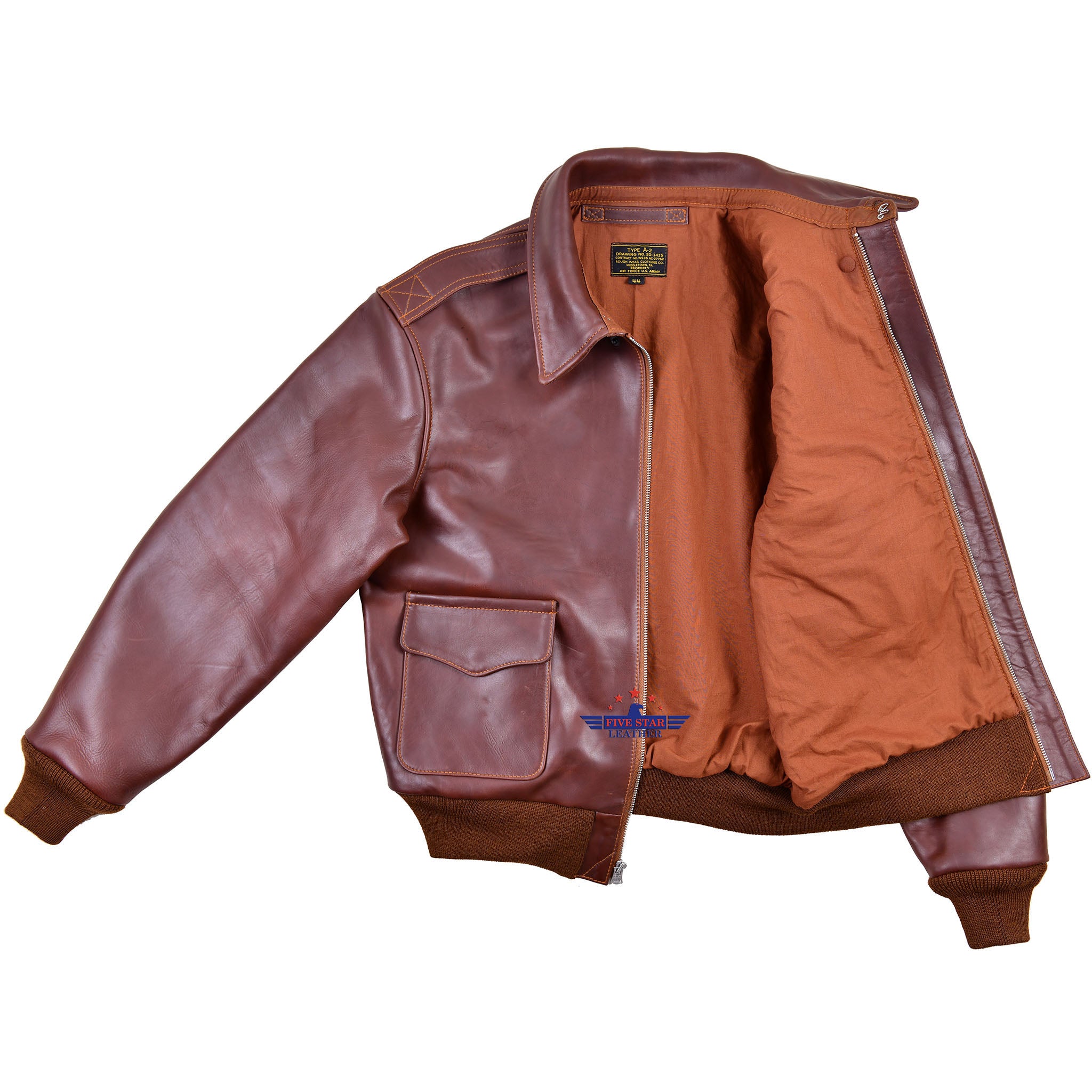 The A2 Leather Flight Jacket by FiveStar Leather for Reproduced Rough Wear Clothing Co. is made with our high-quality Pull Up Brown Horsehide Leather, which has a Leather thickness of 1.2-1.3 mm and is Semi Veg. Tanned for durability. The jacket also features 100% Real wool Knitting's in a Mid Brown color, sourced from the USA. Other colors are available as well. The jacket stays true to its original design with a Repro Talon Front Zipper Fastening and 100% Cotton lining in the accurate color for this specific Contract. It also includes all the authentic pattern details of TYPE A-2 ROUGH WEAR CLOTHING CO. DRAWING NO. 30-1415, CONTRACT NO.W535 AC-27752.