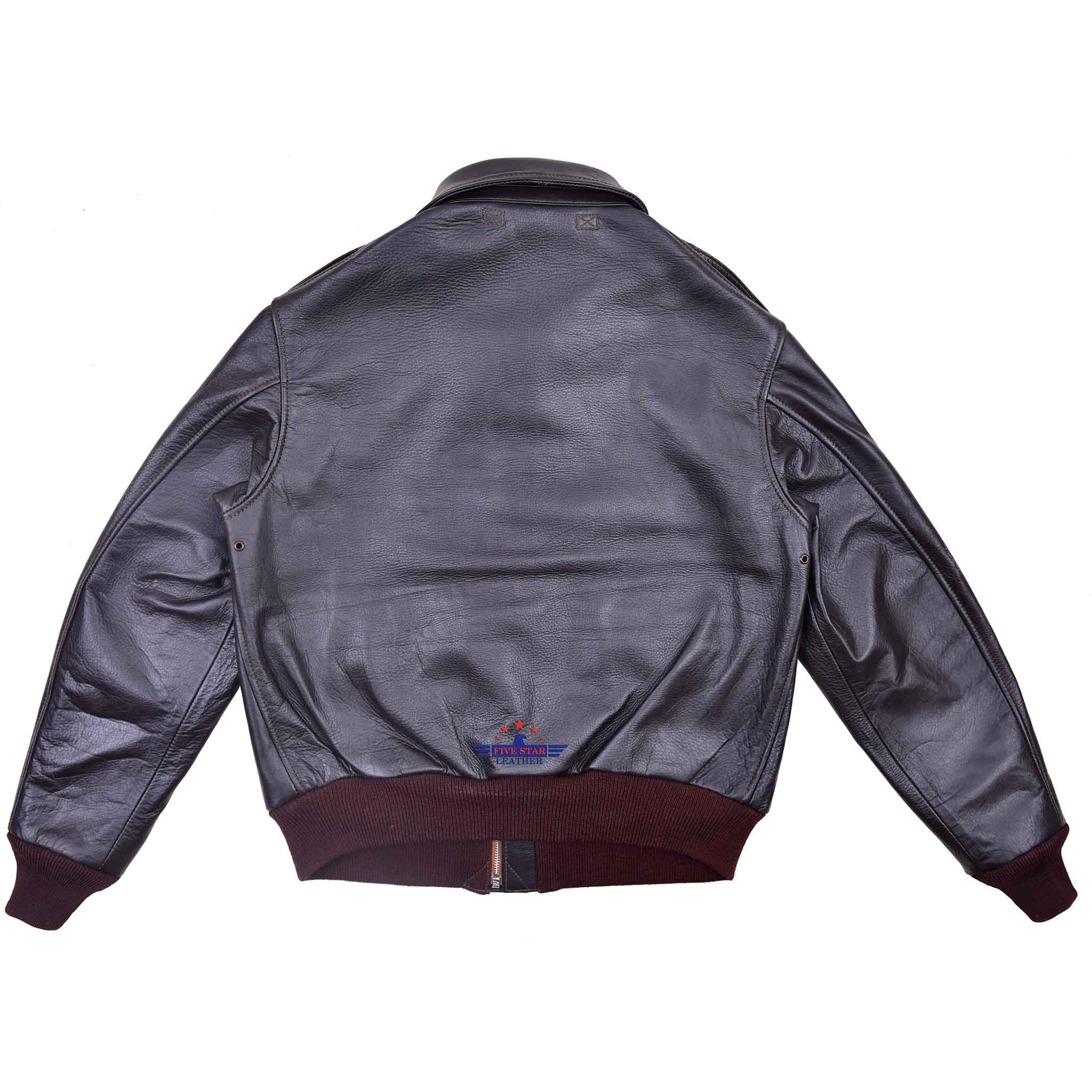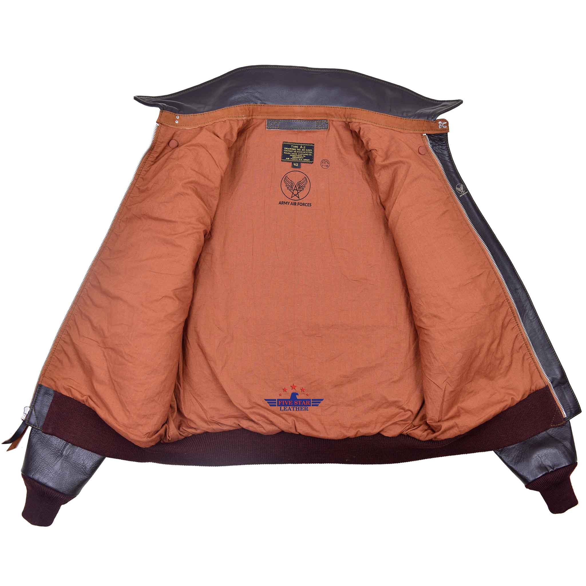 FiveStar Leather Reproduced Rough Wear Clothing Co. Middletown, PA. A2 Leather Flight Jacket made from our Special Seal Brown Horsehide Leather, This Leather is Semi Veg. Tanned and True to Original Color, We use 100% Real wool Knitting's In Dull Purple color made in USA in this jacket, however other knitting colors in Wool are also available, Repro Talon Front Zipper Fastening, 100% Cotton lining true to original Color of this Contract, and this A2 Jacket have the true and Authentic Pattern Details of TYPE A-2 ROUGH WEAR CLOTHING CO. DRAWING NO. 30-1415, CONTRACT NO.W535 AC-27752