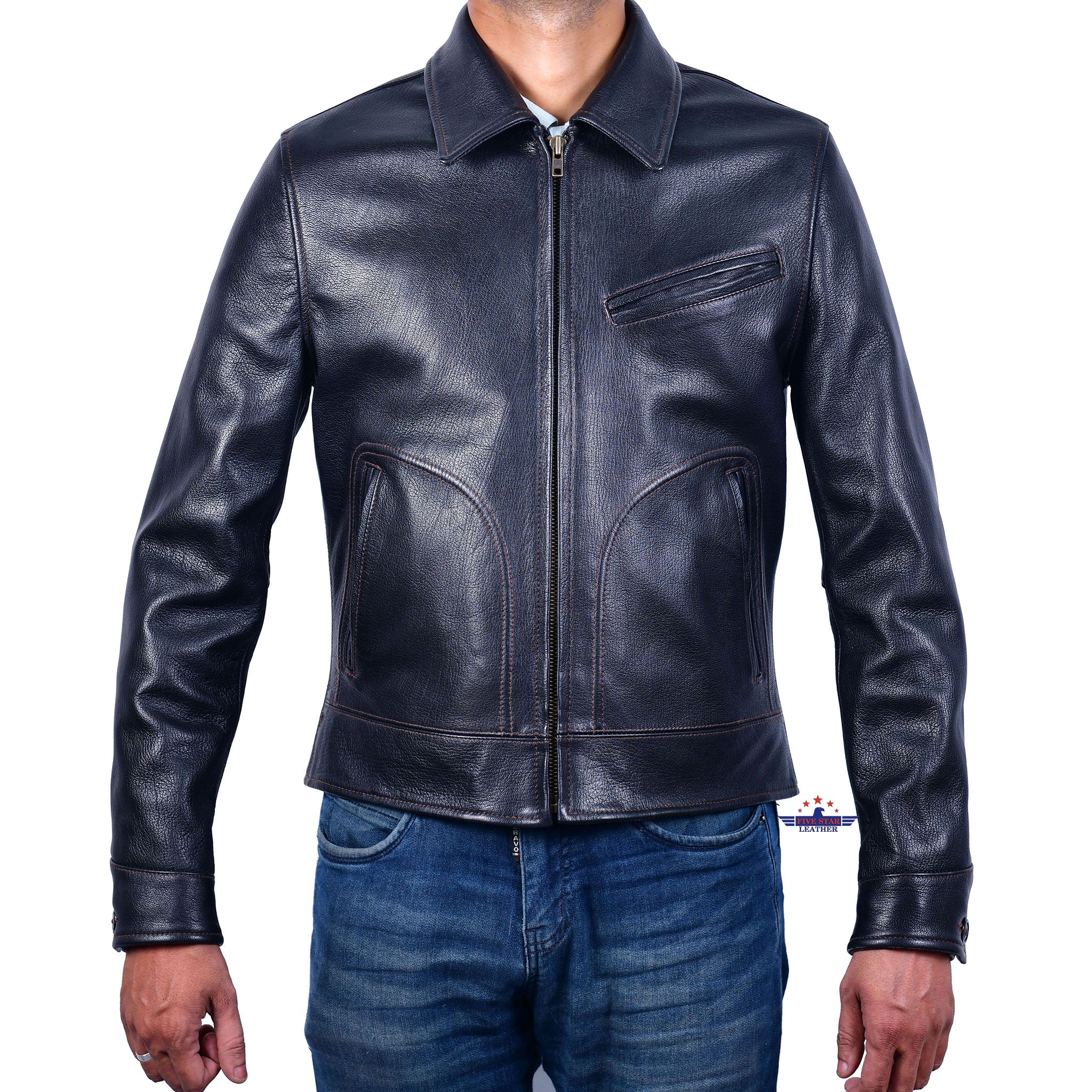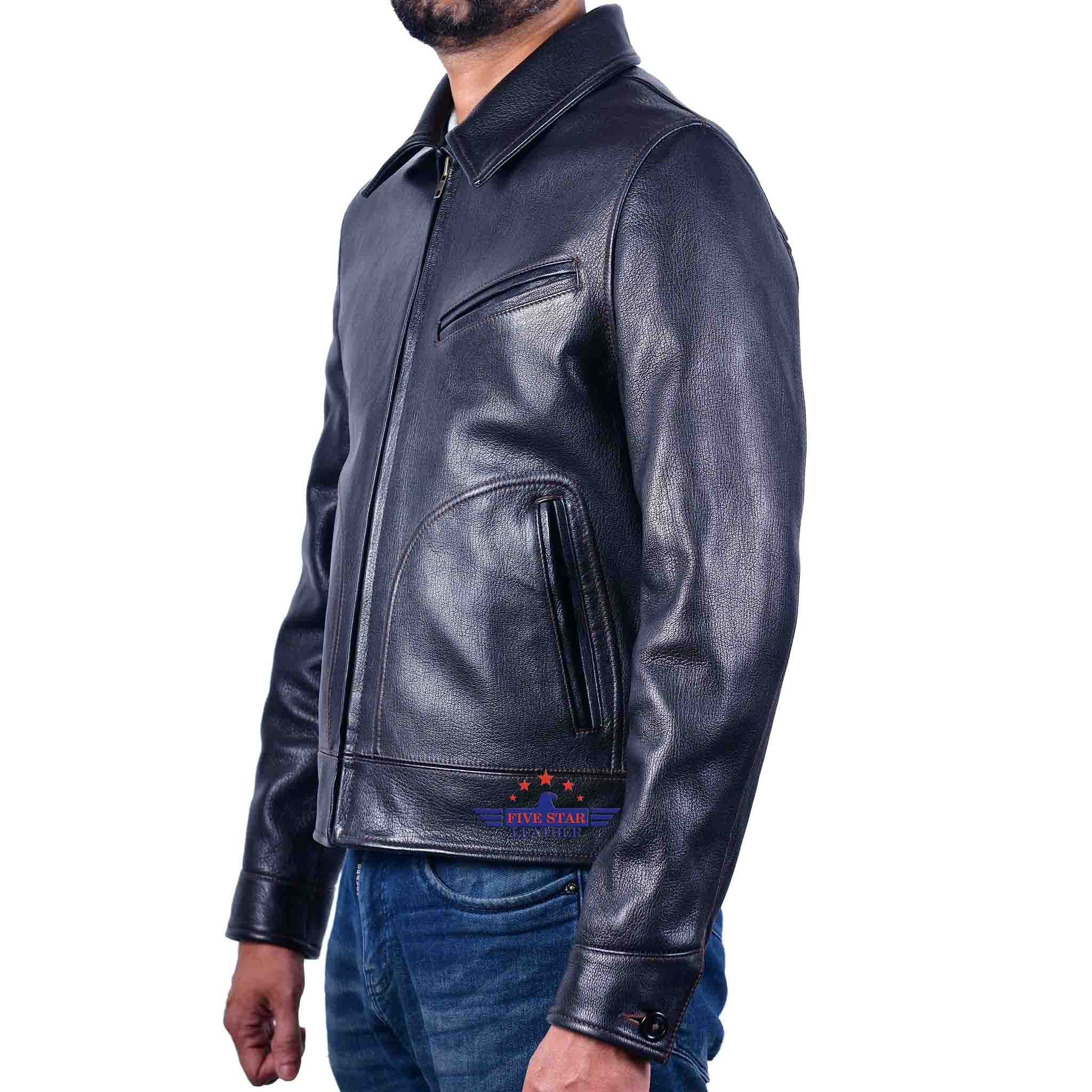 The FIVESTAR LEATHER ROAD MASTER RIDER'S JACKET FOR MEN is expertly crafted from high-quality goatskin semi veg. tanned leather in a sleek black color. Its 100% cotton drill lining and real horn buttons on the cuff provide durability and style. Secure your essentials in the one chest and two side pockets, as well as the inside lining pocket. This hand-made garment features fine and outclass stitching, along with a high-quality brass zipper for added functionality. This is a Handmade waxed Garment to make this soft and unique.