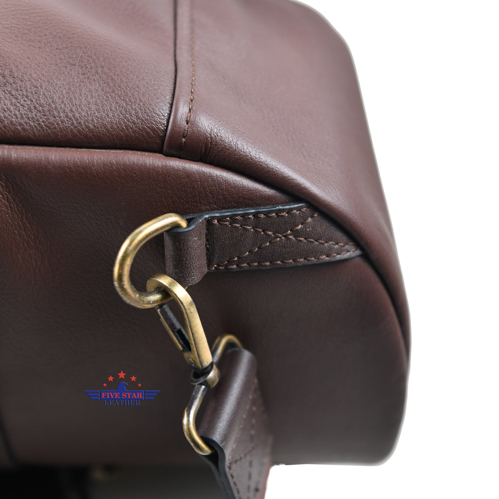 Crafted by FiveStar Leather, this premium travel bag features genuine steerhide leather with a thickness of 1.3 mm in a rich russet brown shade. Equipped with durable brass hardware and a YKK No. 8 double slider zipper, it ensures long-lasting use. Versatile in design, it functions as a travel bag, motorbike tank bag, luggage, backpack, or laptop bag, providing reliable support for all your carrying needs.