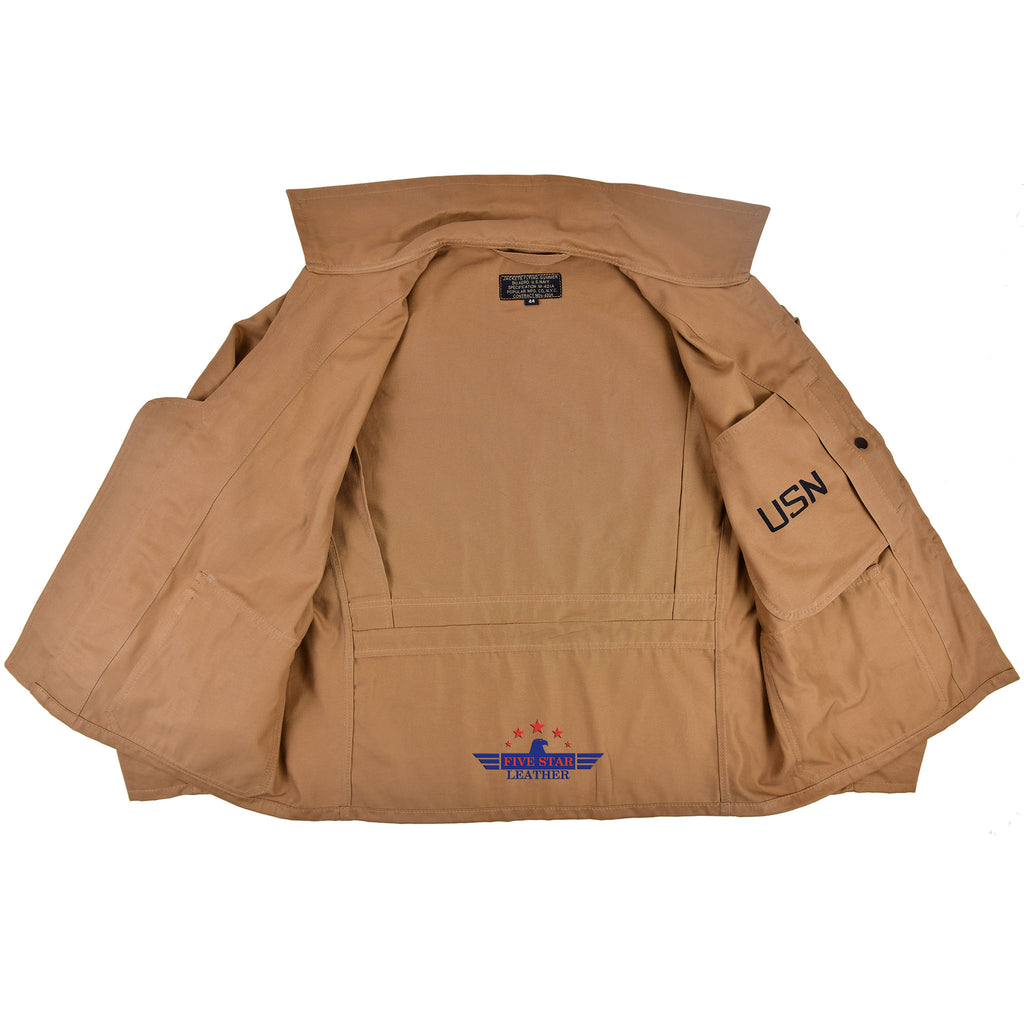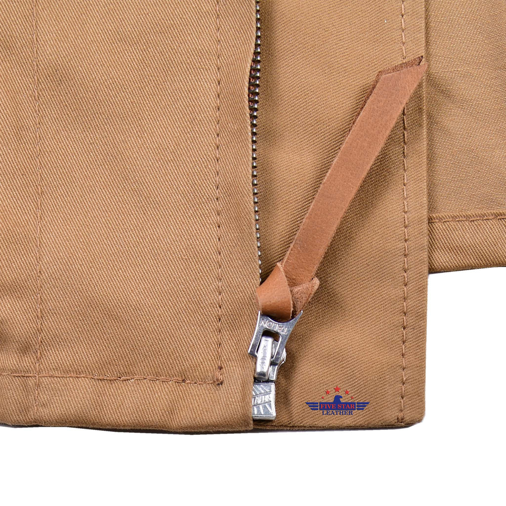 The FiveStar Leather Repro U.S. NAVY M421A Summer Flight Jacket features genuine, high-quality cotton fabric in a tan color. It includes a front Talon zipper for secure closure and showcases precise, durable stitching. Available in all sizes, this jacket carries an authentic military label for a true vintage feel.