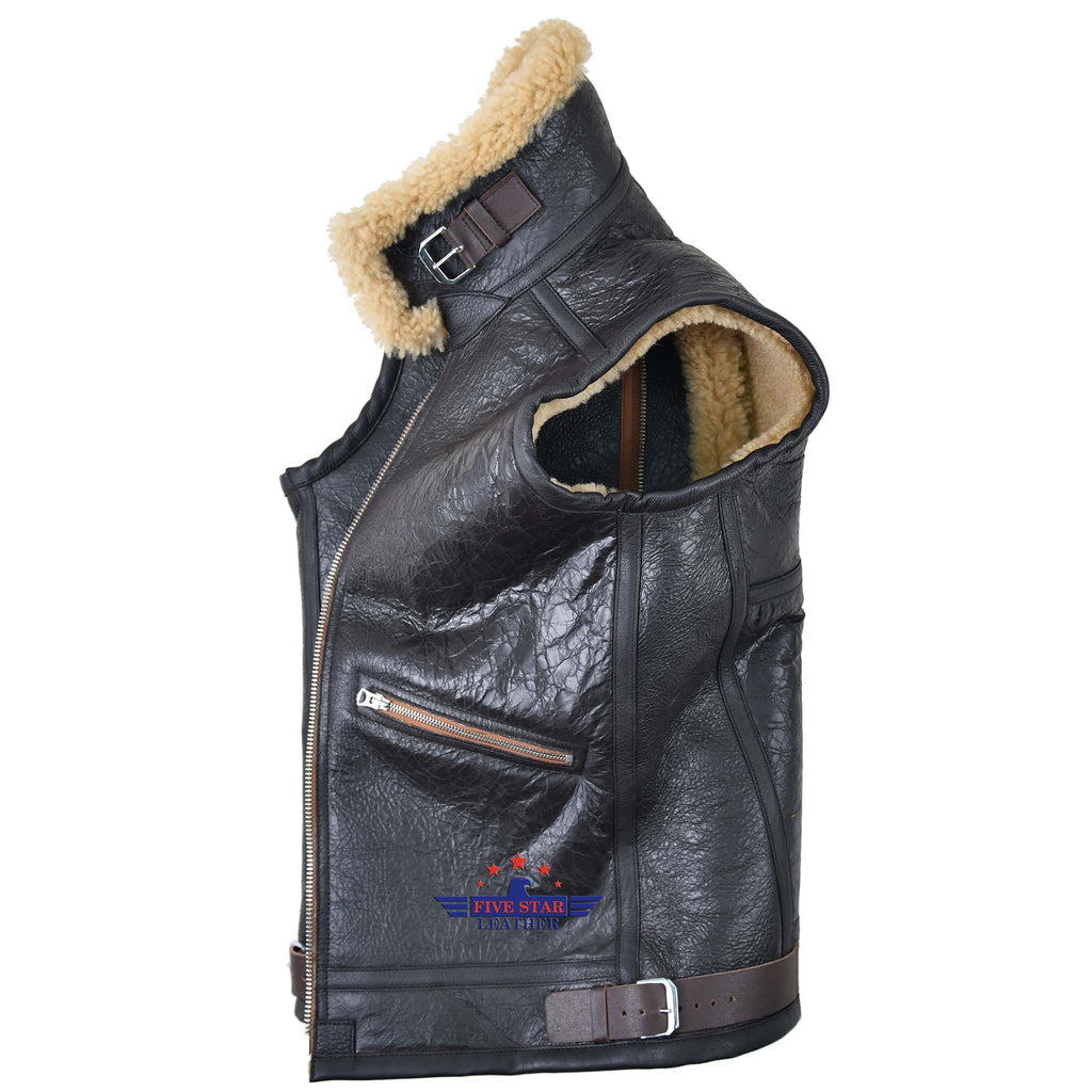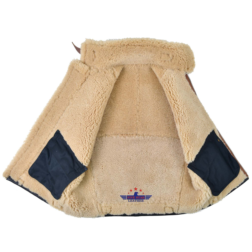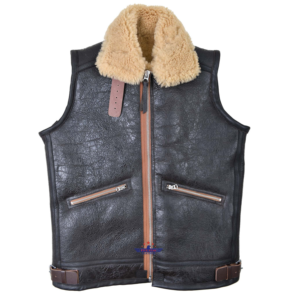 FiveStar Leather B3 Vest with Side Entry Zippers Pockets made from Real and High Quality Sheepskin, Front Repro Talon Zipper Fastening, Collar strap, side Adjustment Belts, Front B3 Styled Pocket, Real Steer hide Leather seal Brown Facings, Fleece thickness is 22 mm, this is a luxury Vest available in different sizes