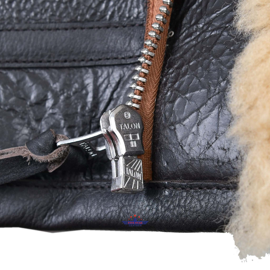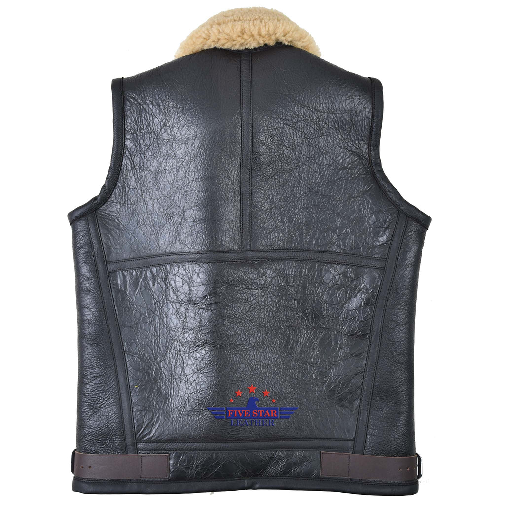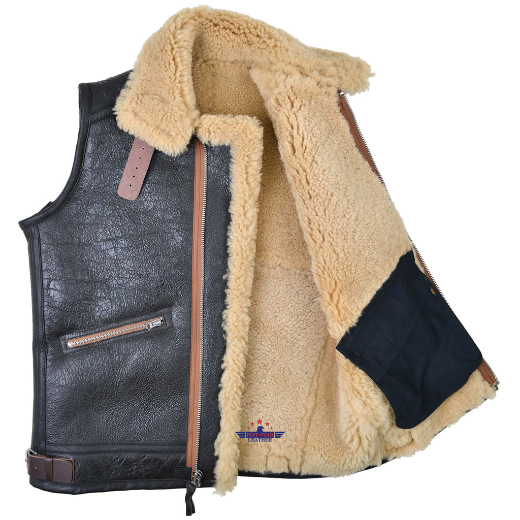 FiveStar Leather B3 Vest with Side Entry Zippers Pockets made from Real and High Quality Sheepskin, Front Repro Talon Zipper Fastening, Collar strap, side Adjustment Belts, Front B3 Styled Pocket, Real Steer hide Leather seal Brown Facings, Fleece thickness is 22 mm, this is a luxury Vest available in different sizes