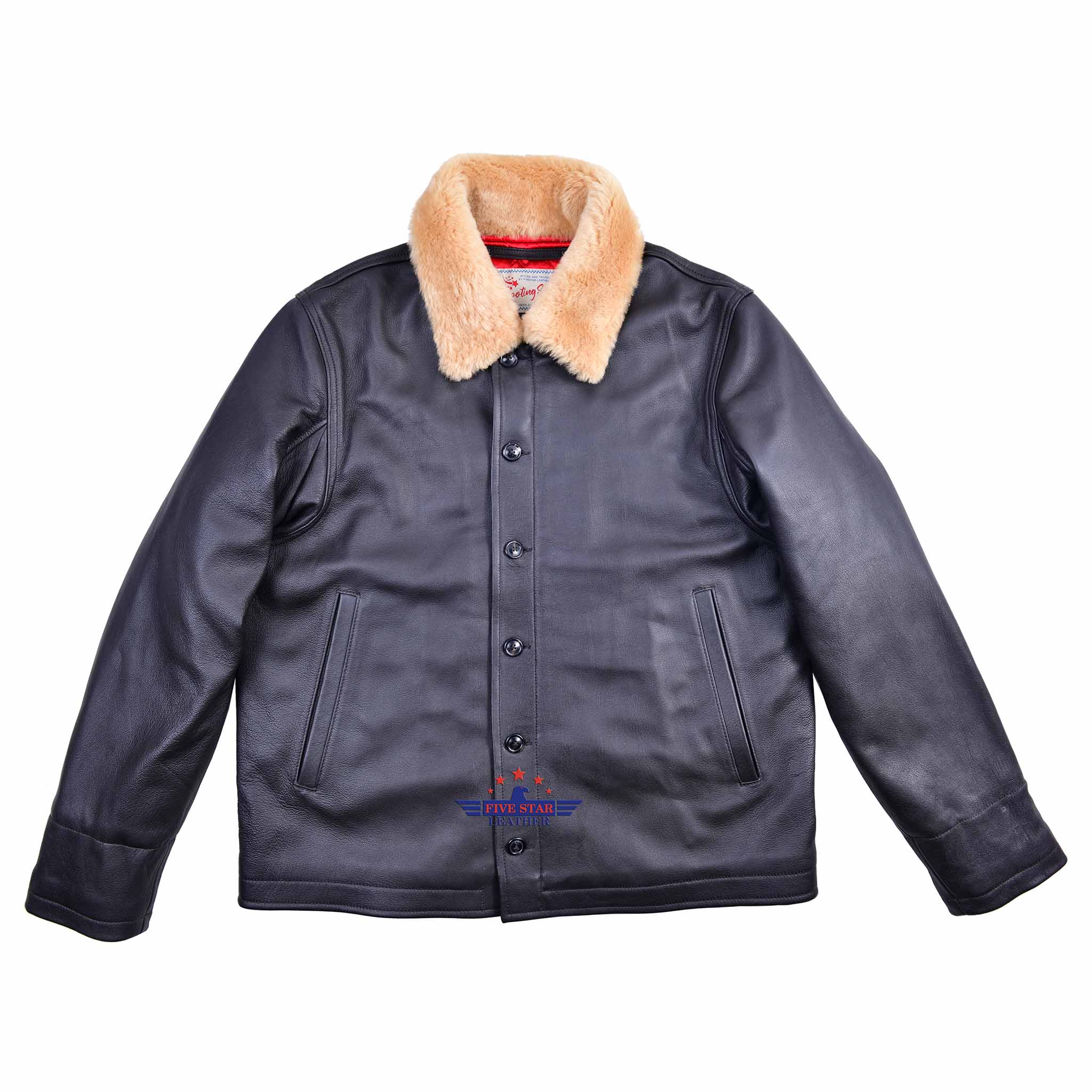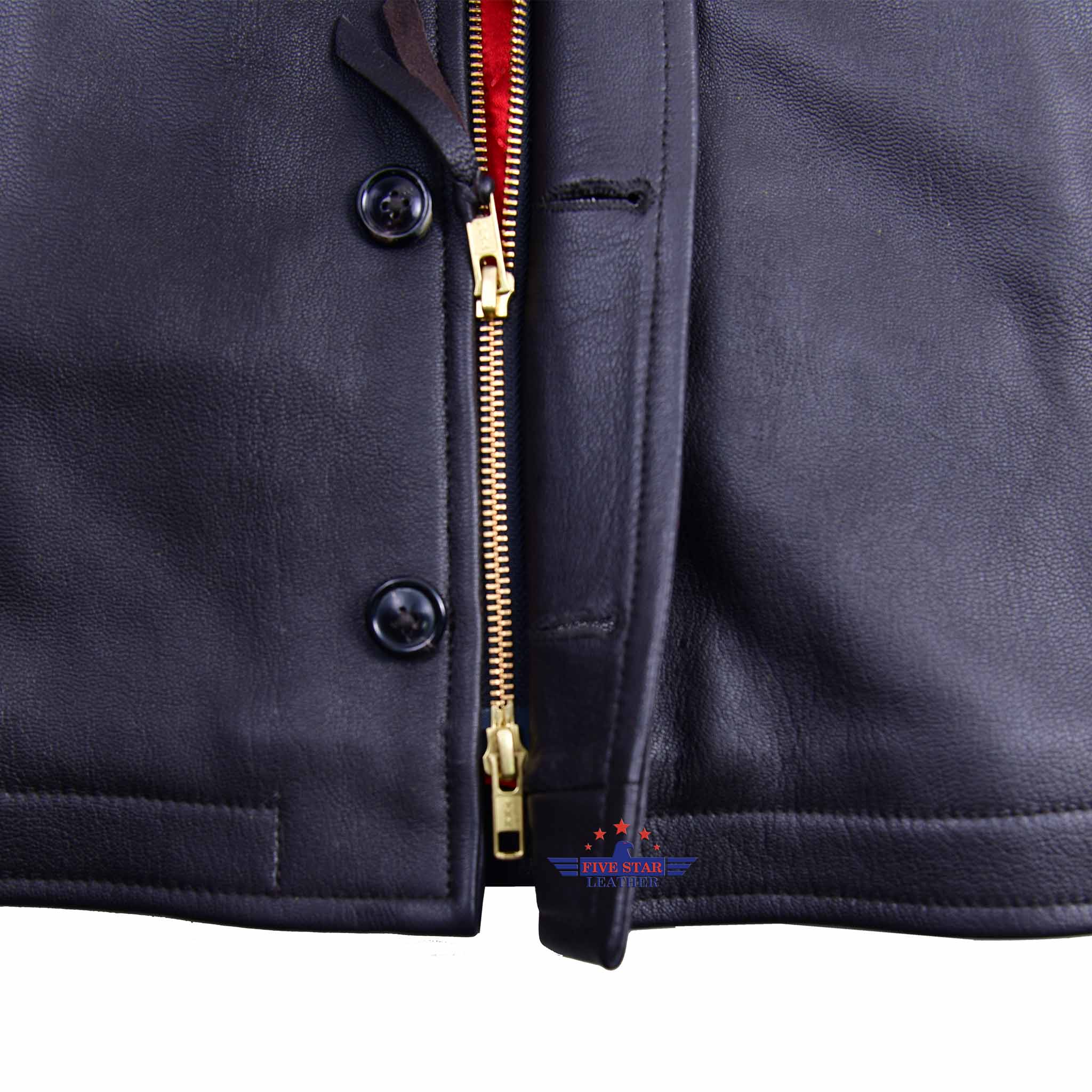 FiveStar Leather Repro N1 Deck Flight Jacket, Made from Real and High Quality Goatskin Seal Brown Leather semi Veg Tanned with a Leather thickness of 1.2mm, Front Dual Closure with Real Horn Buttons and Double slider Golden Brass High Quality Double Slider zippers, Warm and Quilted Lining in Red color, this jacket has real Mouton Fur Collar in Blonde color, this jacket also have the storm cuff.