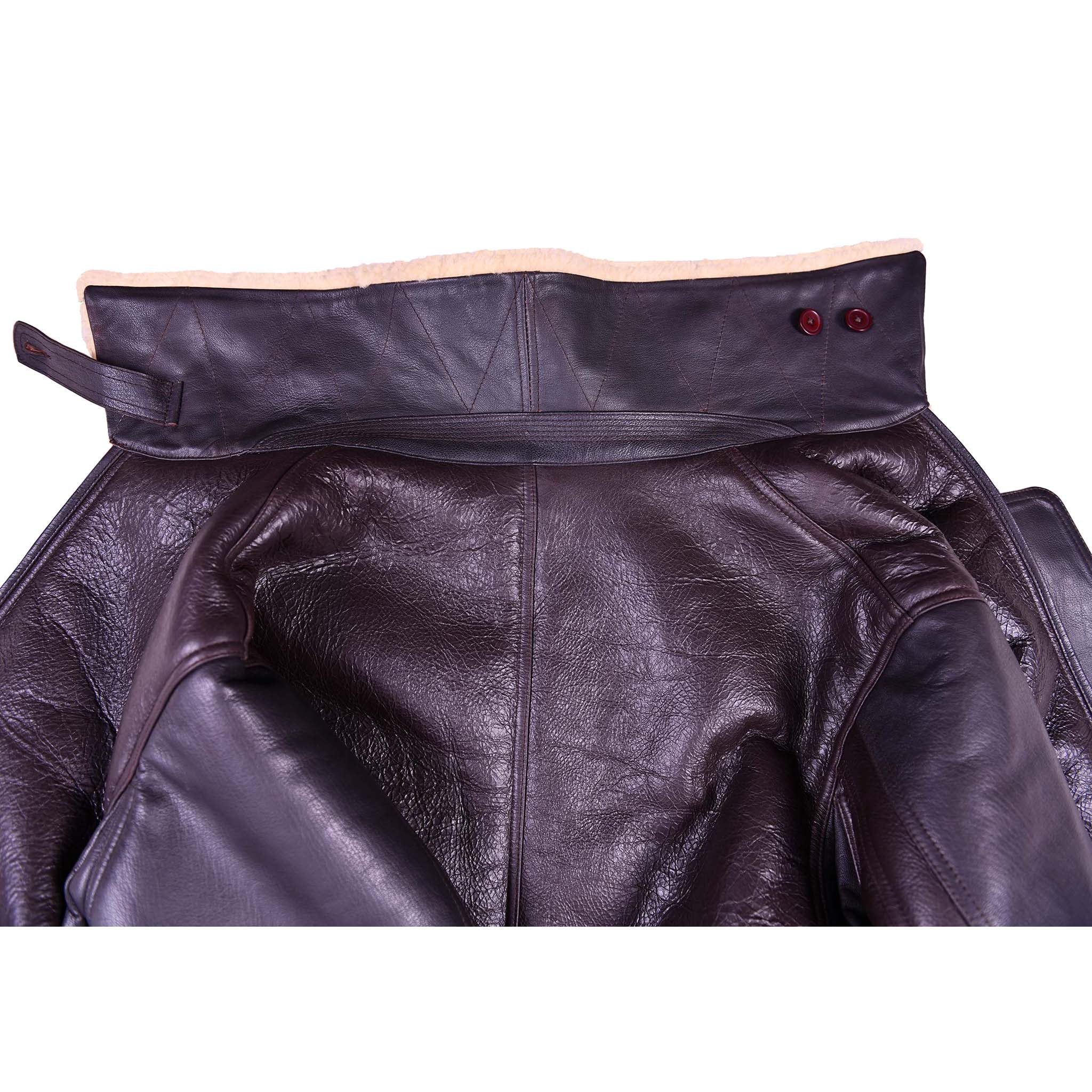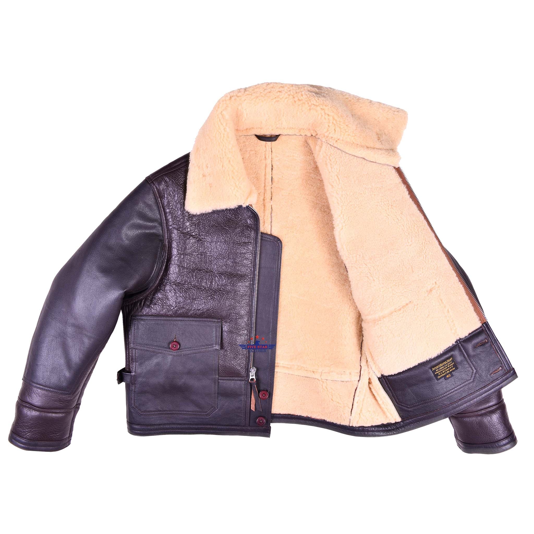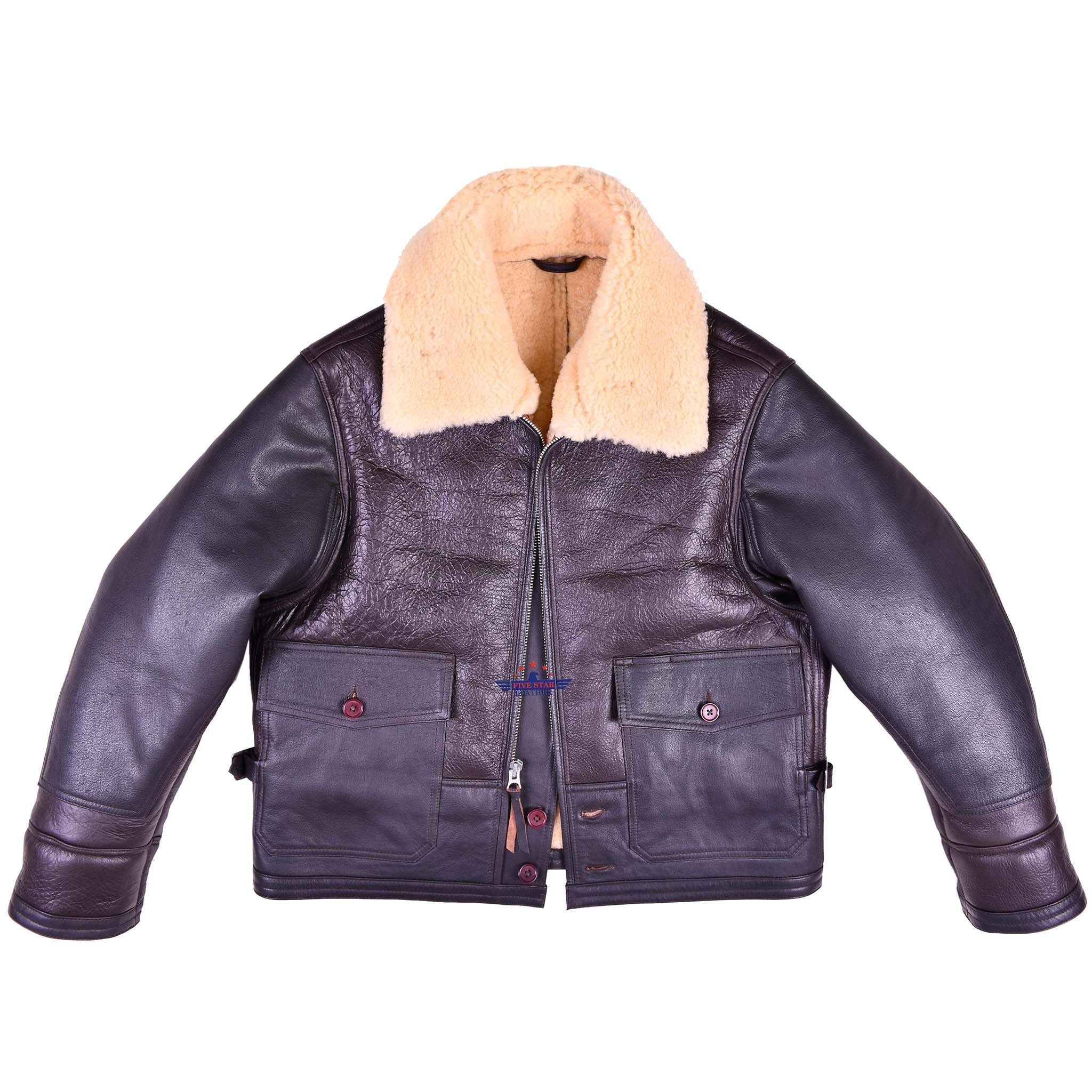 JACKETS, WINTER, HEAVY, Bu AERO- U.S. NAVY, SPECIFICATION M-445 A, Made from Real and High Quality Sheepskin Leather. It features button closures at the front pockets and middle waist, carries leather strap and brass buckle side adjusters, HAVE REPRO talon zipper FASTENING, A nice REPRODUCTION example of a very rare, original U.S. WWII Navy Sheepskin Winter Flight Jacket M-445A