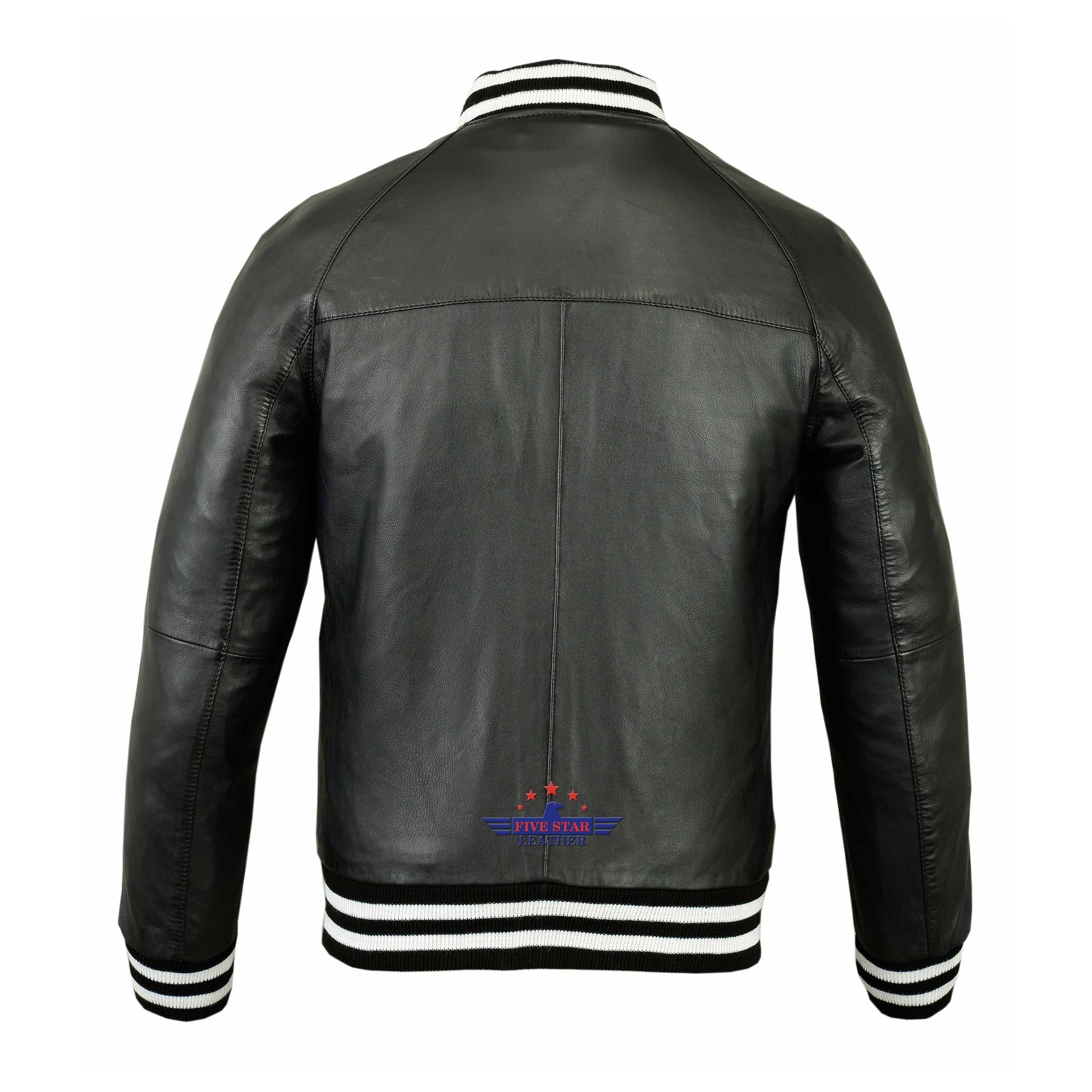 Expertly crafted with high quality genuine sheepskin leather, this varsity baseball bomber jacket features black wool ribbed cuffs, collar, and bottom, along with a distinctive front zip fastening. Handmade with a waxed finish for a soft and trendy feel, this jacket also boasts a fine polyester lining and impeccable stitching. Stocked in all sizes and available in a variety of styles and colors, this jacket is a top choice for those seeking a premium, one-of-a-kind garment.