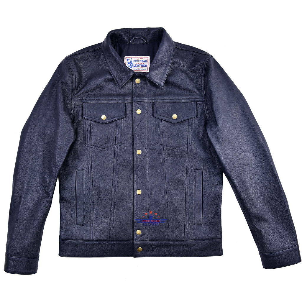 Men Trucker Real Black Goatskin Classic Western Denim Style Leather Black Jacket
