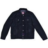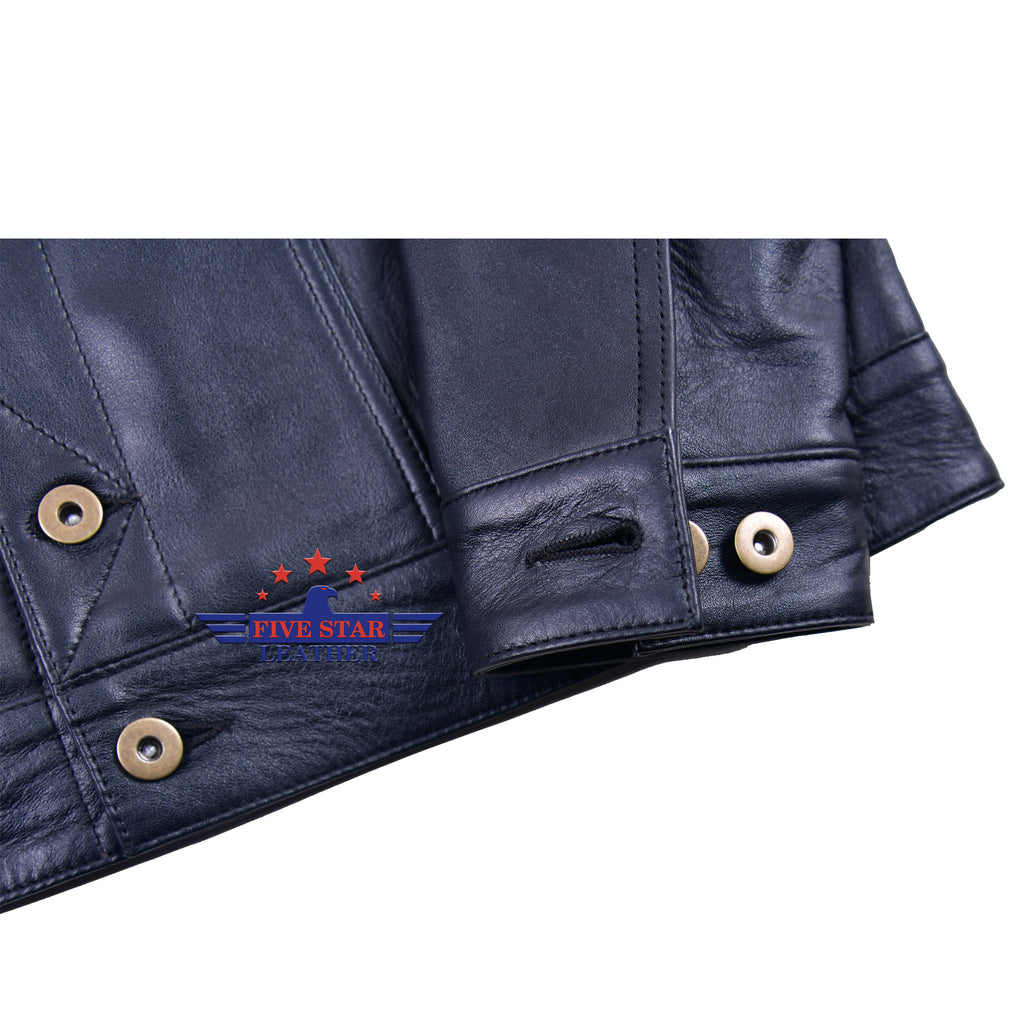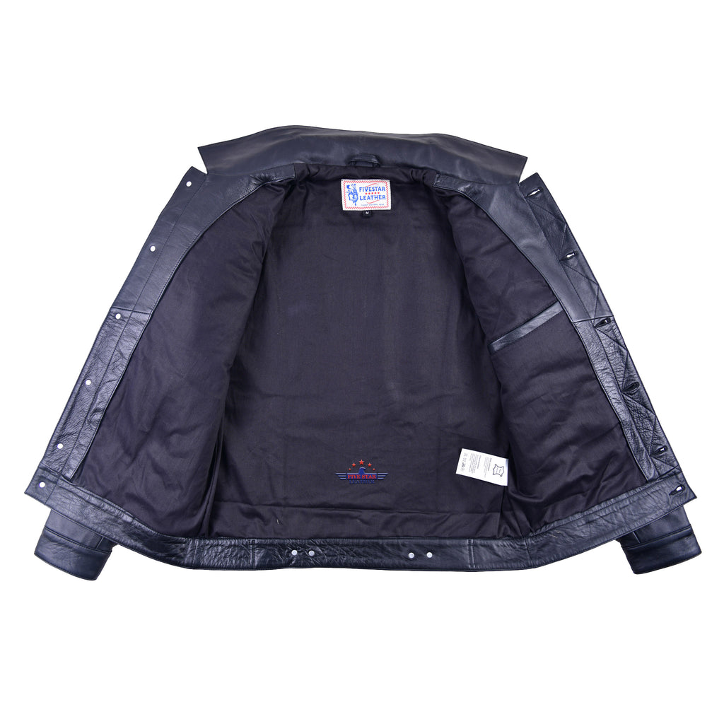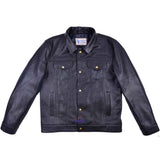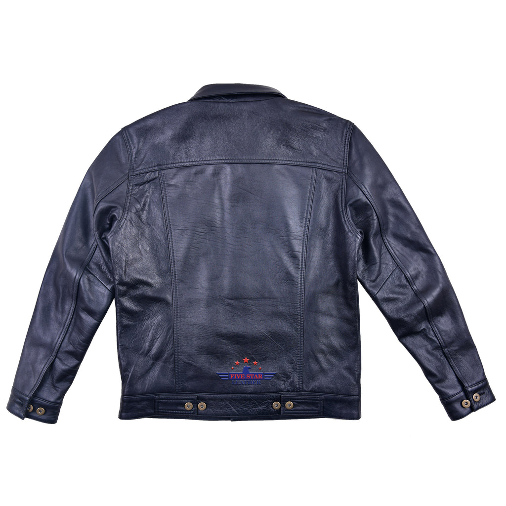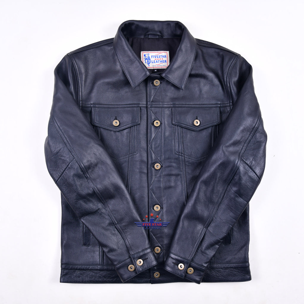 FiveStar Leather presents the Vintage Trucker Jacket crafted from genuine, high-quality black horsehide leather. Featuring semi vegetable tanning and a leather thickness of 1.2mm, this jacket includes two chest flap pockets, two side pockets, and a front button closure. It is lined with durable black cotton twill and offers an inside pocket for convenience. Custom sizing is available upon request to ensure the perfect fit.
