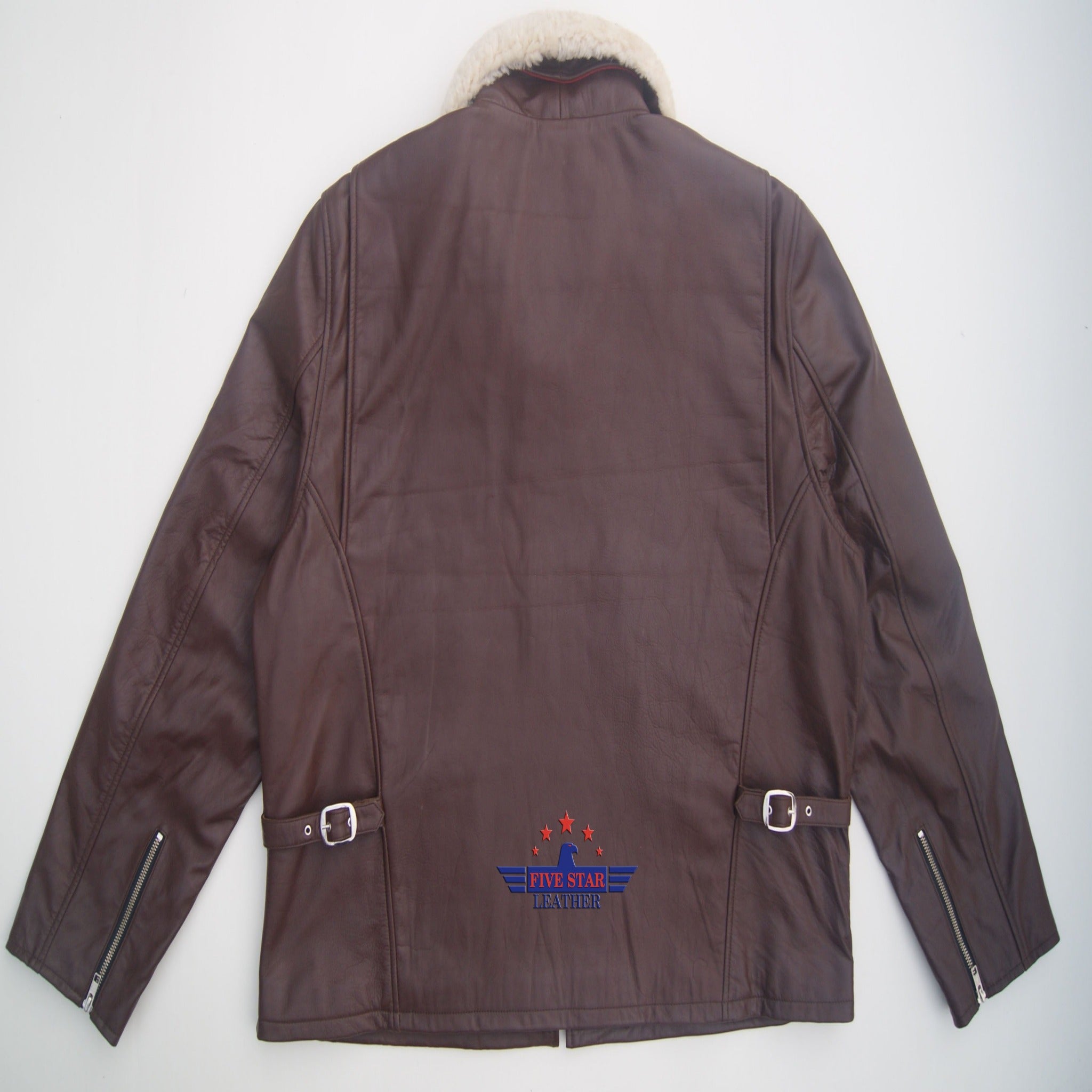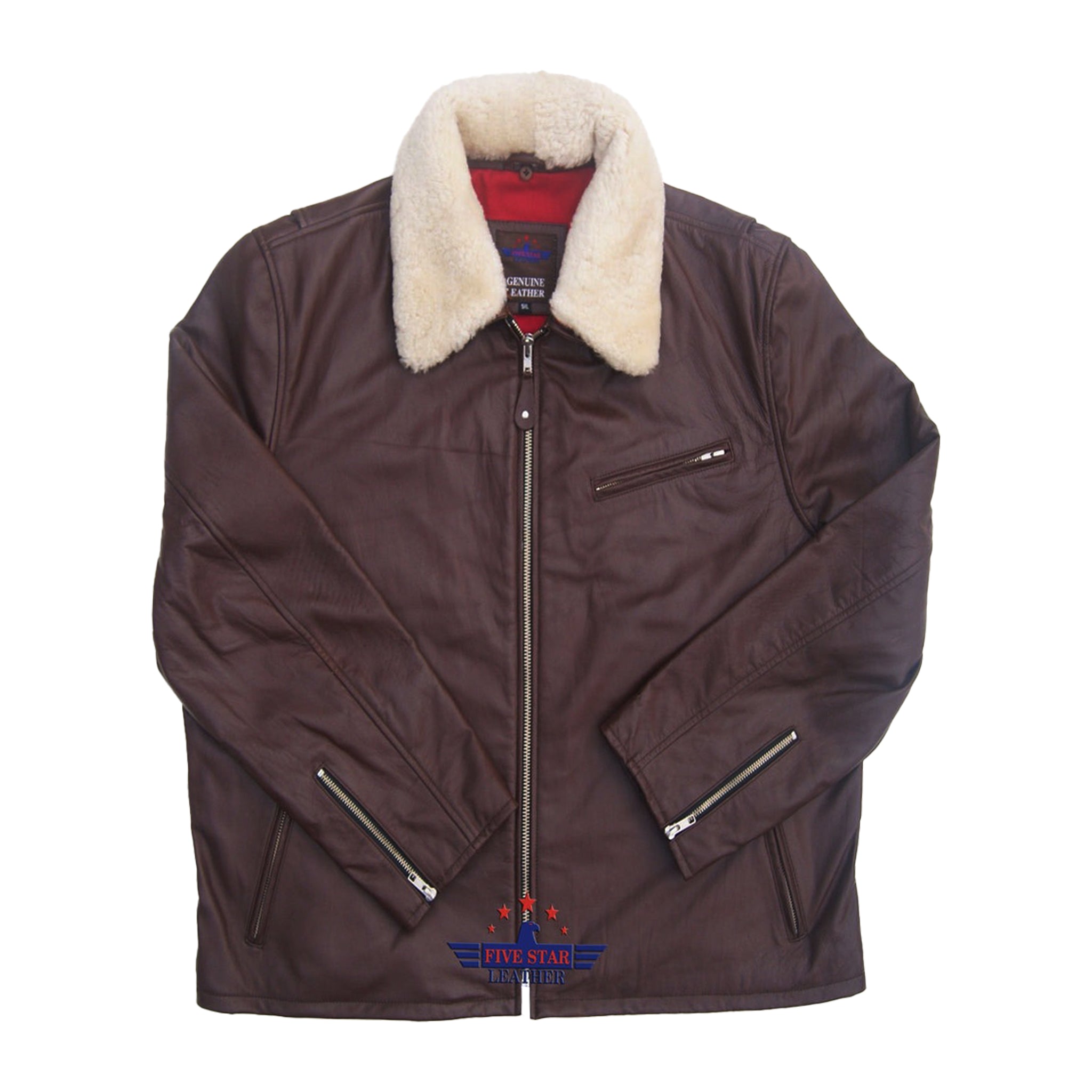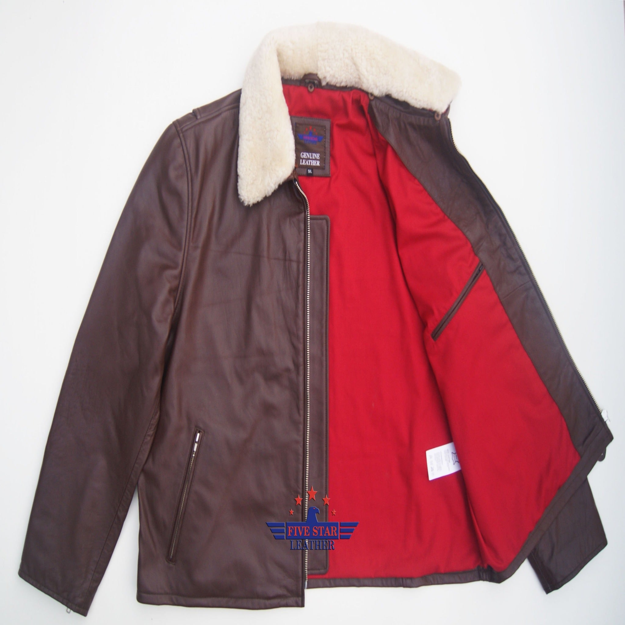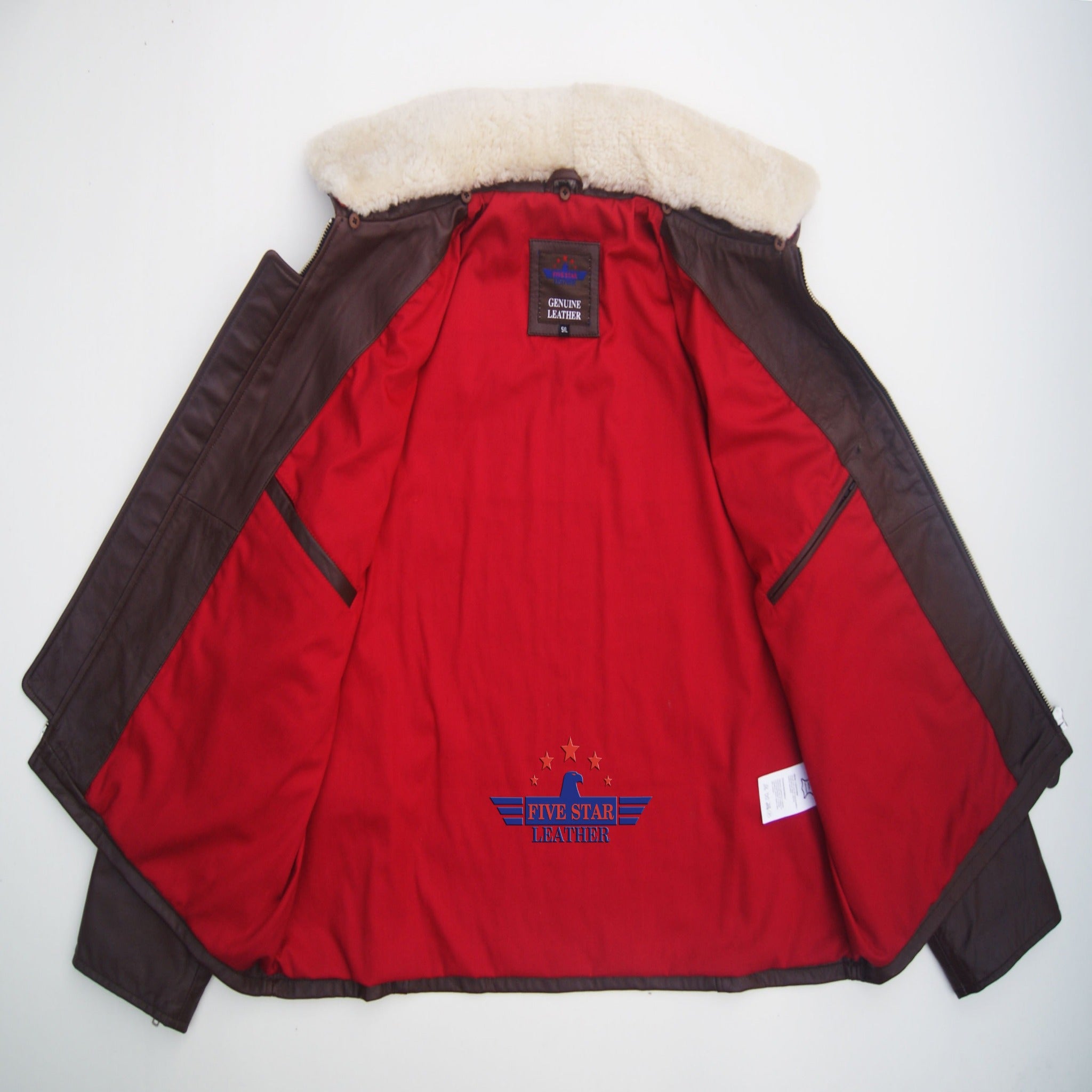 Crafted from premium "A" grade horsehide leather, this men's vintage military flight jacket offers genuine quality and durability. It features a real mouton fur collar and a sturdy Talon front zipper. Designed with two slash pockets and a red cotton twill lining, it combines classic style with comfort. Available in all sizes with meticulous stitching to ensure lasting wear.