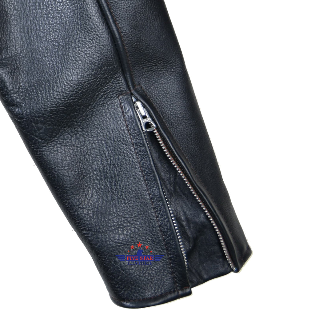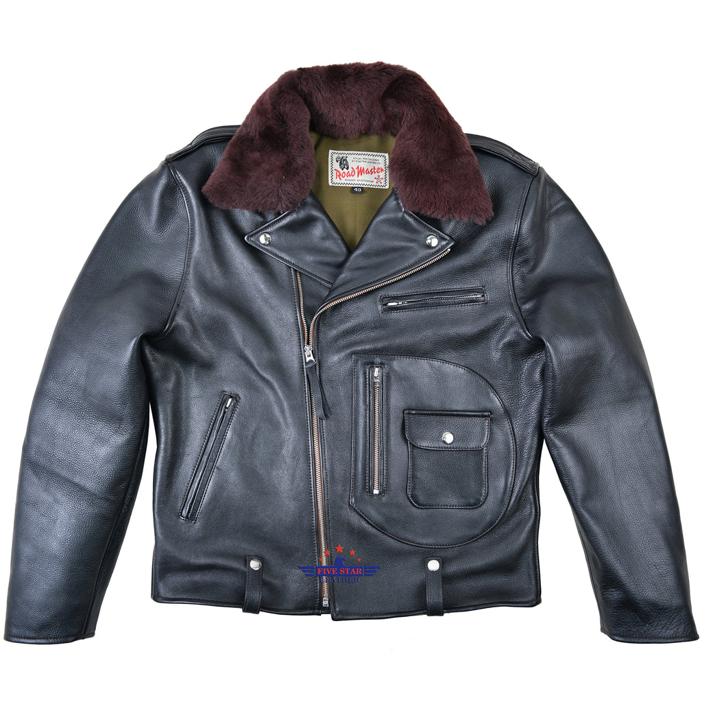 This FiveStar Leather Vintage D Pocket Road Master Men Jacket is crafted from premium black steerhide leather. It includes a detachable reddish russet brown mouton collar for added style. Featuring classic vintage Talon zippers and a distinctive d pocket design, the jacket is lined with durable and comfortable olive green cotton twill. The asymmetrical zipper closure enhances its timeless look. Available in all standard sizes with custom sizing options upon request, this jacket combines quality and versatility for lasting wear.