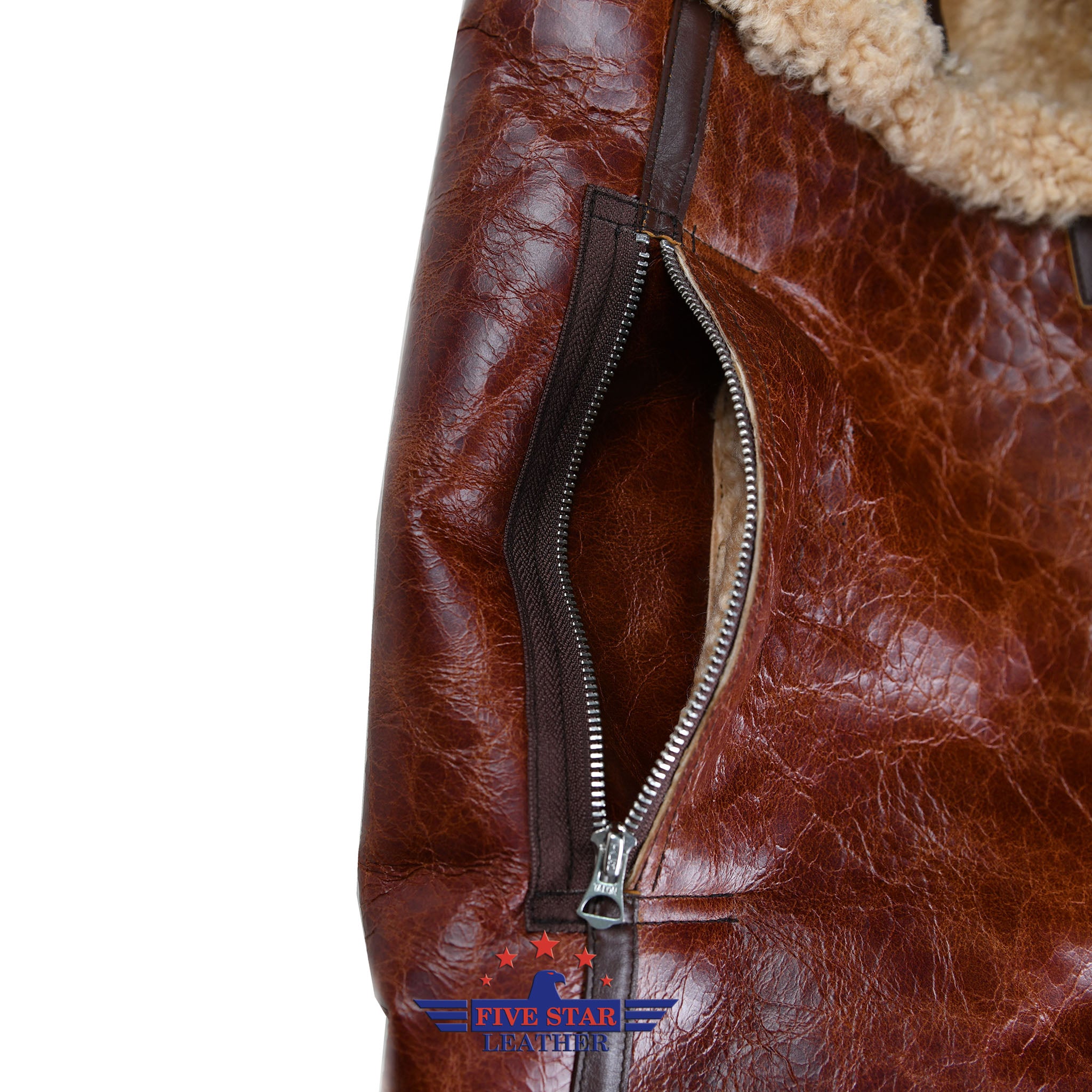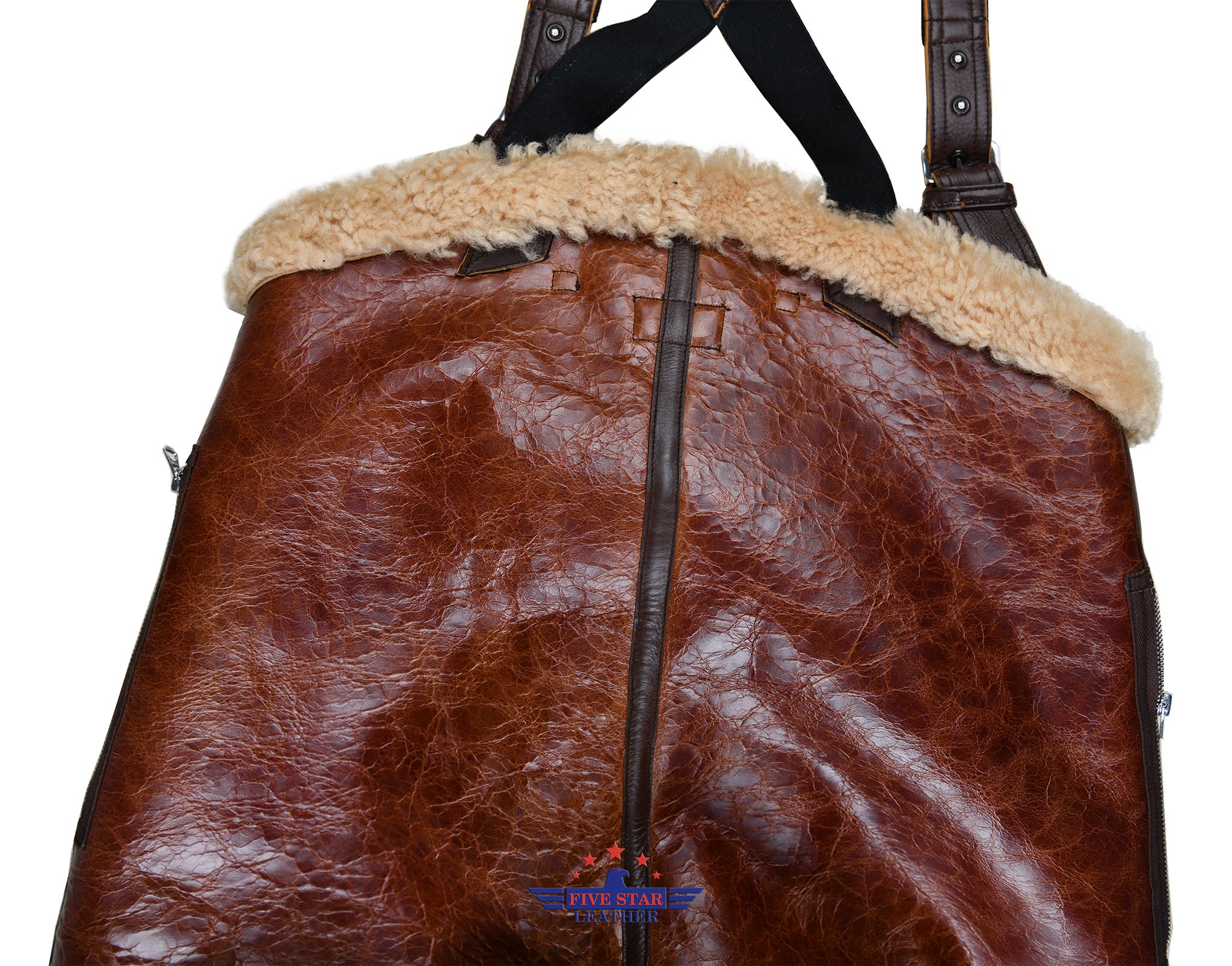 Originally designed to complement B-3 Flight Jackets for Army Air Force personnel, these authentic FiveStar Leather Repro WWII USAAF Type A-3 Winter Reddish Brown Flying Trousers are a must-have for any aviation enthusiast. Their DTM Sheepskin outer shell, 22mm fleece lining, and Long Talon Zippers, along with adjustable straps and high-quality brass buckles with a Nickle finish, provide both style and functionality. With Reddish Brown Horsehide Trims and a correct Woven Label, these trousers offer unparalleled authenticity. Available in custom sizes 38 - 46 with a no return policy.