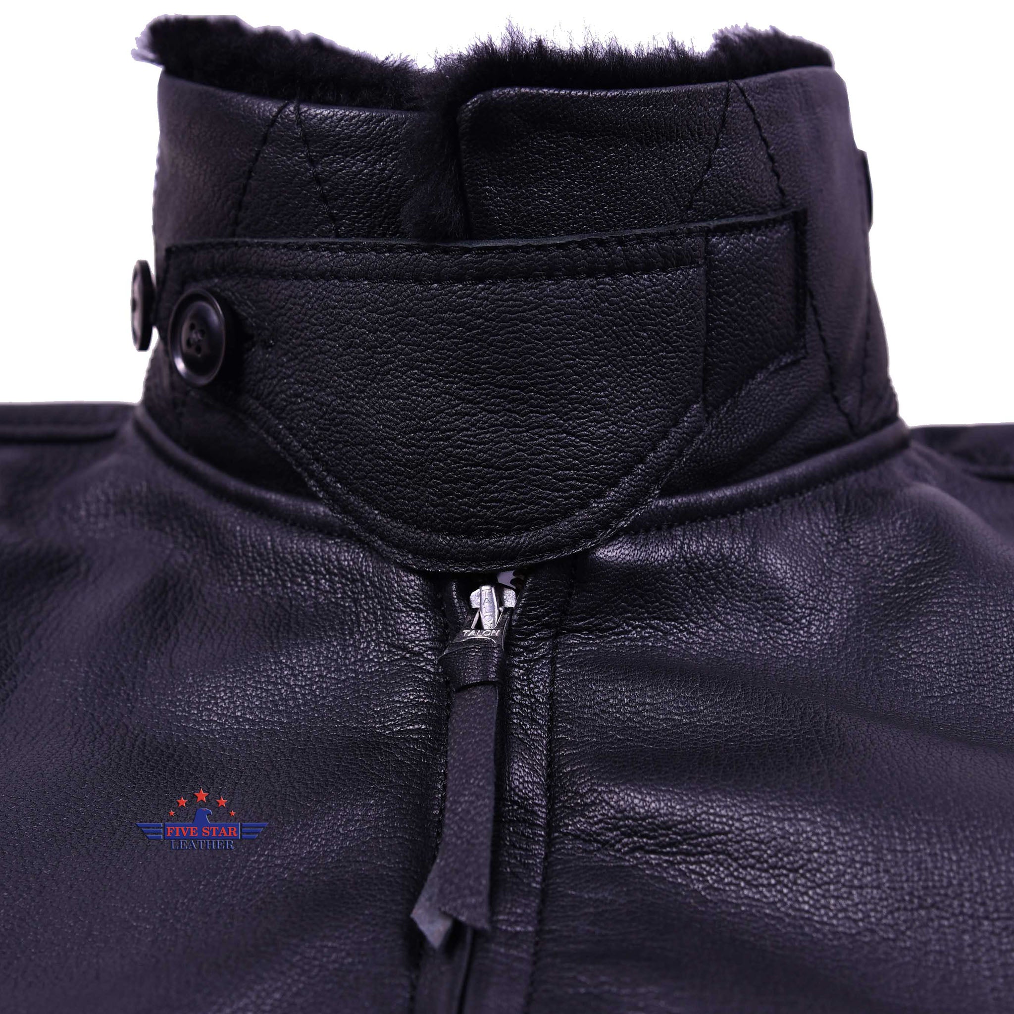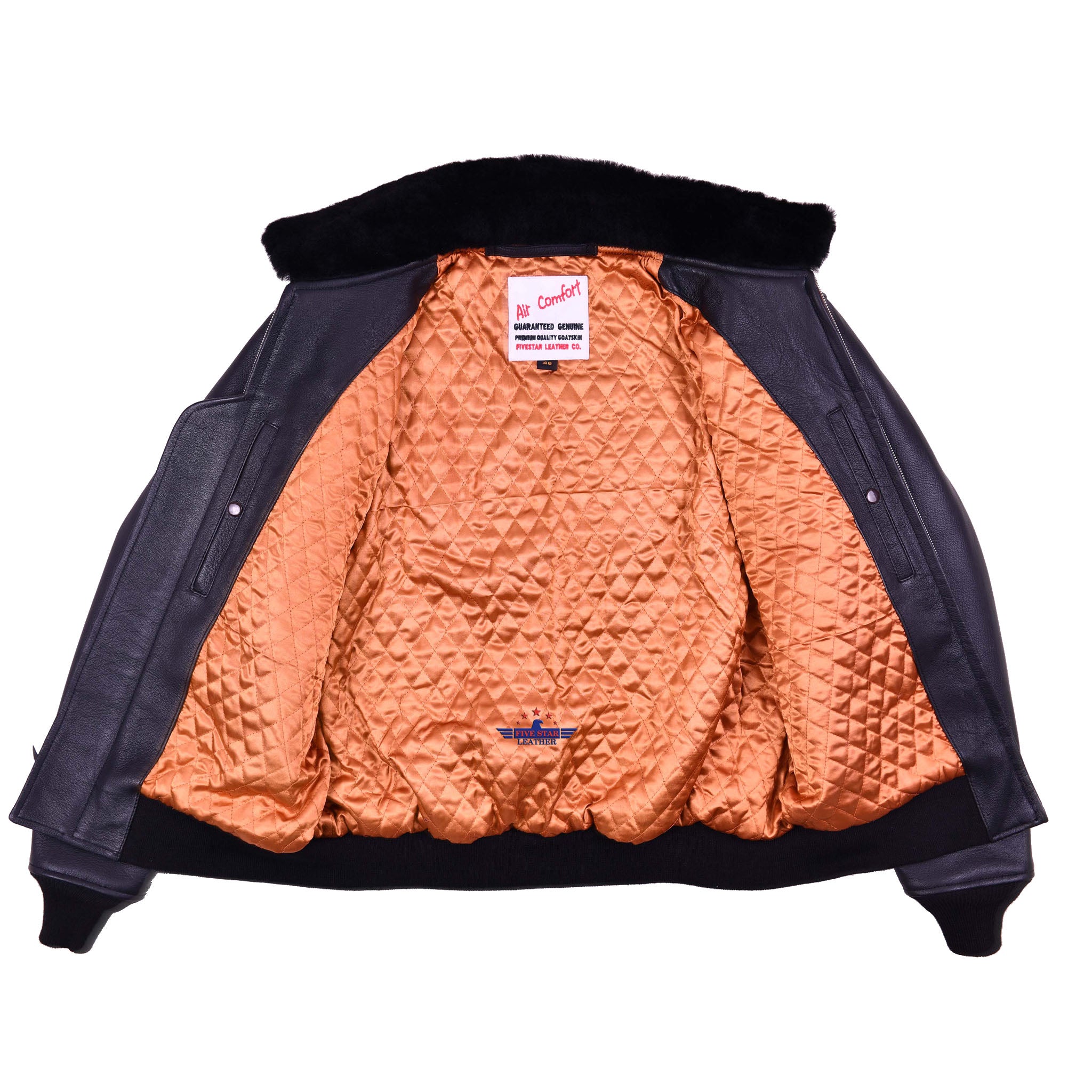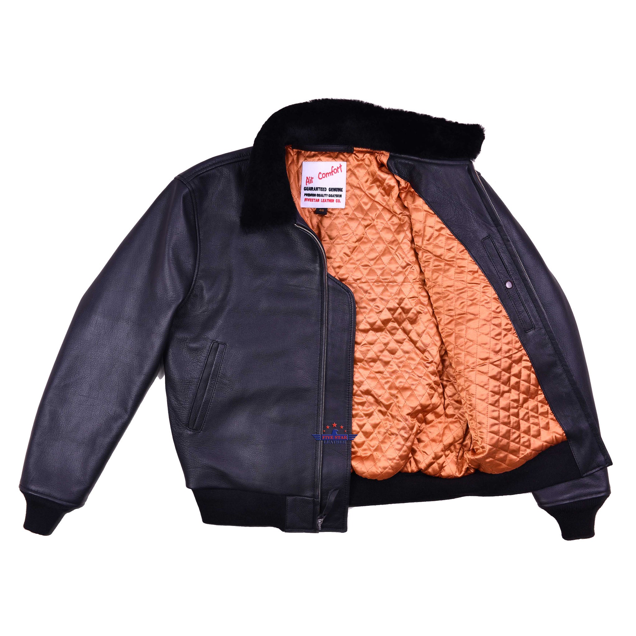 This premium "A" grade jacket is crafted from genuine, high-quality goatskin leather in sleek black. It features a sturdy front zipper, two side pockets, and two inner pockets with button closures for secure storage. Designed with soft ribbed cuffs and hem, it offers a comfortable fit. The jacket includes a warm, quilted 100% polyester lining and an elegant mouton fur collar. Expert stitching ensures durability, and a full range of sizes and additional styles and colors are readily available.