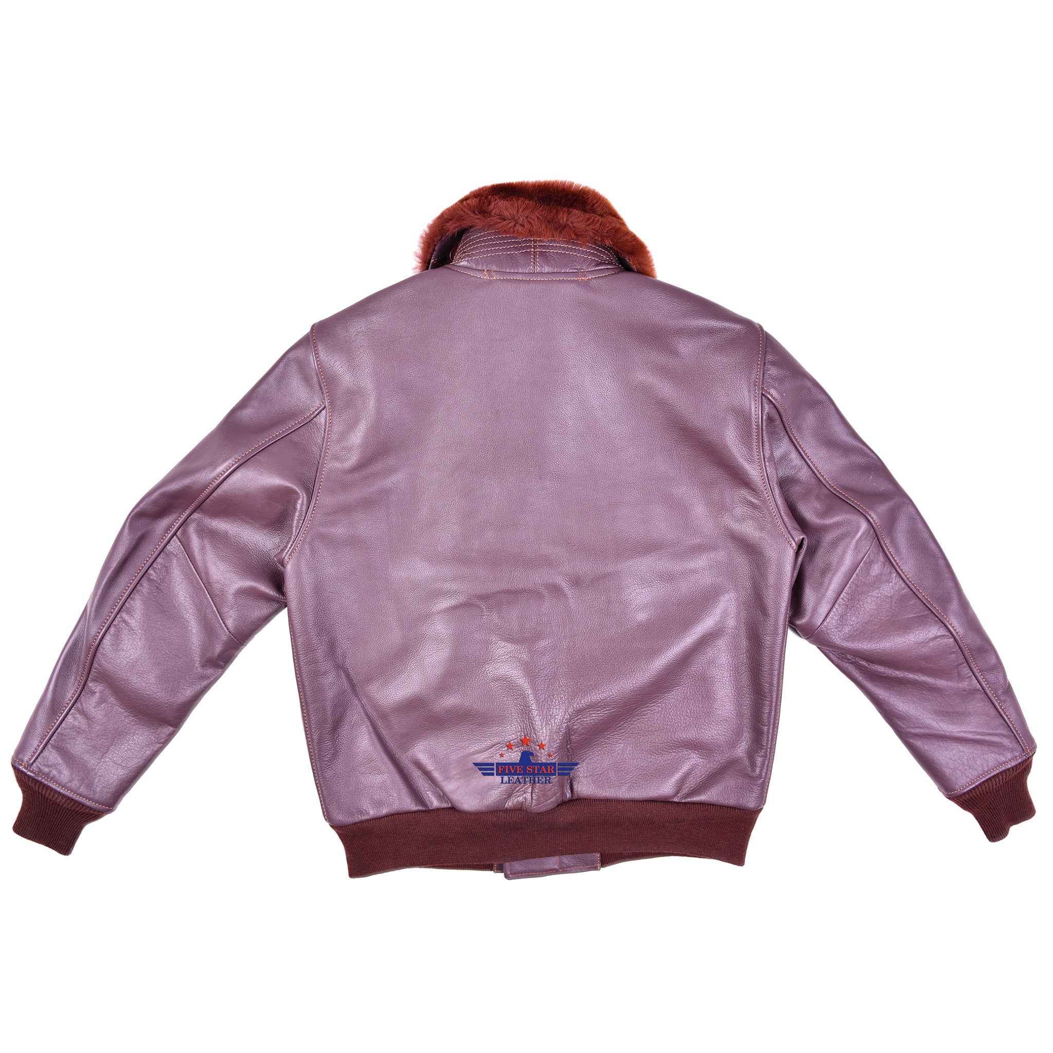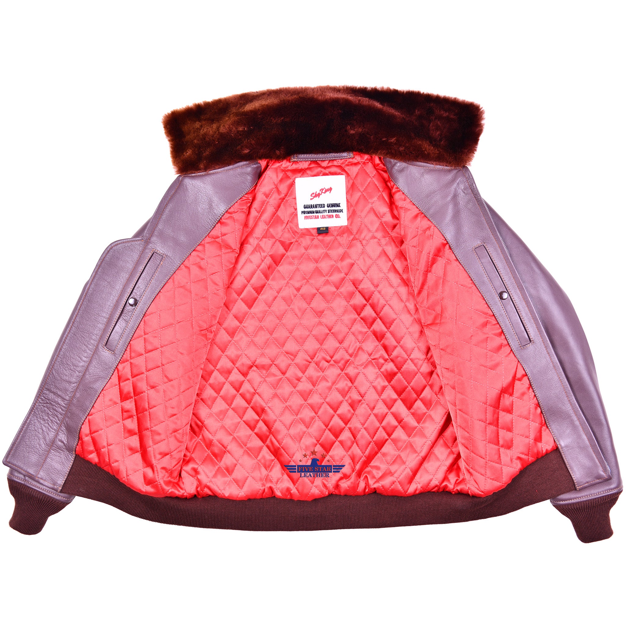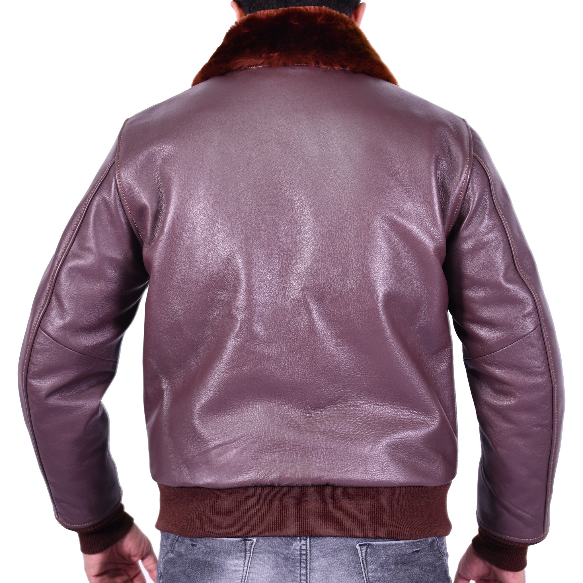 This top-grade leather jacket is crafted from genuine steerhide, featuring a sturdy front talon zipper and two convenient side pockets. It boasts a real mouton fur collar and two inside snap-button pockets for added security. The soft russet brown ribbed cuffs and hem provide comfort, while the warm quilted lining made of 100% polyester ensures coziness. Expert stitching highlights its quality construction. Available in all sizes, this jacket combines authenticity with vintage style for a timeless look.
