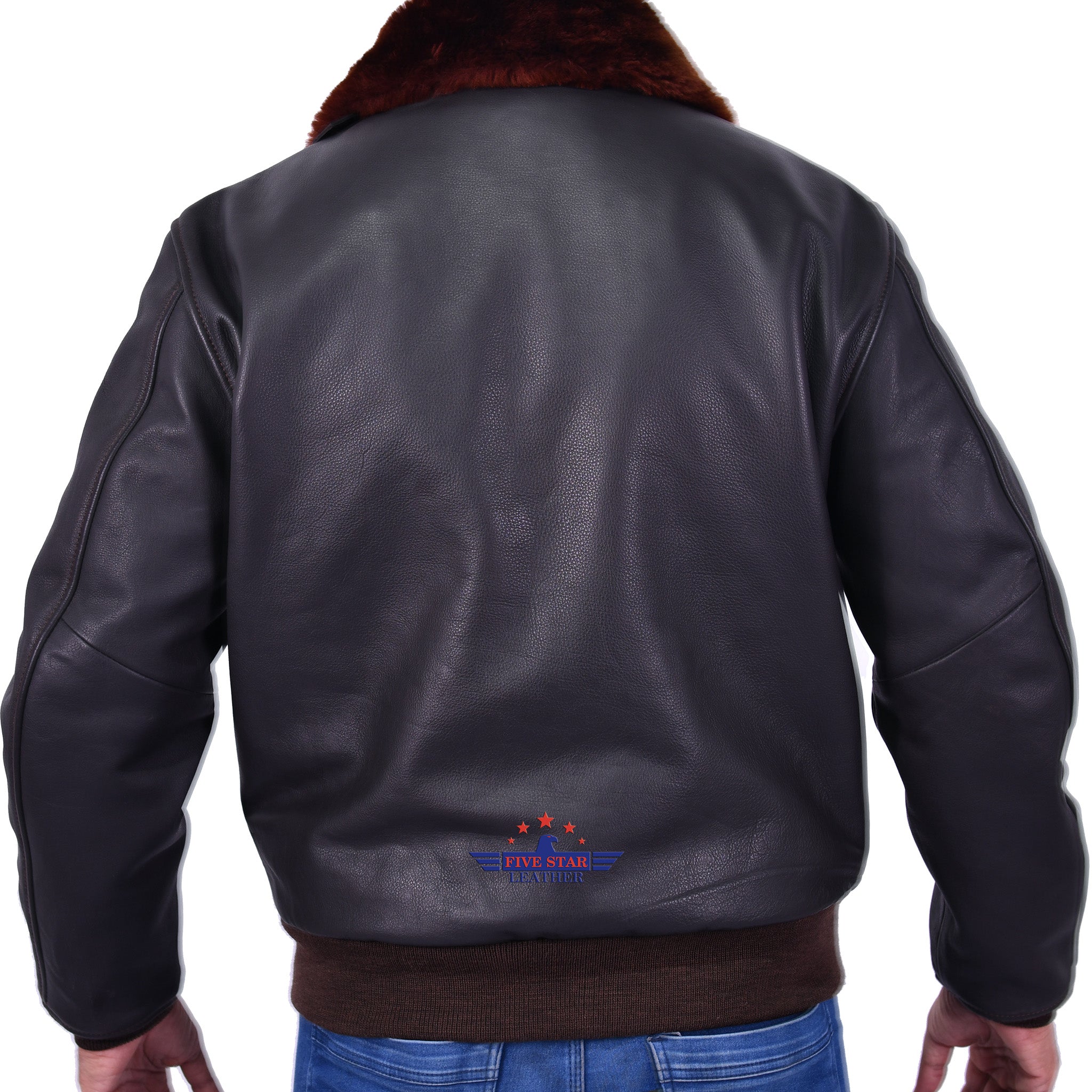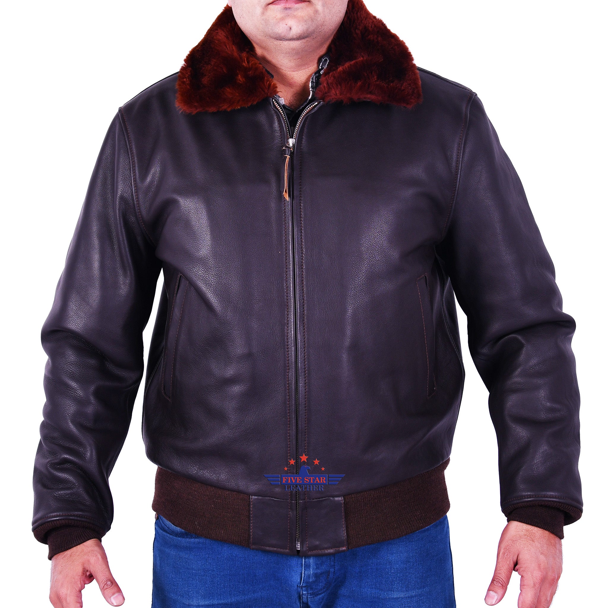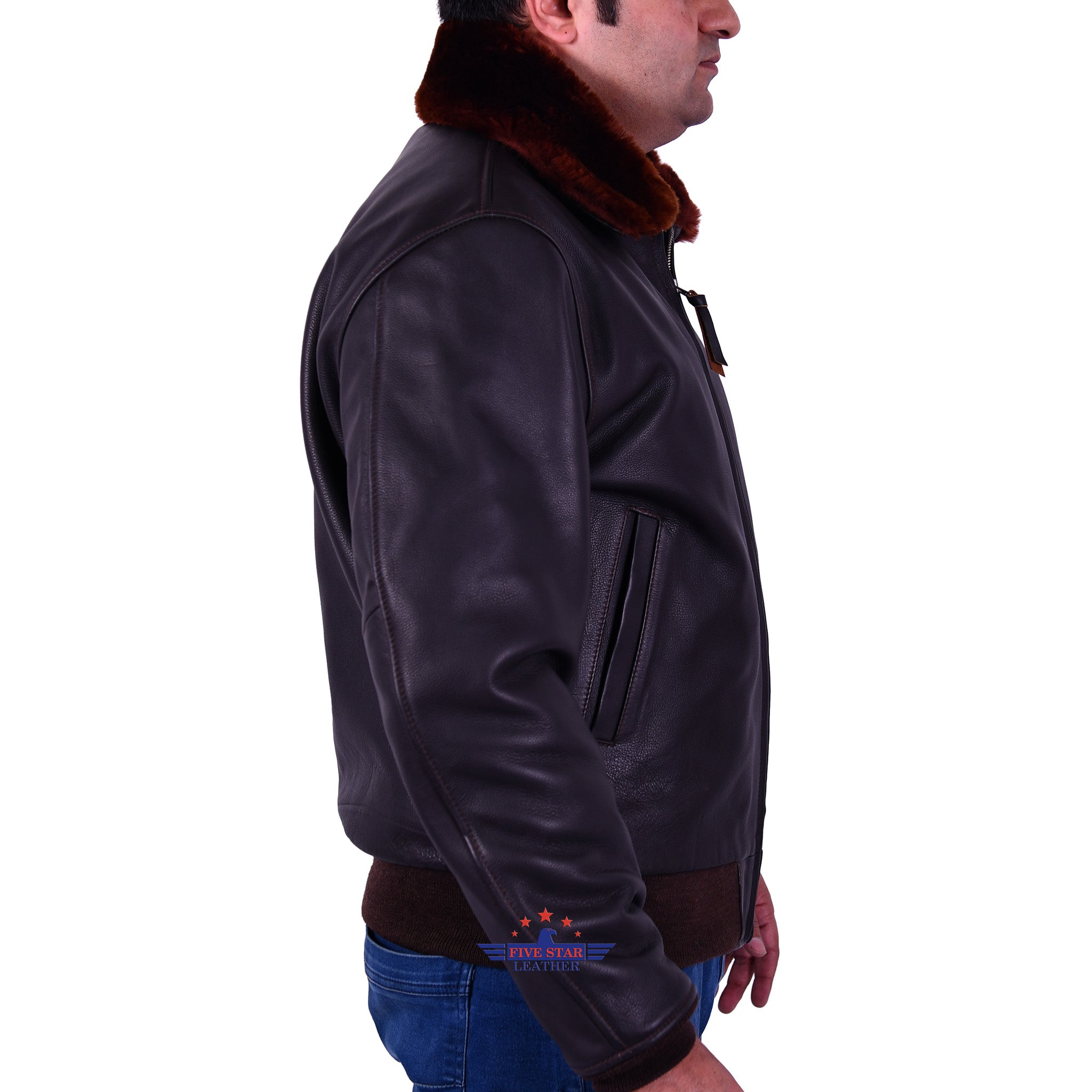 Men Sky King Wind Breaker Jacket Real Steerhide Seal Brown Leather with Mouton Fur Collar