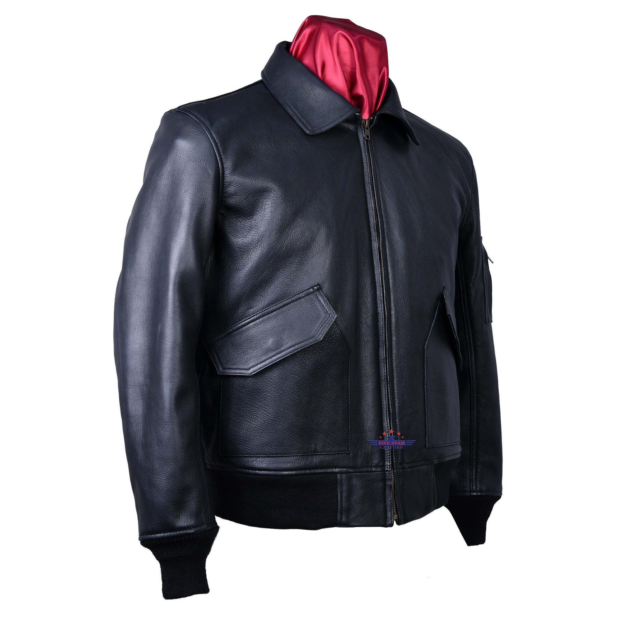 This Flight Pilot Bomber Jacket for men is crafted from premium-grade genuine goatskin leather, ensuring durability and style. Featuring a front zipper, two buttoned flap pockets, and an interior lining pocket, it combines practicality with comfort. The jacket includes soft ribbed cuffs and bottom, a sleeve utility pocket, and a high-quality polyester lining with detailed stitching. Available in all sizes, it provides a perfect fit and lasting wear for aviation enthusiasts and style-conscious individuals alike.