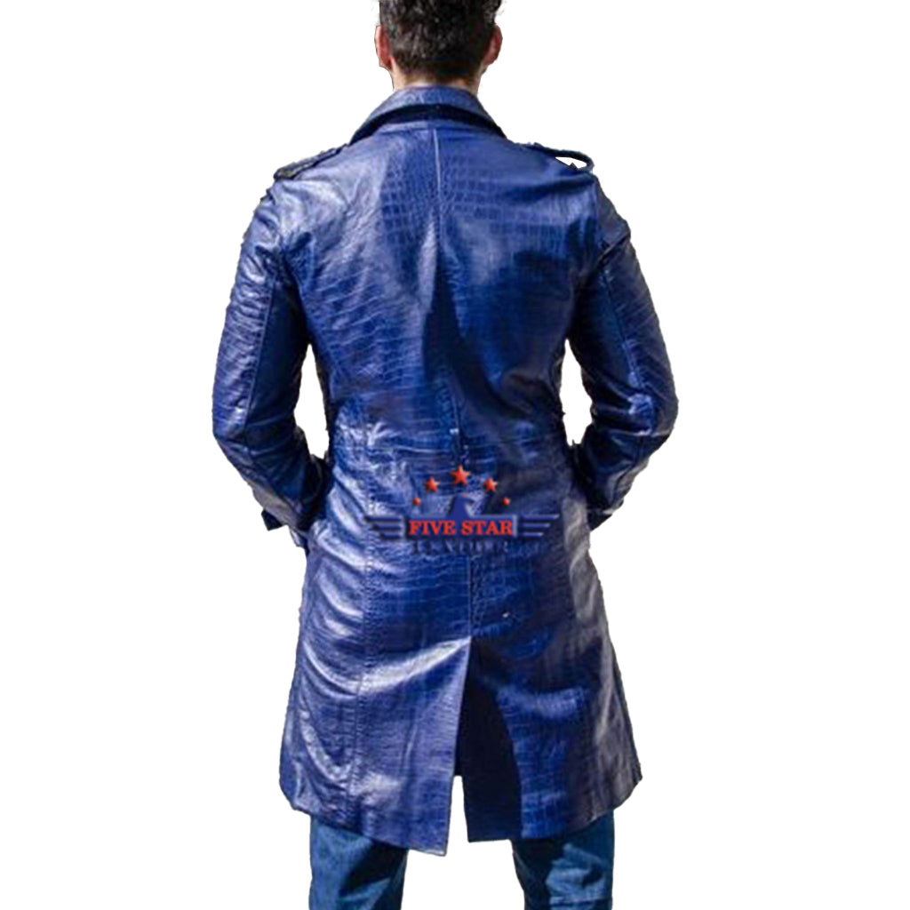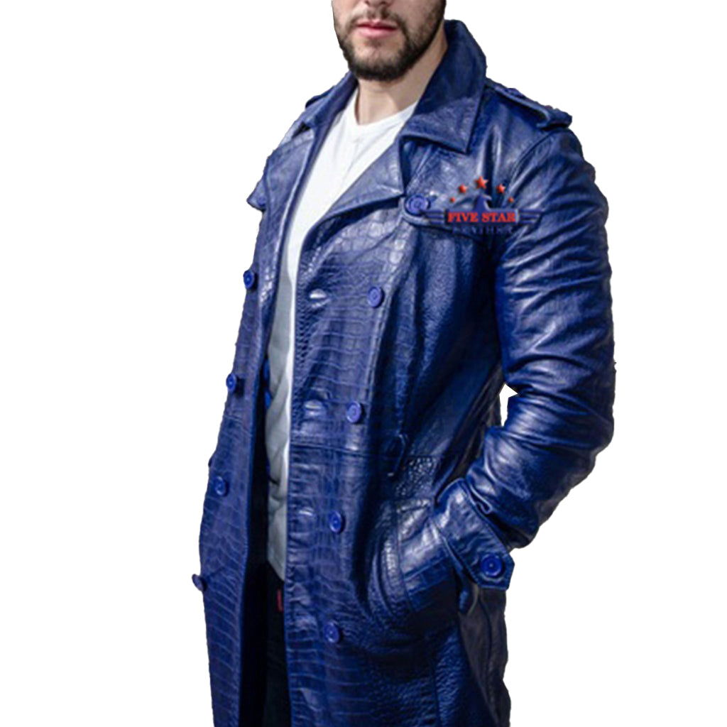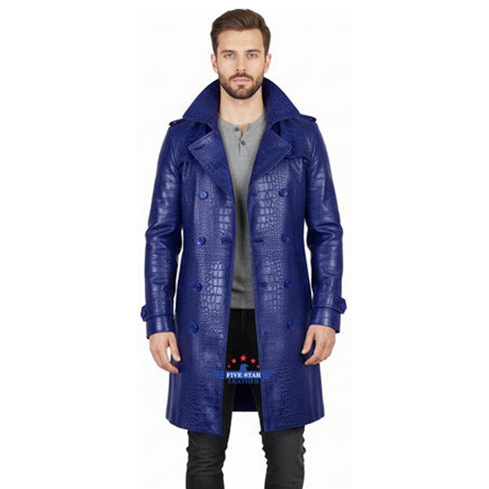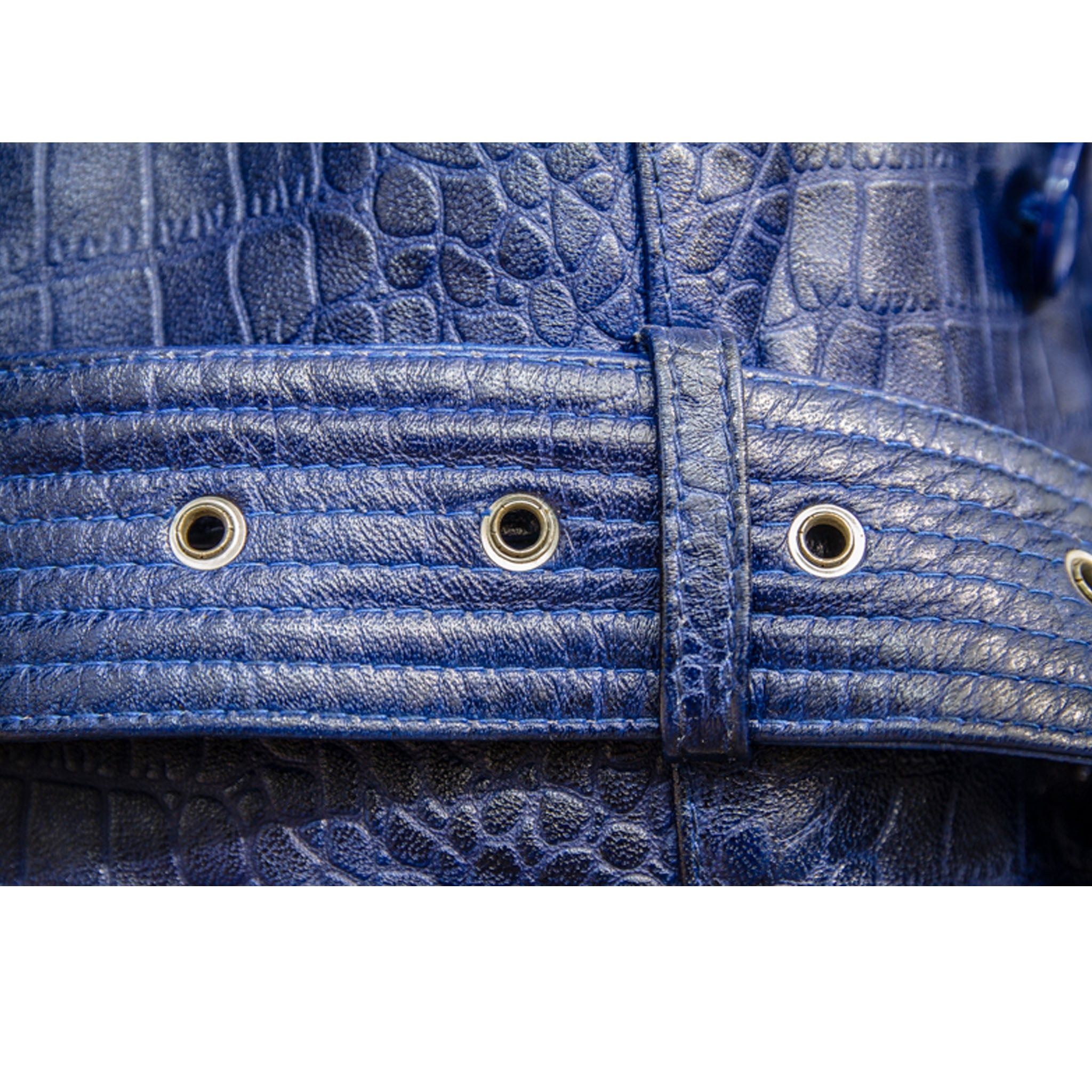 This premium "A" Grade leather jacket is crafted from genuine sheepskin leather with a distinctive croco embossing in royal blue. It features a regular fit, front button closure, two side pockets, and an inside lining pocket for convenience. Handmade with a waxed finish, this coat offers softness, style, and uniqueness. Fully lined with high-quality polyester and finished with precise stitching, it combines durability and comfort. Available in all sizes upon request, with additional styles and colors stocked for your choice.