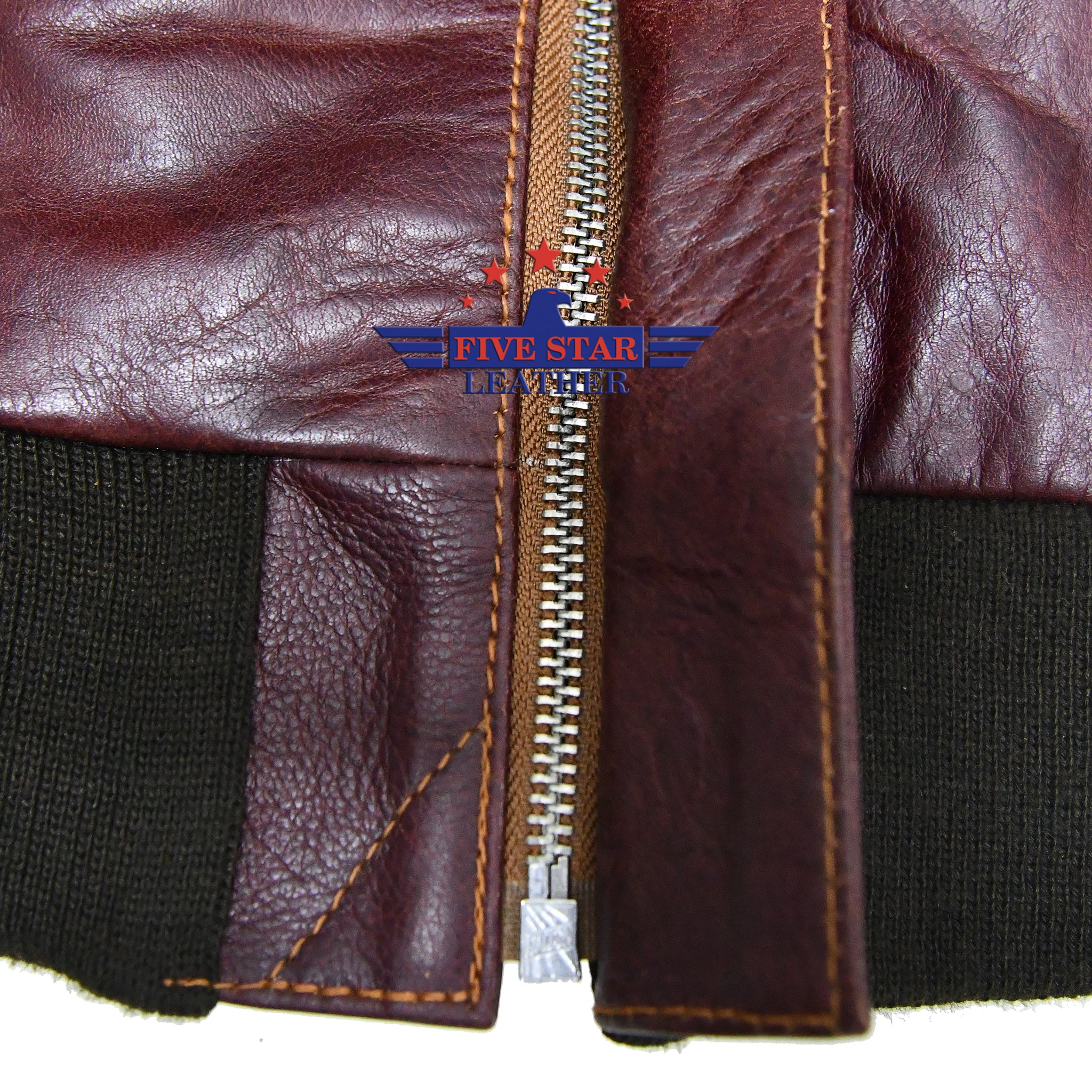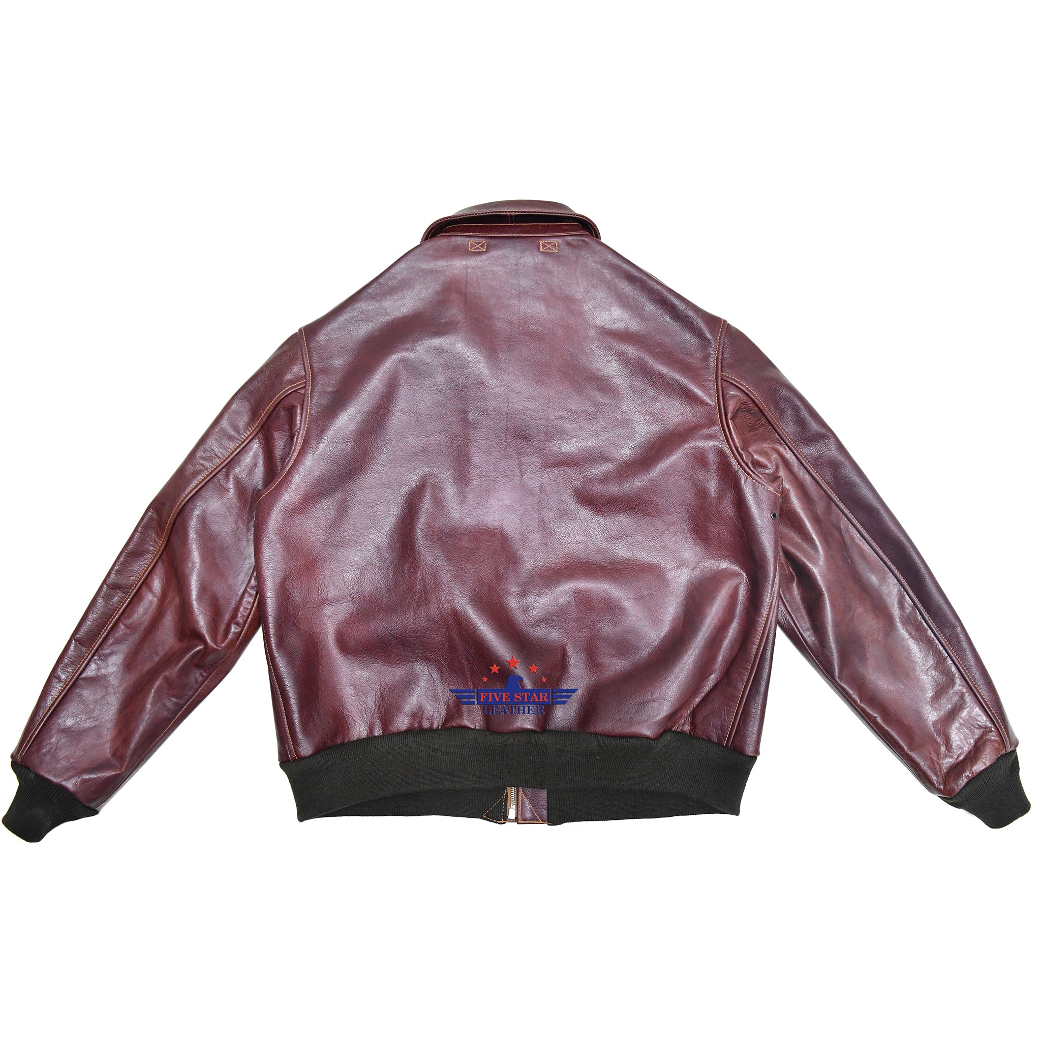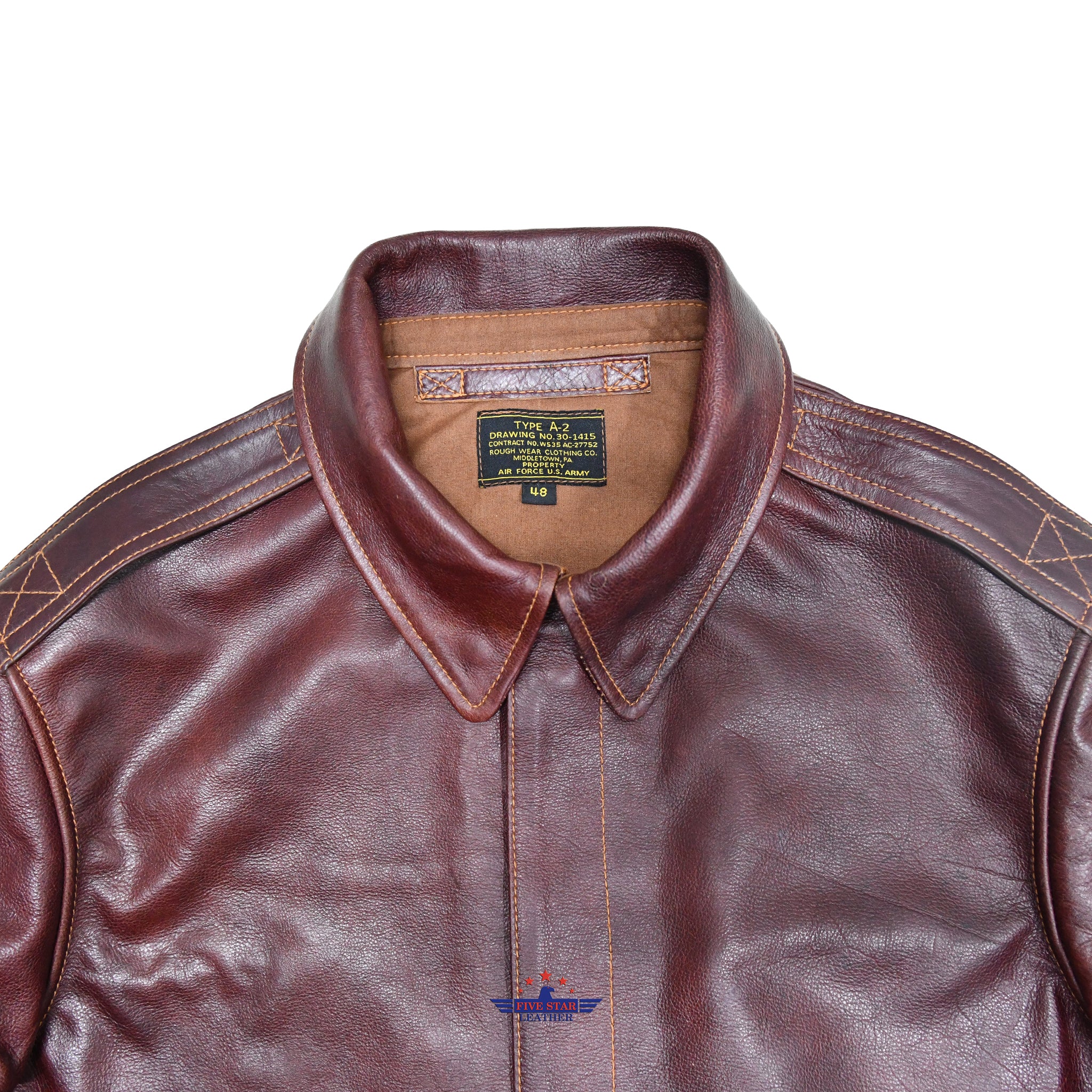 The FiveStar Leather Repro A2 Flight Jacket captures the authentic Rough Wear Clothing Co. design from Middletown, PA. Crafted from our distinct Brandy Horsehide Leather, this semi-vegetable tanned leather measures between 1.2-1.3 mm thick. It features 100% wool knitting in Seal Brown, with other wool colors also available. The jacket includes a classic Repro Talon front zipper and a 100% cotton lining that matches the original contract color. This A2 jacket stays true to the authentic pattern details of the TYPE A-2 ROUGH WEAR CLOTHING CO., Drawing No. 30-1415, Contract No. W535 AC-27752.