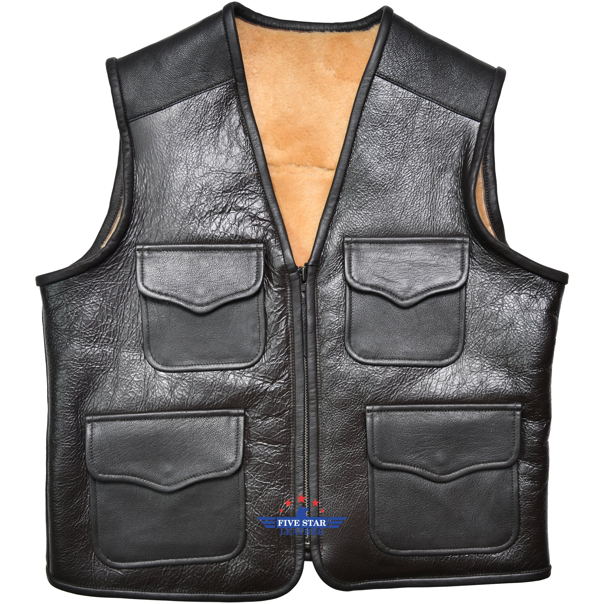 FiveStar Leather Men’s Classic Sportswear Sheepskin Vest Multi Pocket